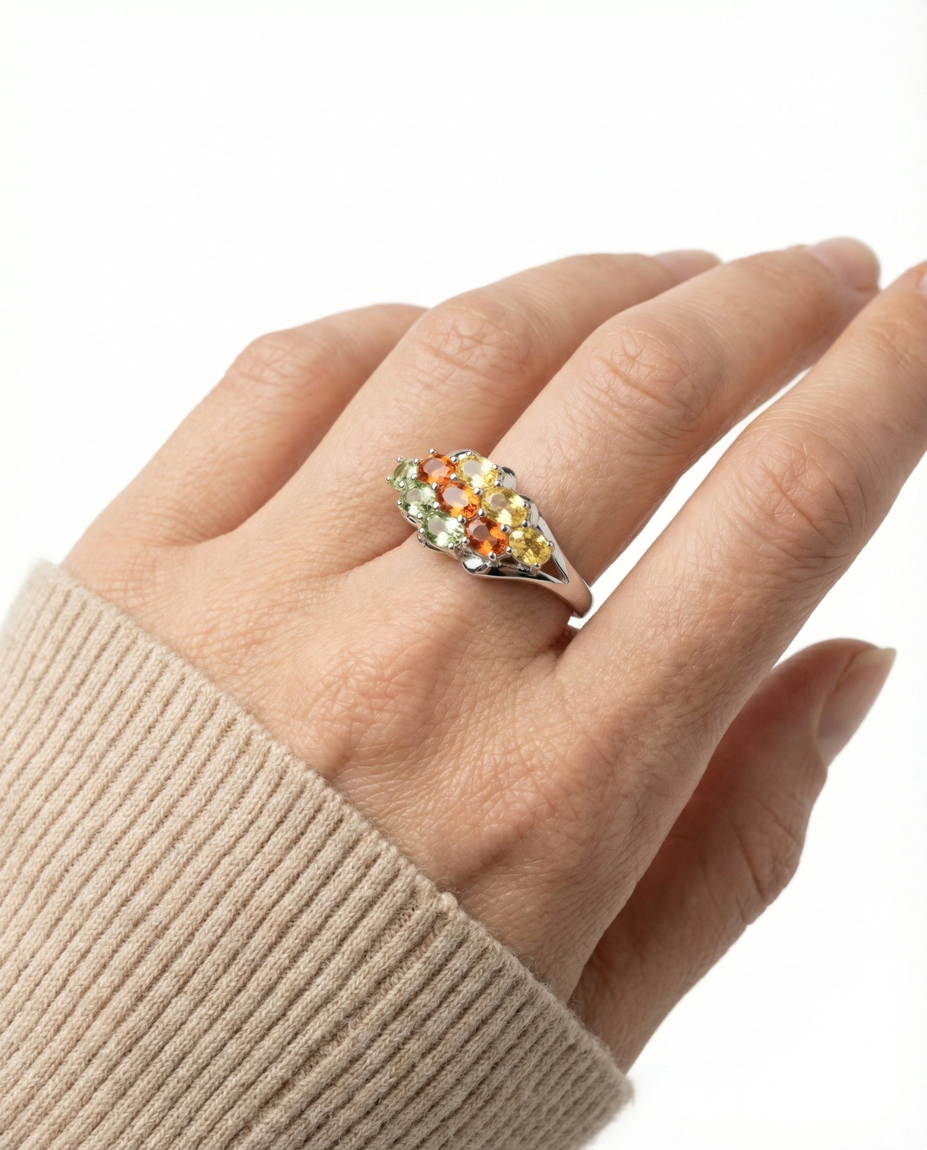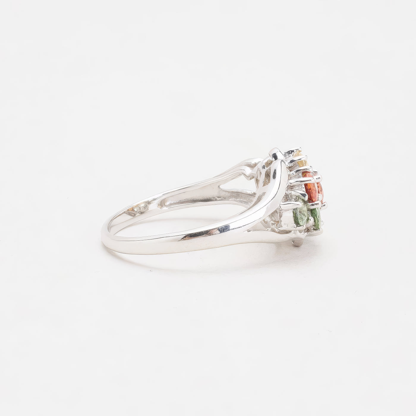 Clusterring i 9K hvidguld med flerfarvede safirer, Str. 57, 3.37 g