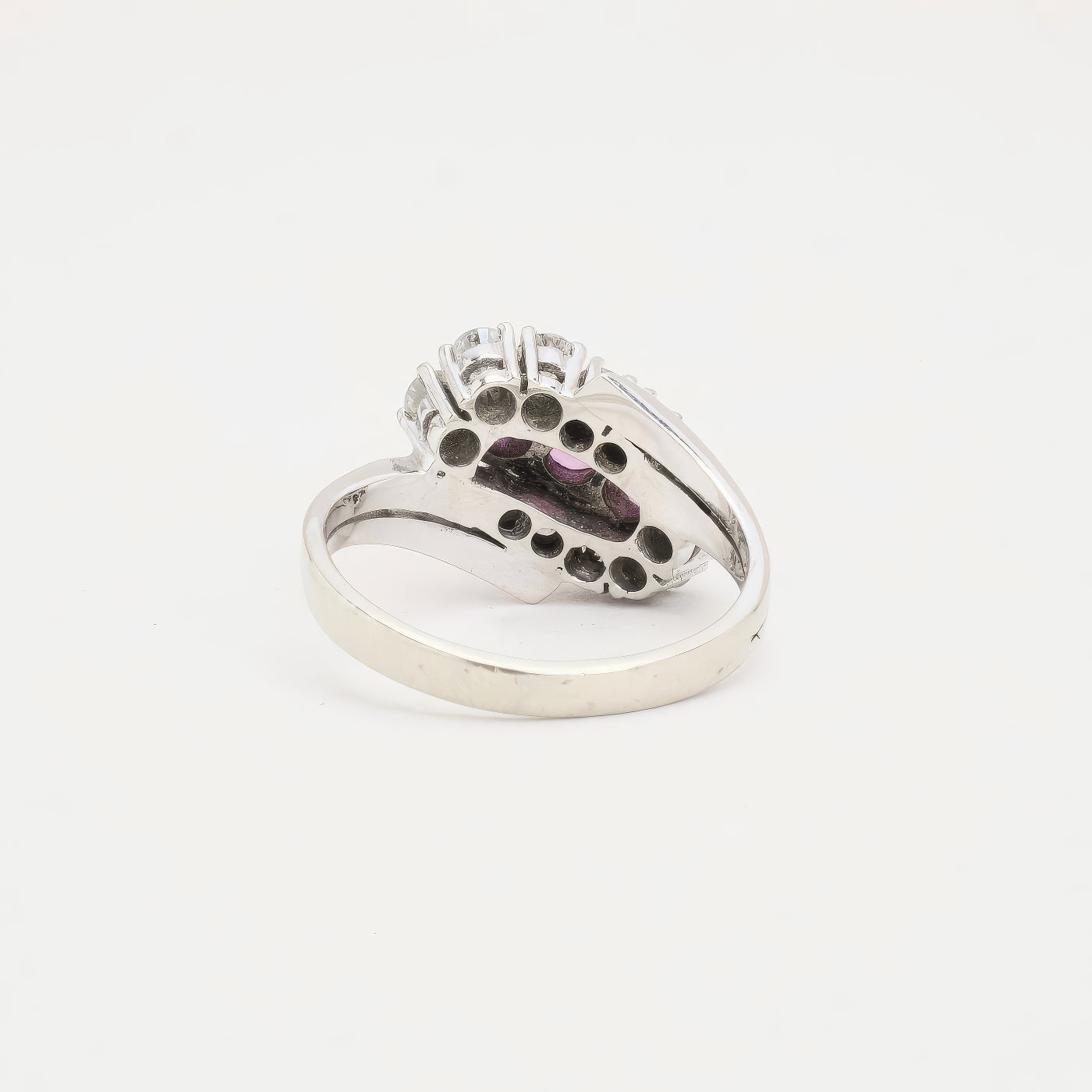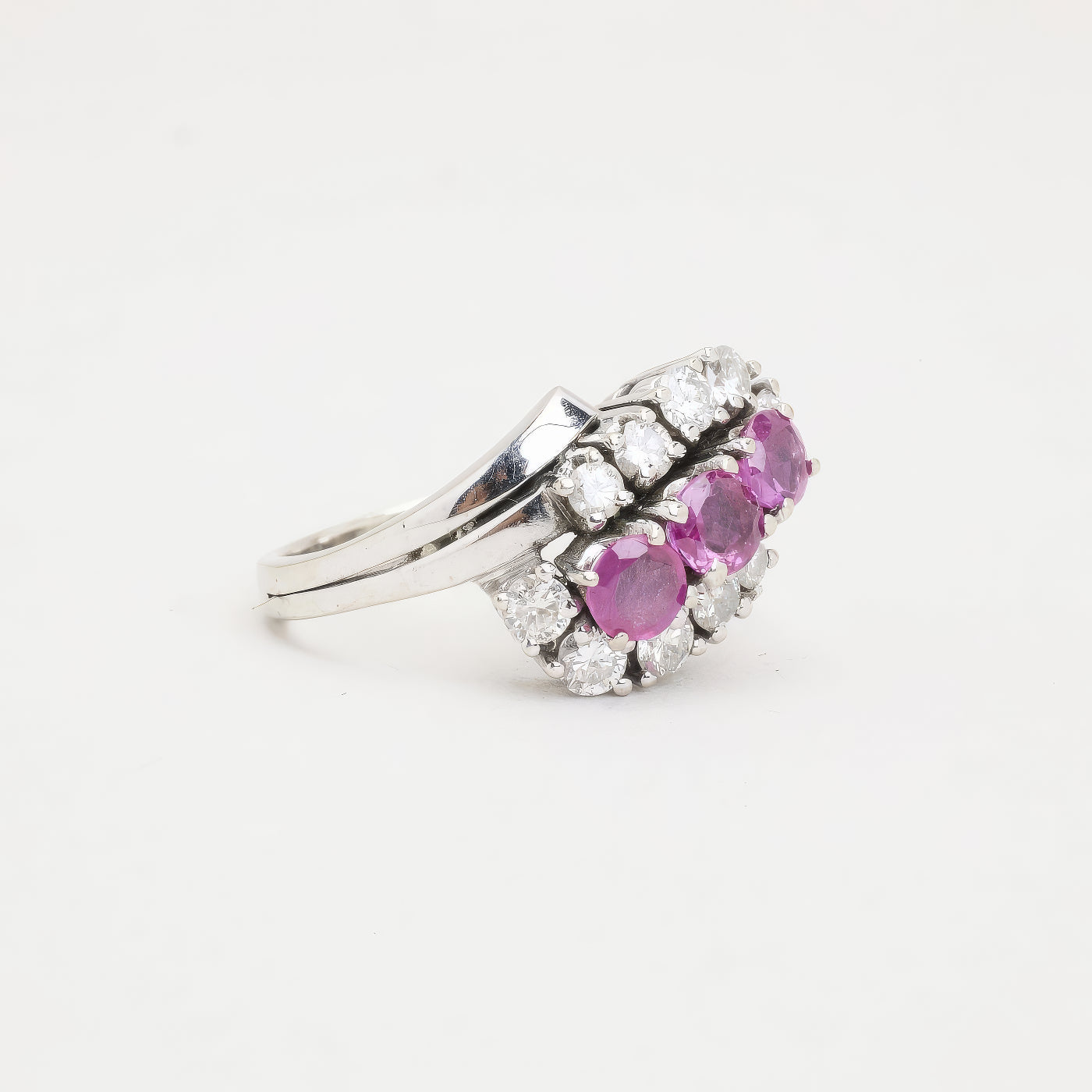 Cluster ring i 14K hvidguld med tre rubiner og diamanter (0,55 ct), Str. 52