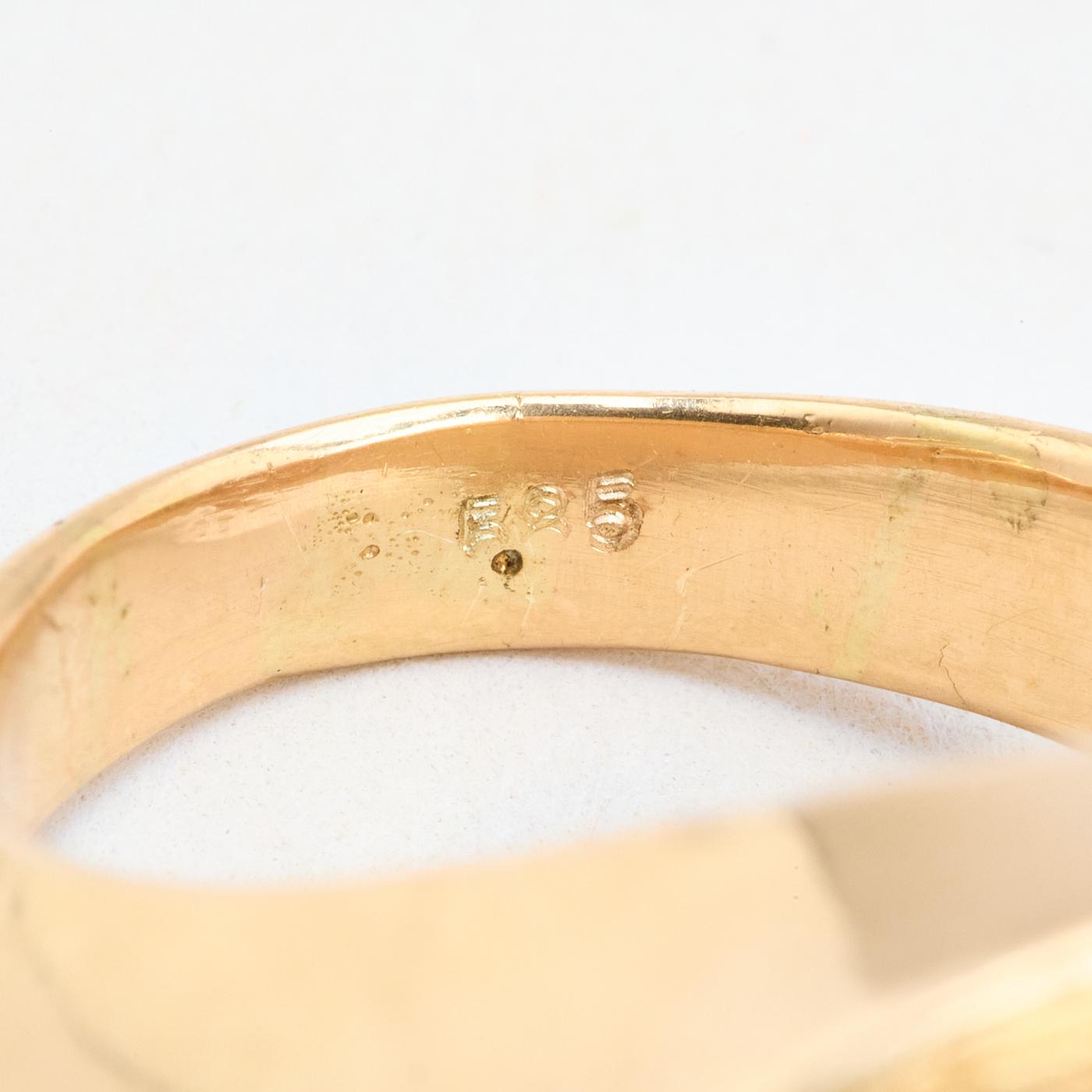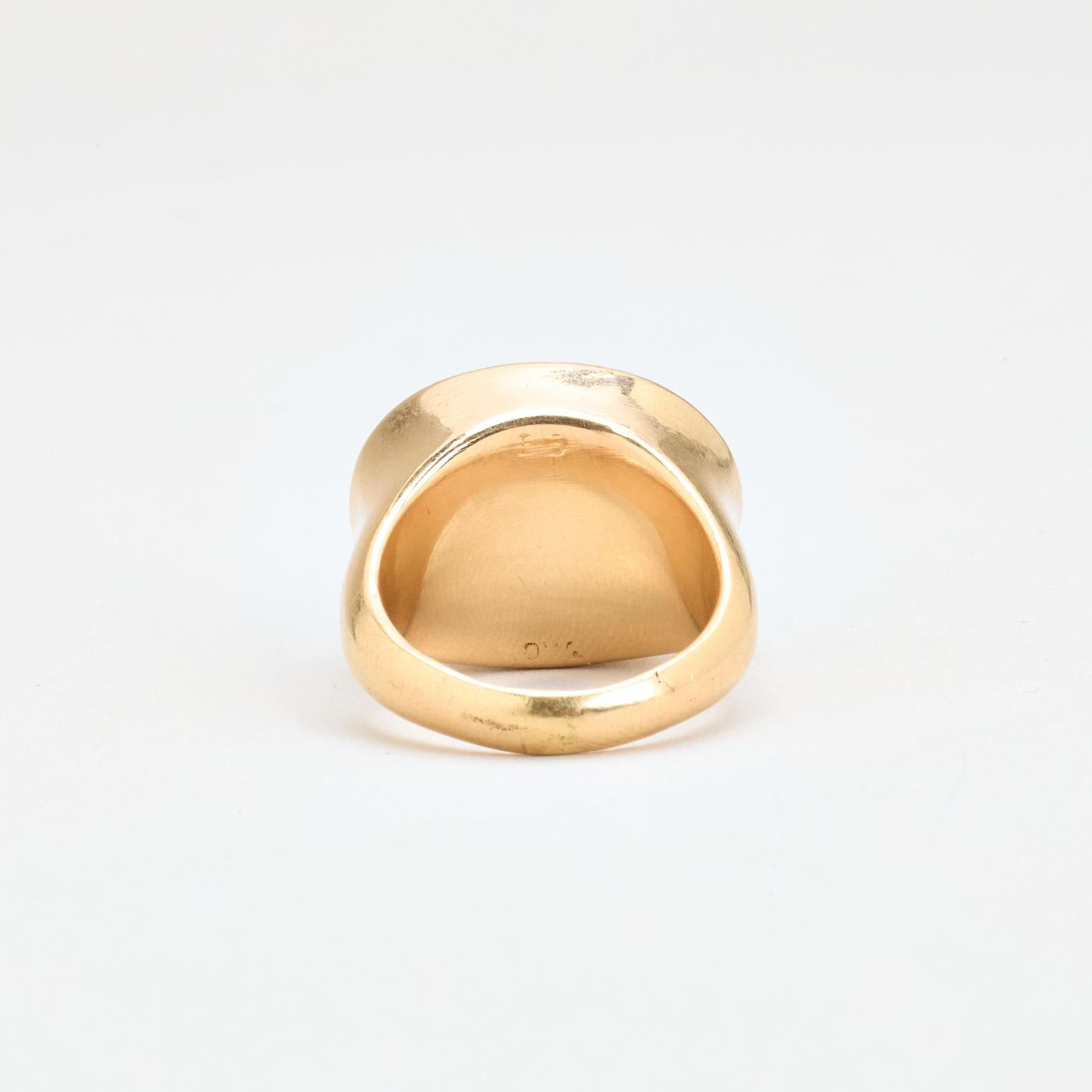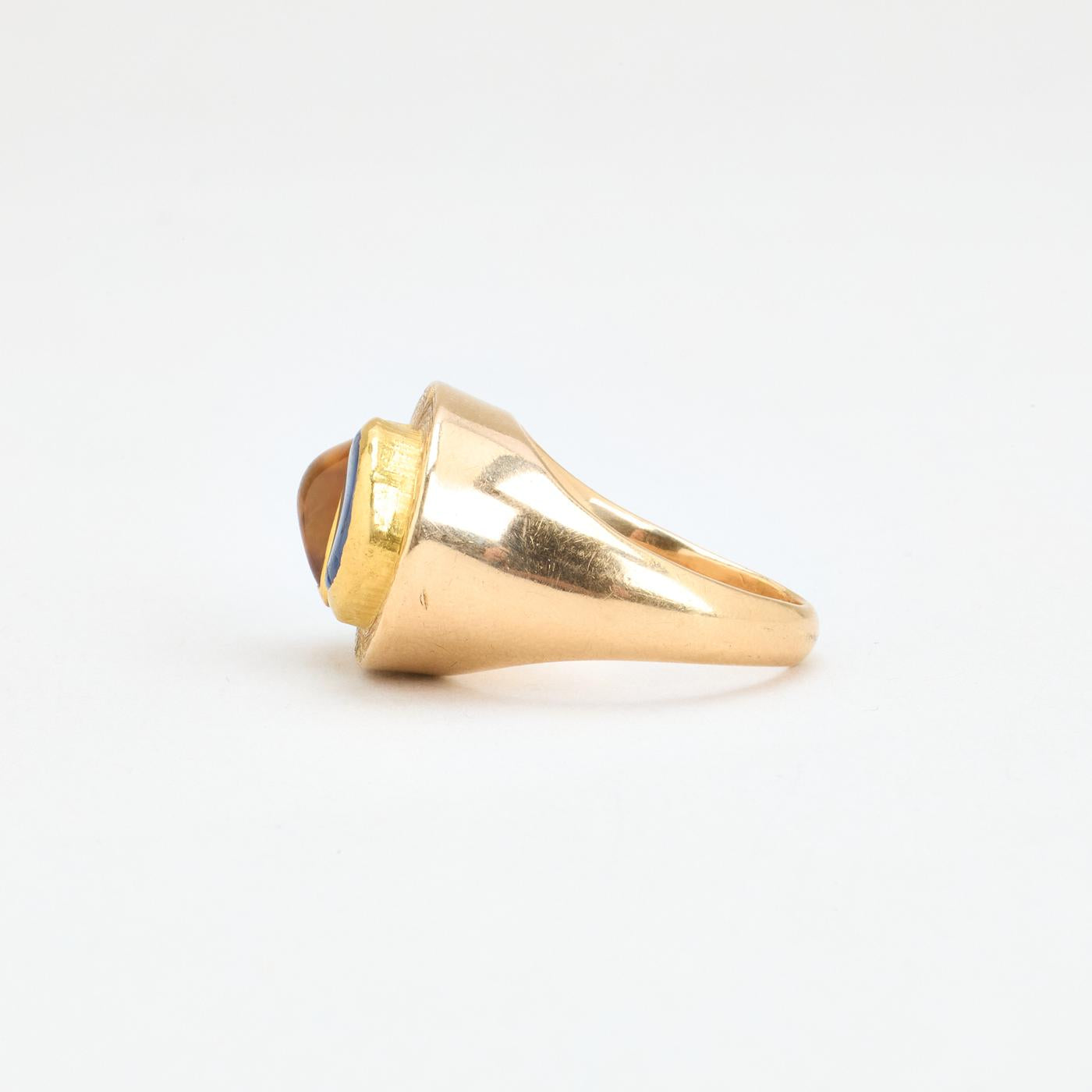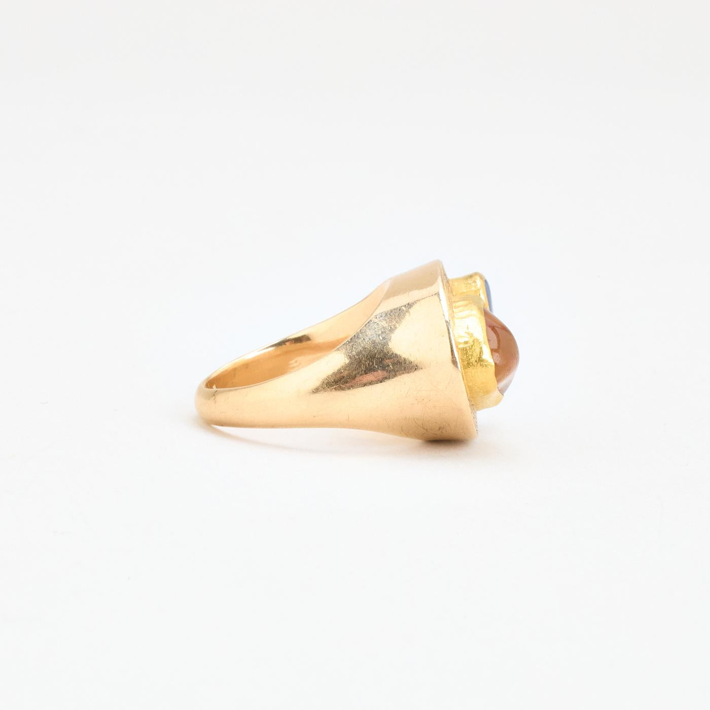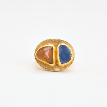 Organisk signetring i 14K guld med blå og brun sten, Str. 53