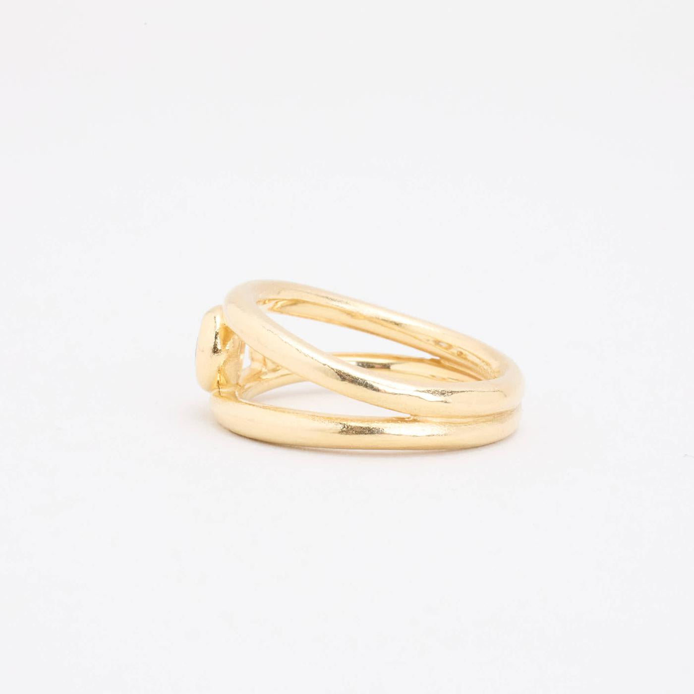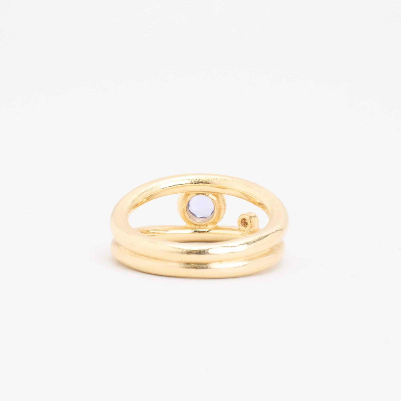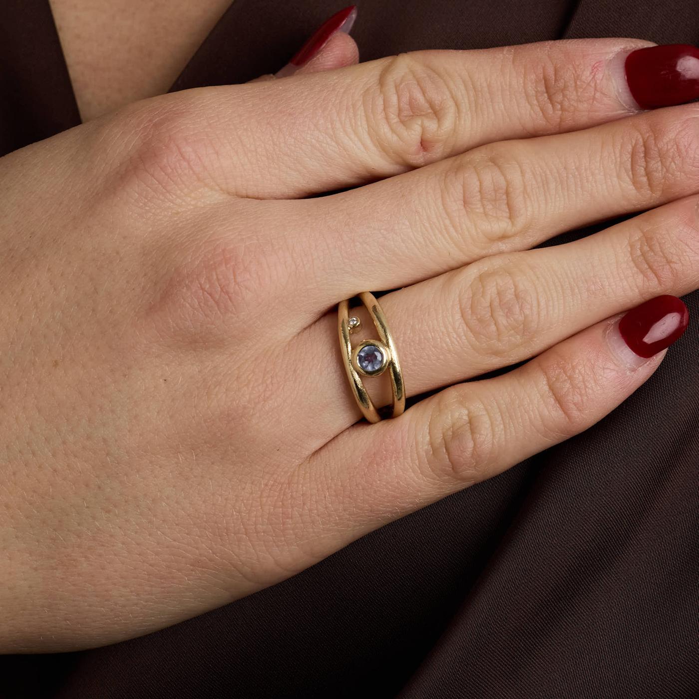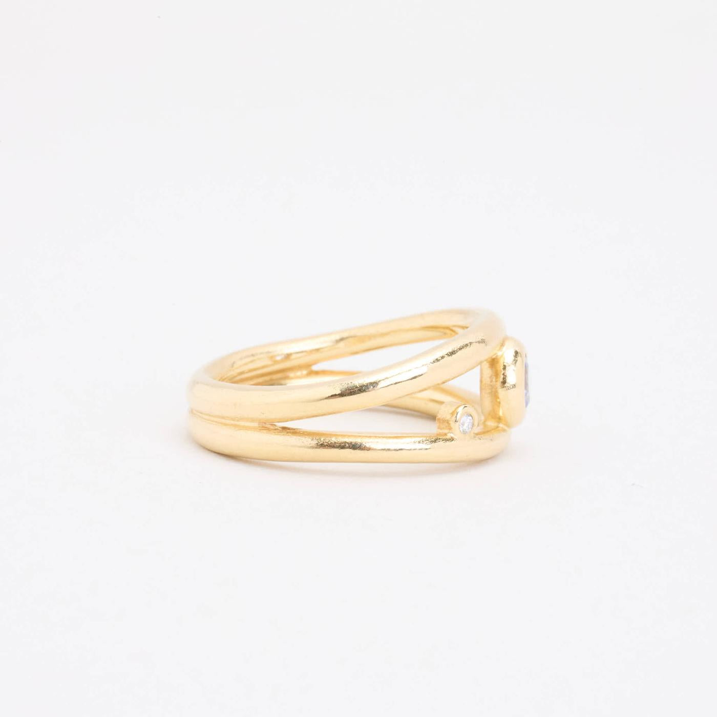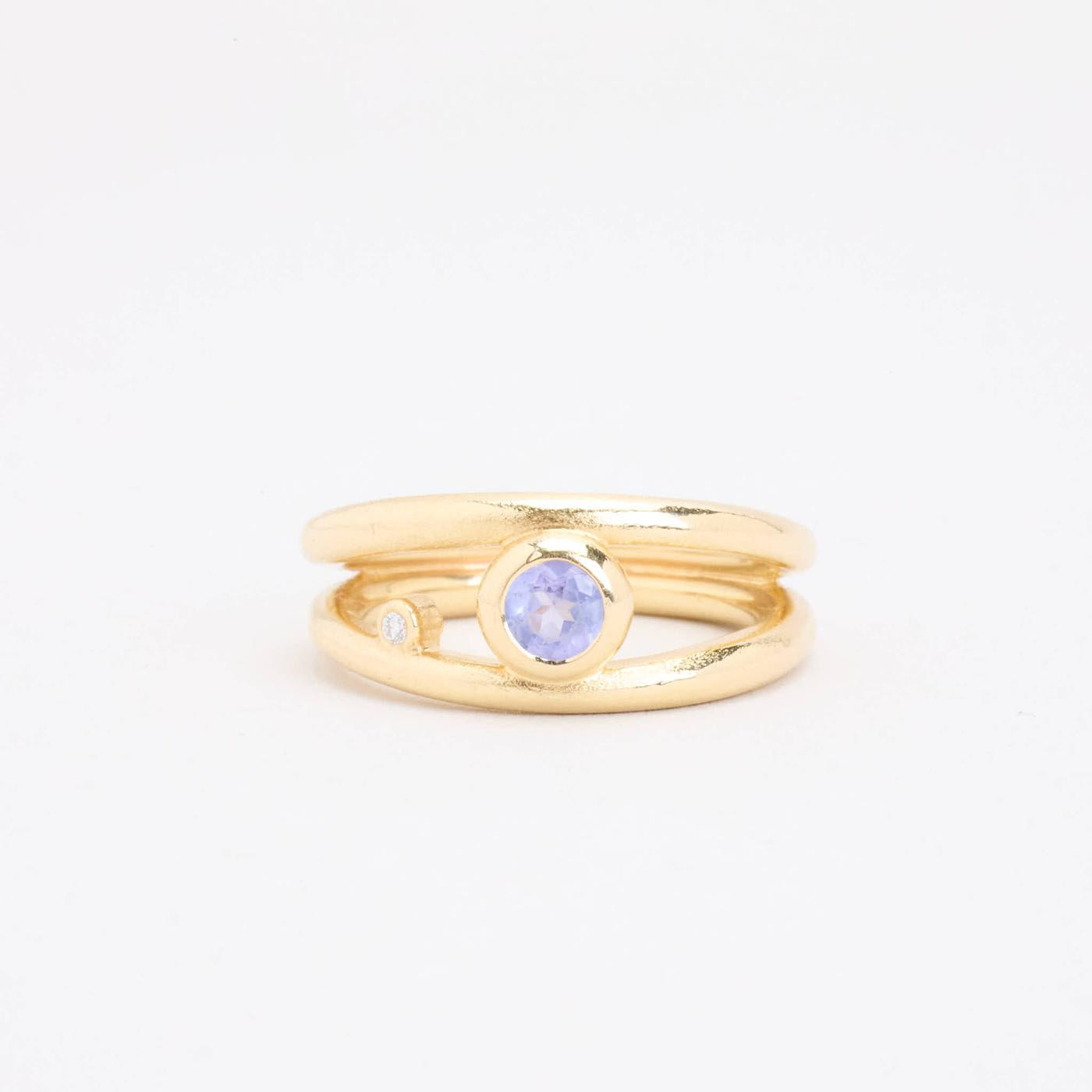 Crossoverring i 14K guld med en diamant (0.01 ct) og en tanzanit, Str. 53