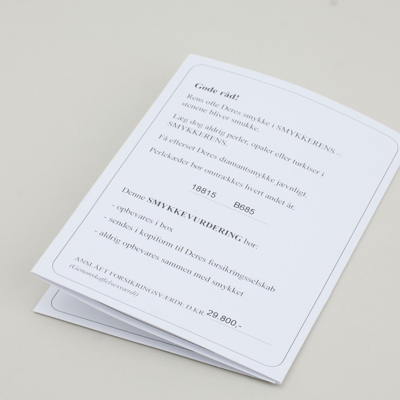 Diamanter: 1.90 ct. totalt fordelt på 21 naturlige diamanter. og 18 x 0.07 ct. Farve Wesselton. Klarhed P og 1 x 0.5 ct. og 2 x 0.07 ct. Farve Wesselton. Klarhed SI