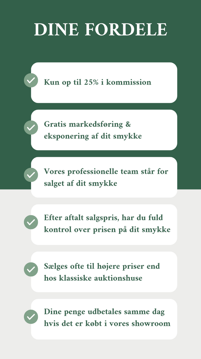 Når du sælger dine smykker, giver du dem ikke blot videre som genstande, men også chancen for en ny historie og værdsættelse hos en ny ejer, hvilket giver dem nyt liv og mening. Ved at sælge dine smykker gennem kommission hos os, vil du opnå større synlighed, der øger chancen for salg. Med ingen skjulte omkostninger, adgang til vores dedikerede salgsteam og etablerede kundebase, får dine smykker den eksponering, de fortjener.
