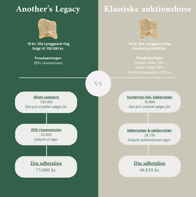 Ved at sælge dine smykker gennem kommission hos Another’s Legacy får du en række fordele, som du måske ikke vil opleve gennem salg ved traditionelle auktionshuse. Vi opkræver kun et kommissionsgebyr på højst 25%, uden skjulte omkostninger.