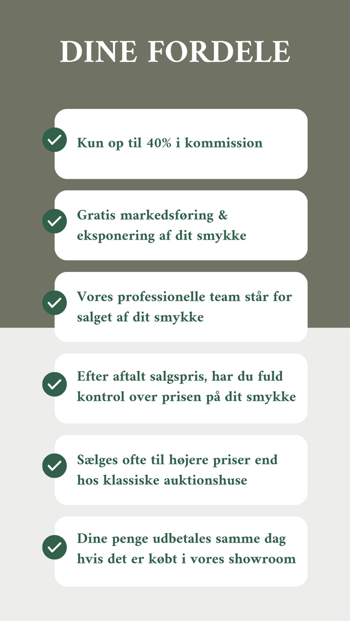 Når du sælger dine smykker, giver du dem ikke blot videre som genstande, men også chancen for en ny historie og værdsættelse hos en ny ejer, hvilket giver dem nyt liv og mening. Ved at sælge dine smykker gennem kommission hos os, vil du opnå større synlighed, der øger chancen for salg. Med ingen skjulte omkostninger, adgang til vores dedikerede salgsteam og etablerede kundebase, får dine smykker den eksponering, de fortjener.
