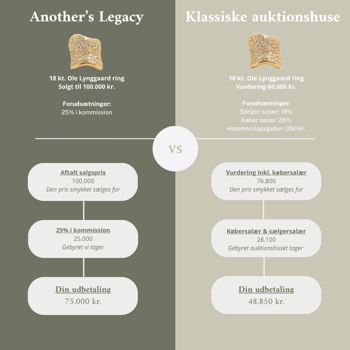 Ved at sælge dine smykker gennem kommission hos Another’s Legacy får du en række fordele, som du måske ikke vil opleve gennem salg ved traditionelle auktionshuse. Vi opkræver kun et kommissionsgebyr på højst 40%, uden skjulte omkostninger.