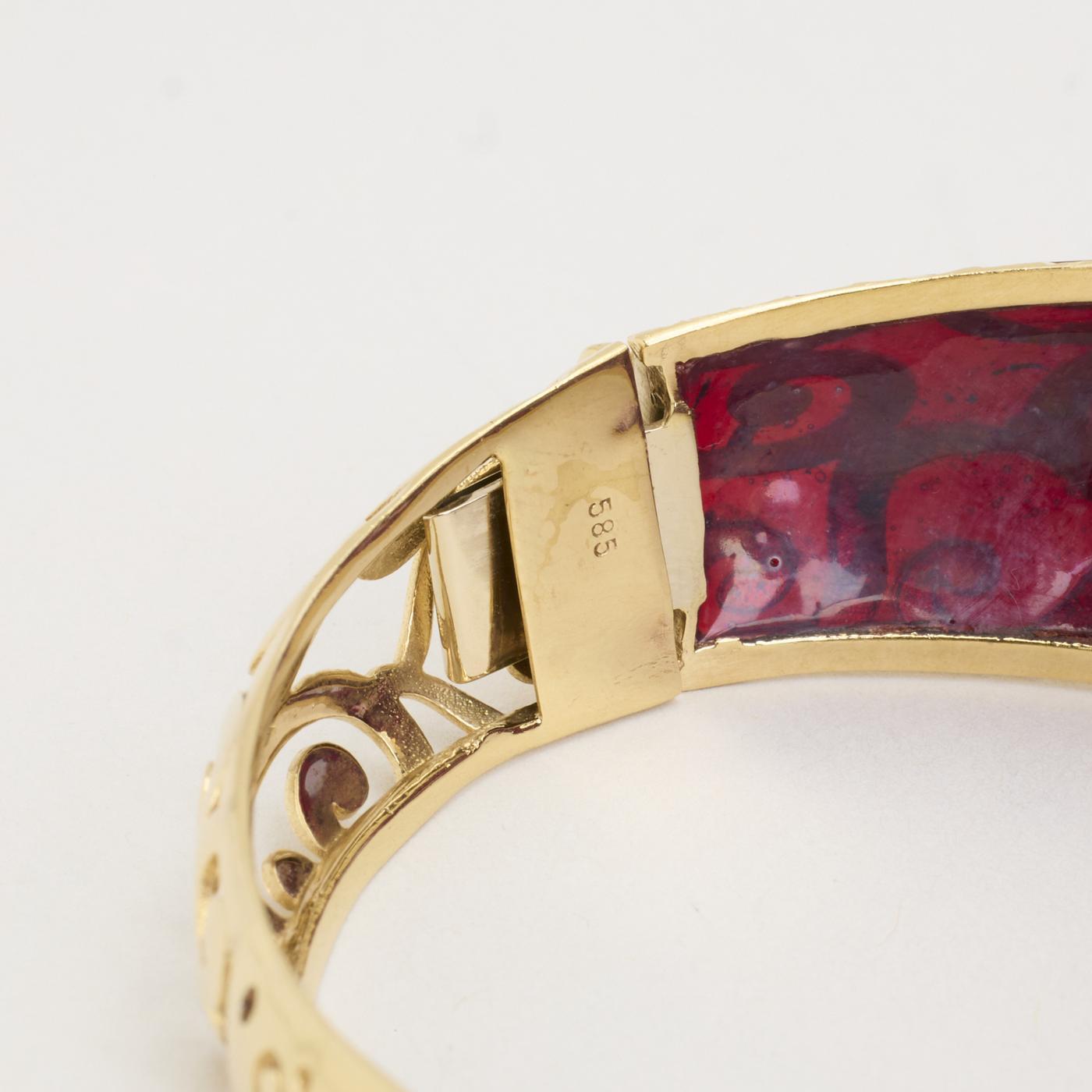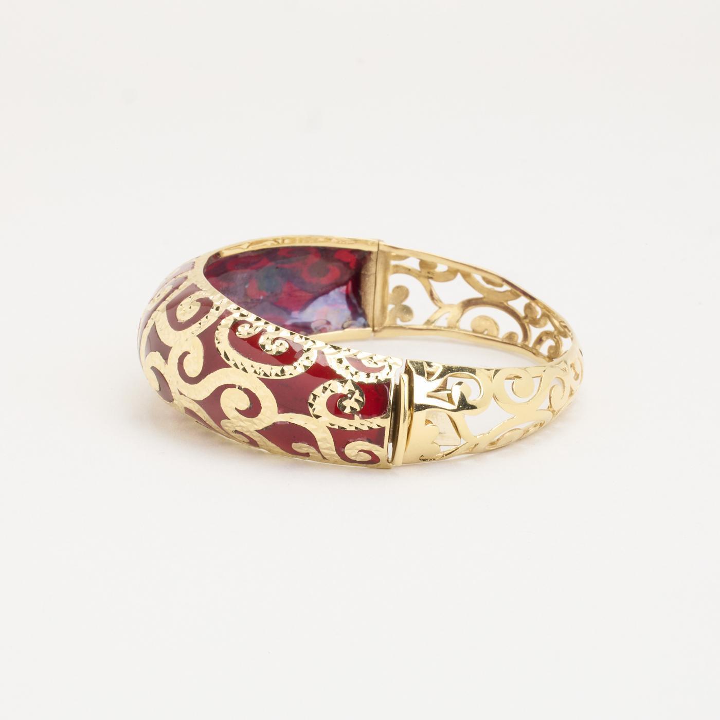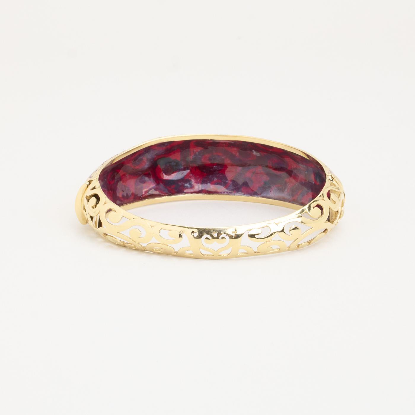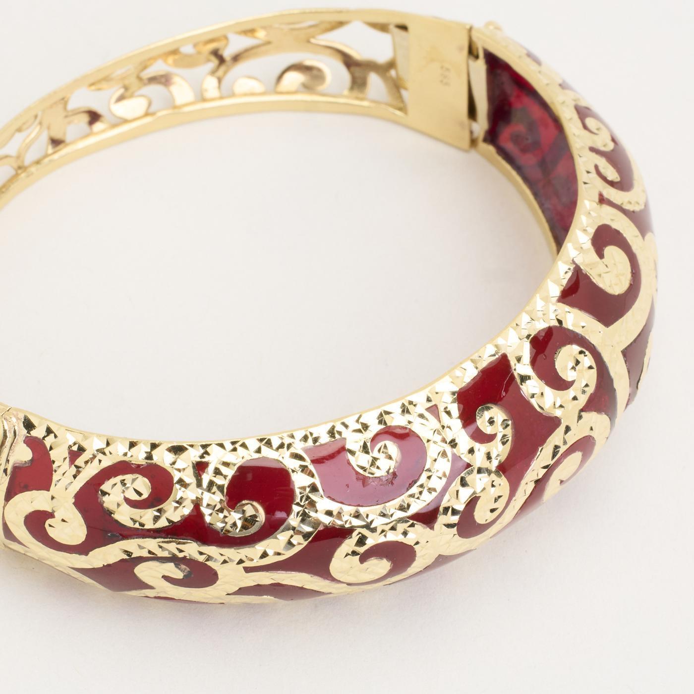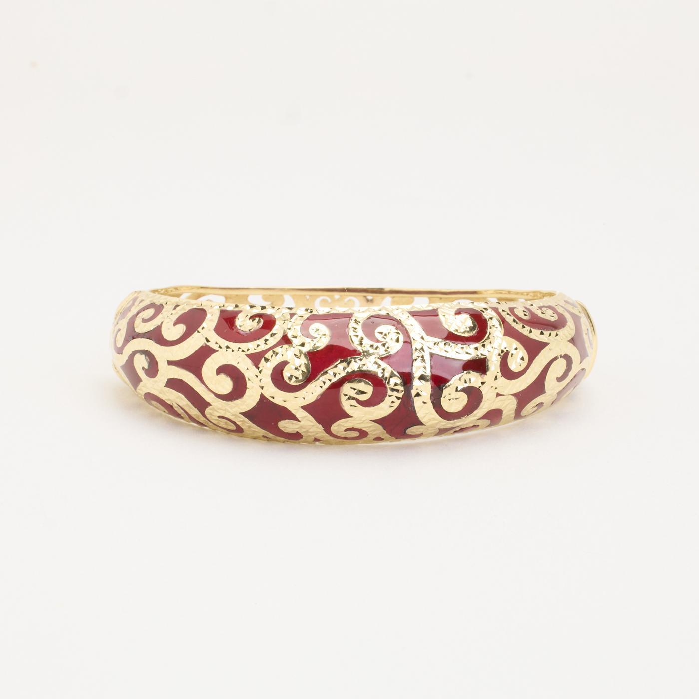 Armring i 14K guld med rødt emalje og forhøjet guldskrollearbejde, 6 cm i diameter
