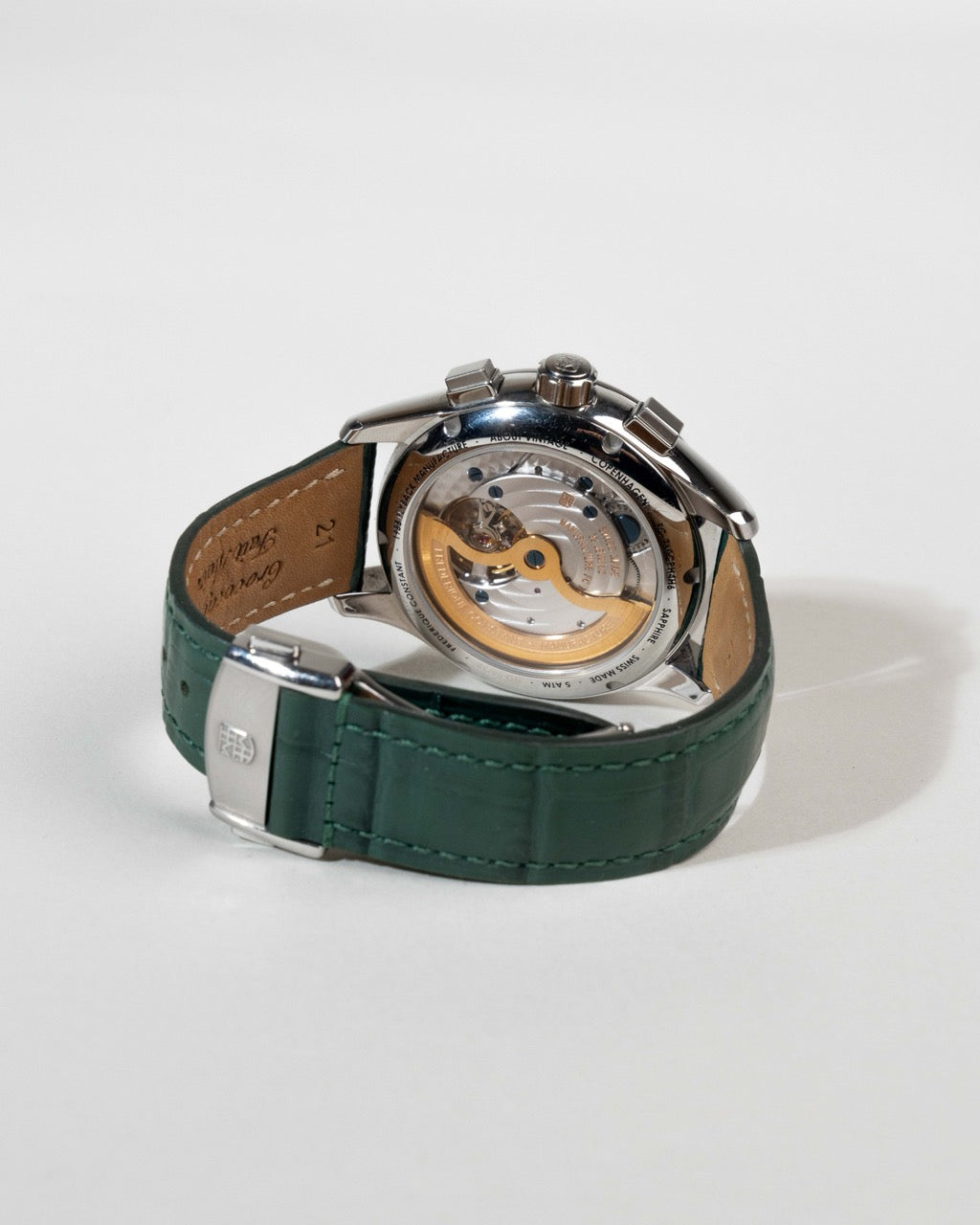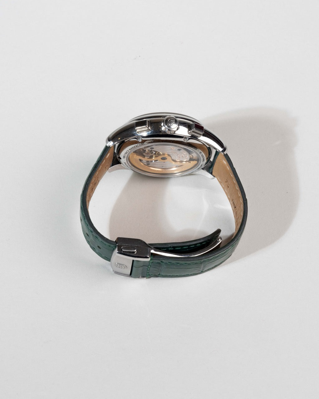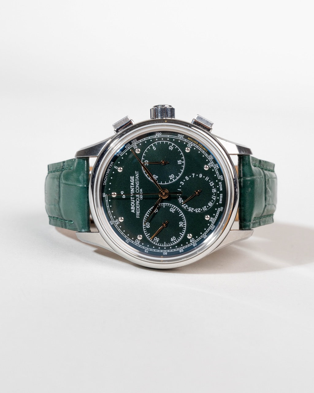 En eksklusiv samarbejdsmodel mellem About Vintage og Frederique Constant, hvor dansk design møder schweizisk urhåndværk. Uret har en dyb grøn sunburst-skive med tre harmonisk placerede subdials og en elegant tachymeterskala. Indeni tikker Frederique Constants Manufacture-værk med flyback-kronograf, en avanceret komplikation, som sjældent ses i denne prisklasse. Den polerede stålkasse kombineret med den matchende grønne læderrem giver et sofistikeret og moderne udtryk. En eftertragtet limited edition, der forener eksklusivitet, mekanisk finesse og tidløs stil.