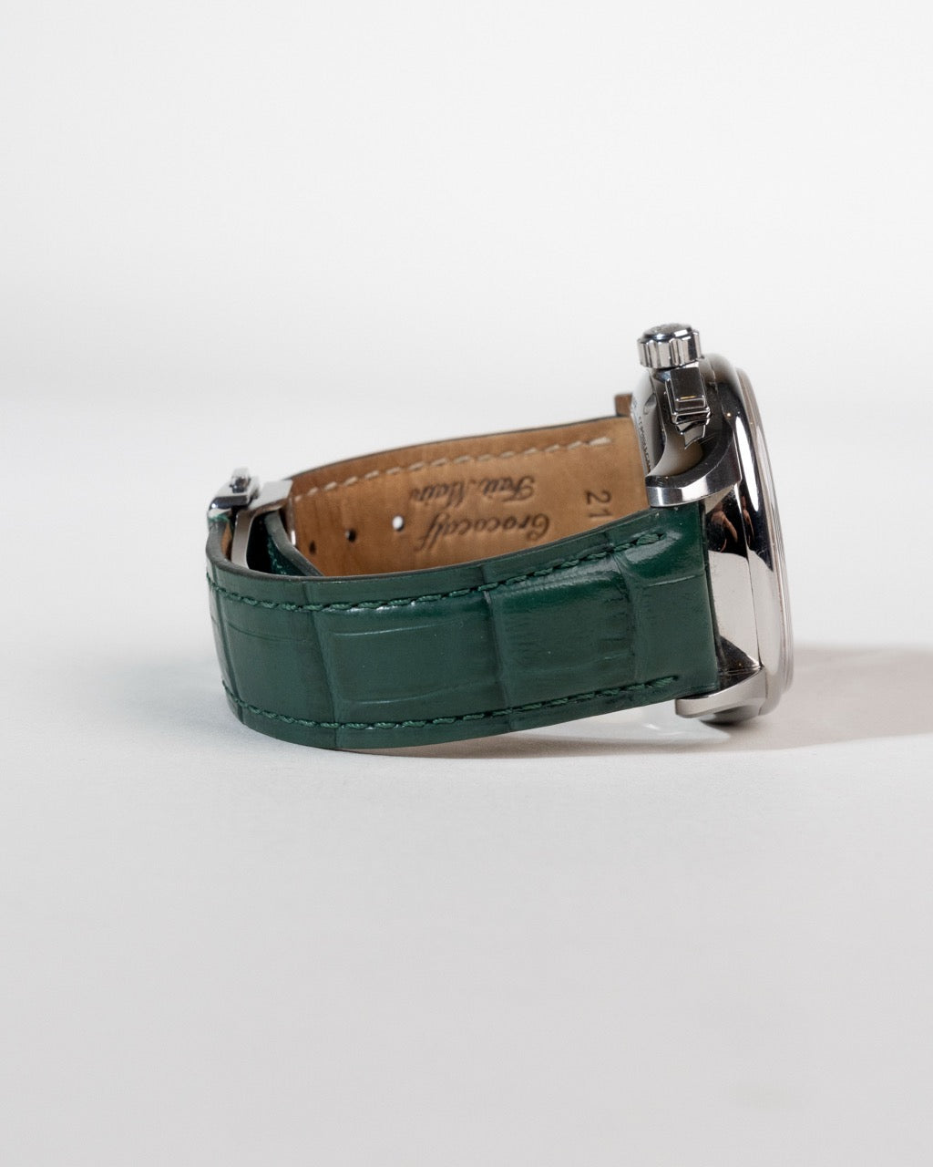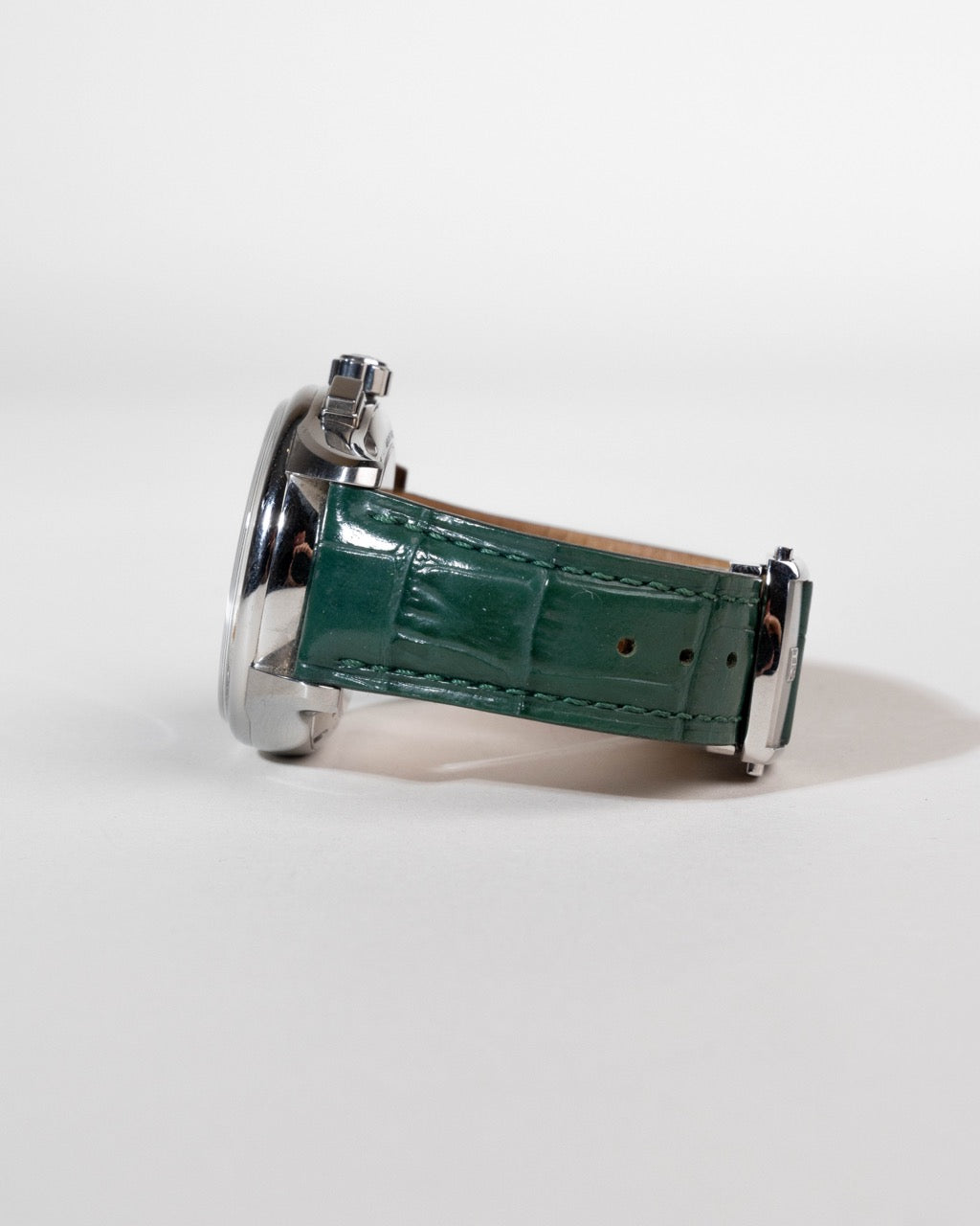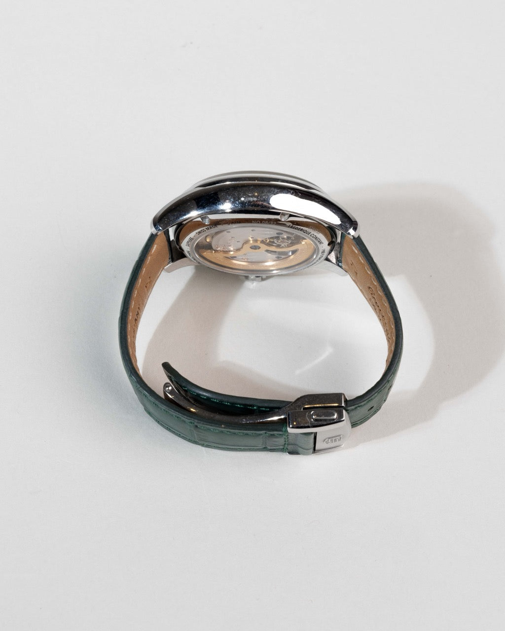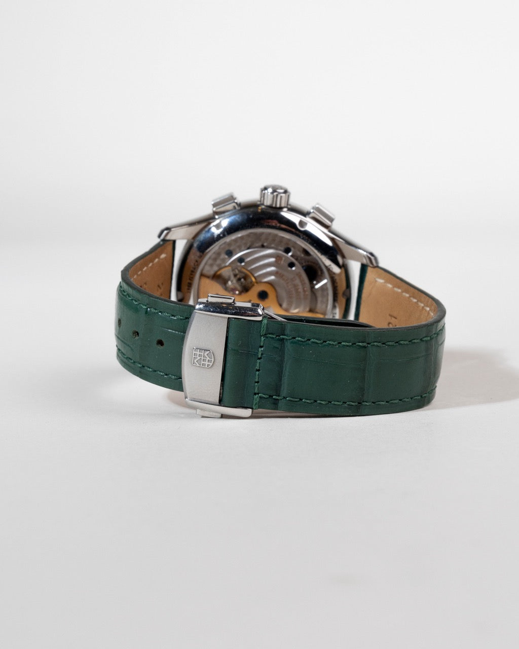En eksklusiv samarbejdsmodel mellem About Vintage og Frederique Constant, hvor dansk design møder schweizisk urhåndværk. Uret har en dyb grøn sunburst-skive med tre harmonisk placerede subdials og en elegant tachymeterskala. Indeni tikker Frederique Constants Manufacture-værk med flyback-kronograf, en avanceret komplikation, som sjældent ses i denne prisklasse. Den polerede stålkasse kombineret med den matchende grønne læderrem giver et sofistikeret og moderne udtryk. En eftertragtet limited edition, der forener eksklusivitet, mekanisk finesse og tidløs stil.