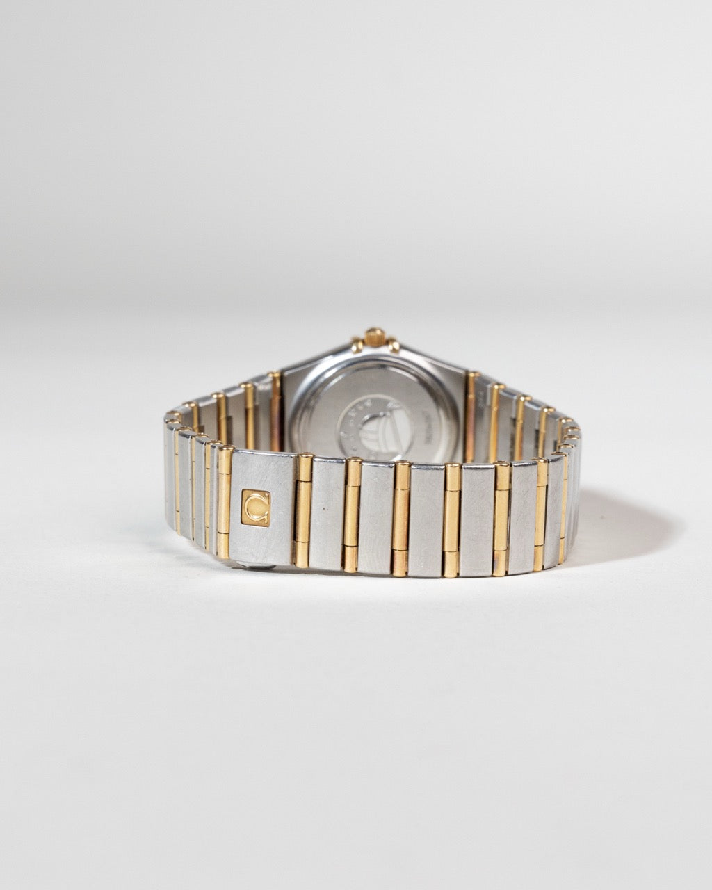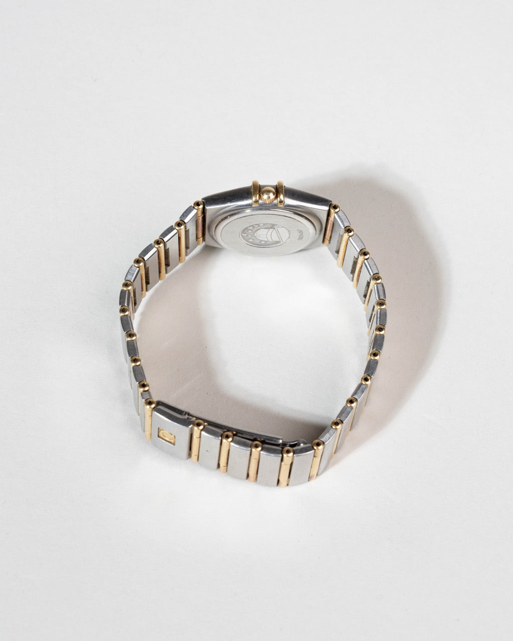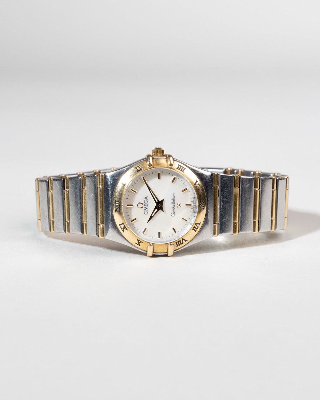 En smuk og feminin Omega Constellation i stål og 18 kt gulddoublé, med den ikoniske designlinje kendetegnet ved “claws”-kassen og romertalbezelen. Modellen har en perlemorskive, der giver et eksklusivt spil i lyset, kombineret med guldtone-visere og timemarkeringer for et elegant og raffineret udtryk. Den integrerede Constellation-lænke sikrer høj komfort og et harmonisk look. Et tidløst og stilrent Omega-ur, perfekt til daglig luksus.