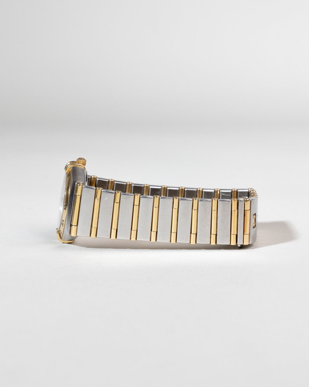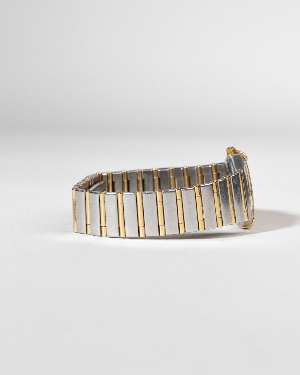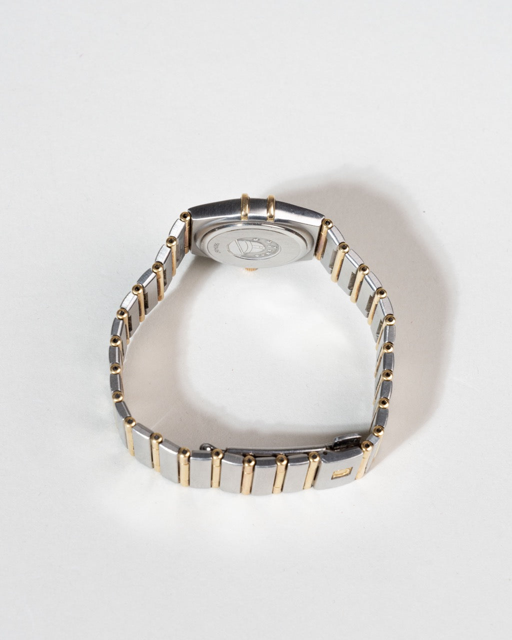 En smuk og feminin Omega Constellation i stål og 18 kt gulddoublé, med den ikoniske designlinje kendetegnet ved “claws”-kassen og romertalbezelen. Modellen har en perlemorskive, der giver et eksklusivt spil i lyset, kombineret med guldtone-visere og timemarkeringer for et elegant og raffineret udtryk. Den integrerede Constellation-lænke sikrer høj komfort og et harmonisk look. Et tidløst og stilrent Omega-ur, perfekt til daglig luksus.