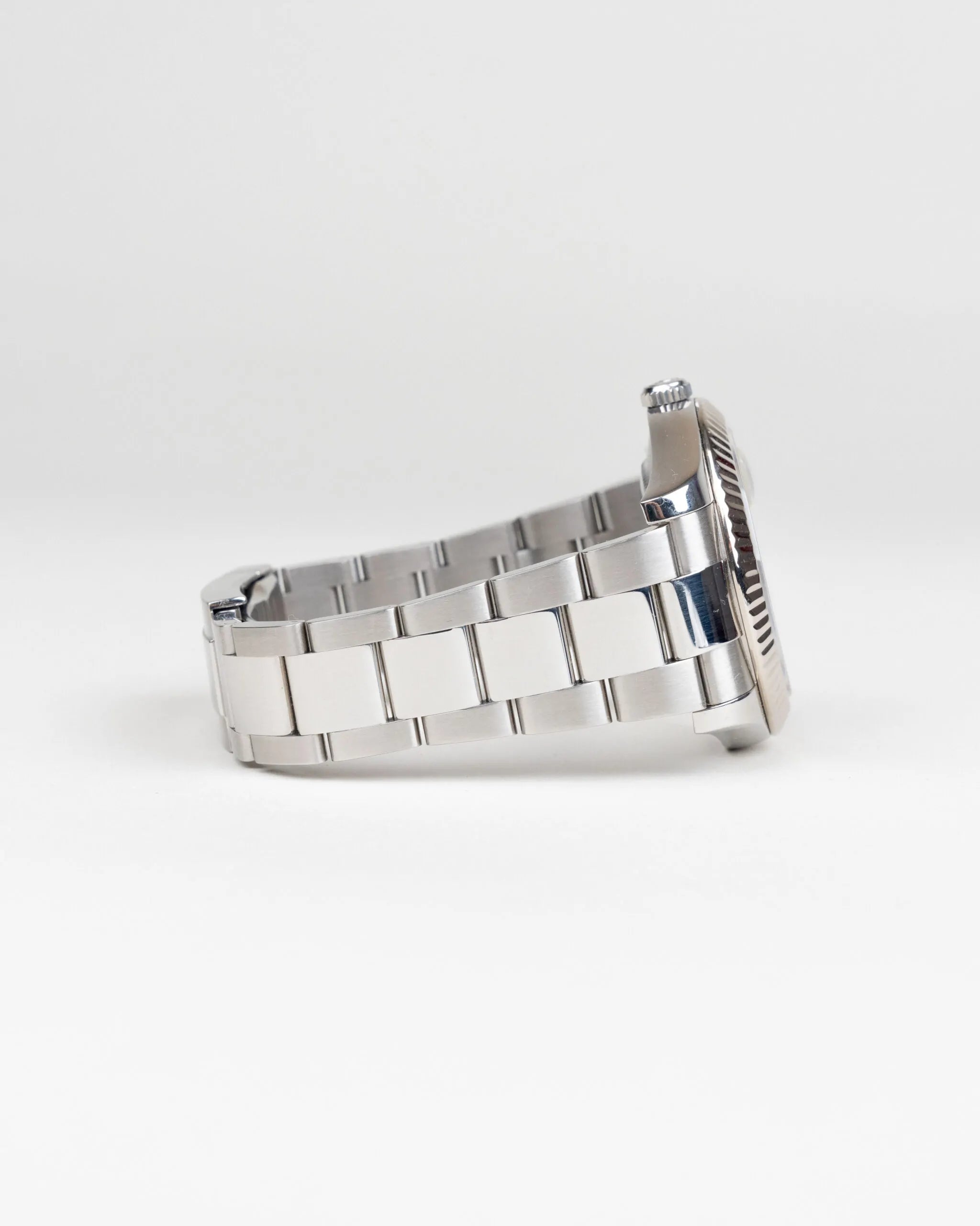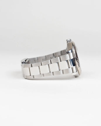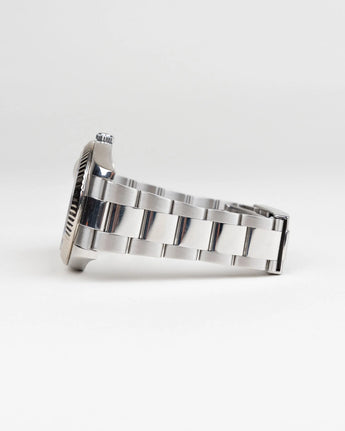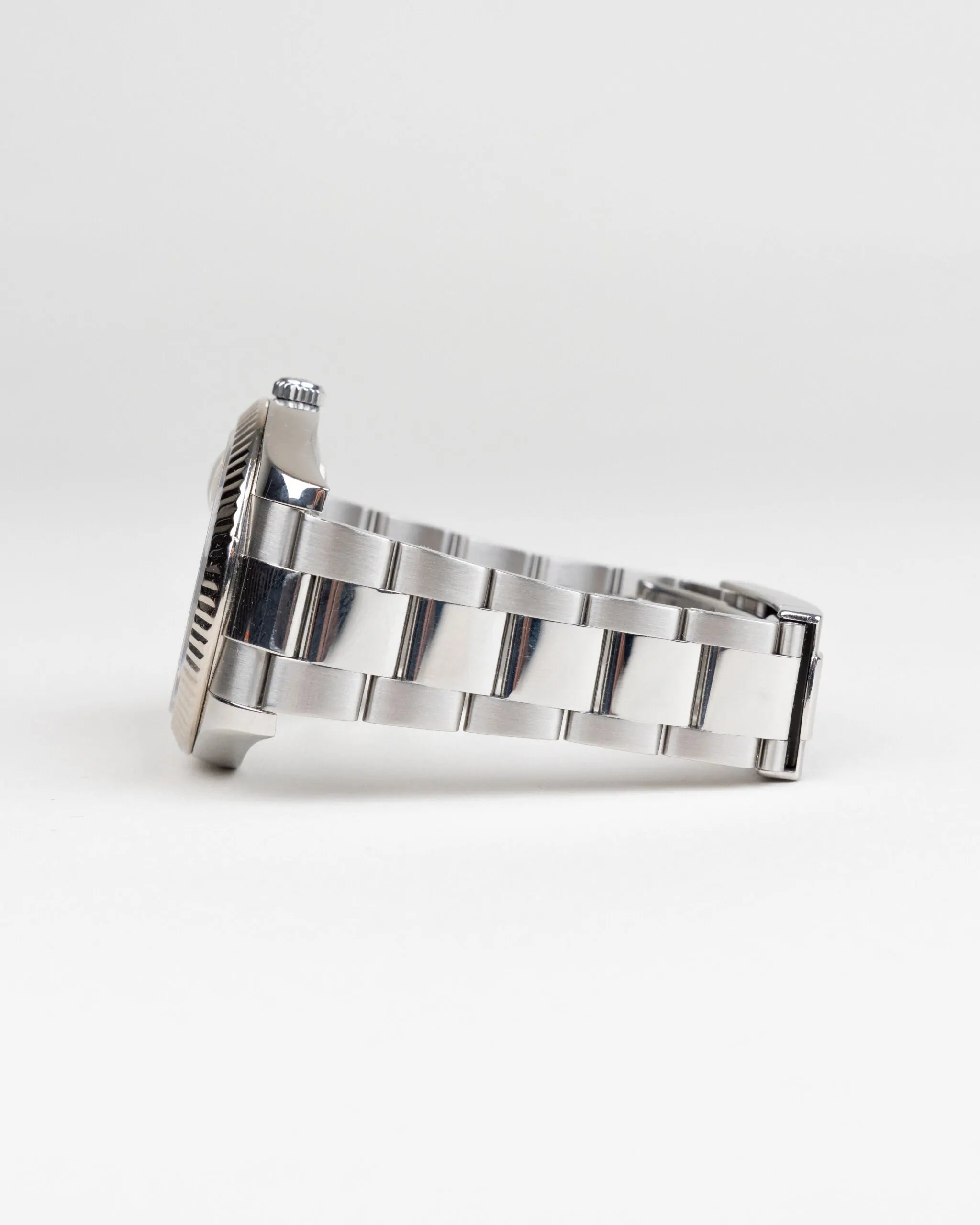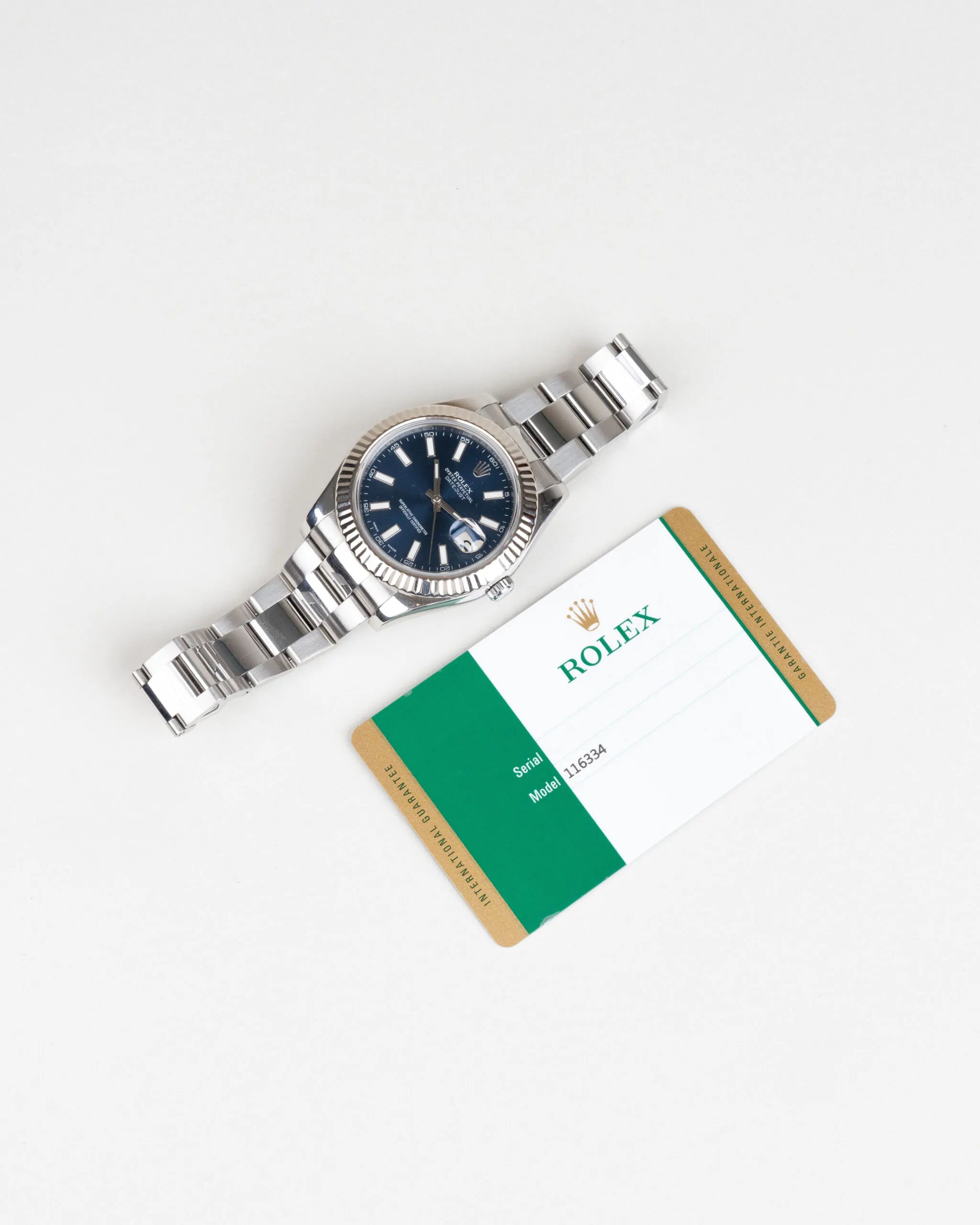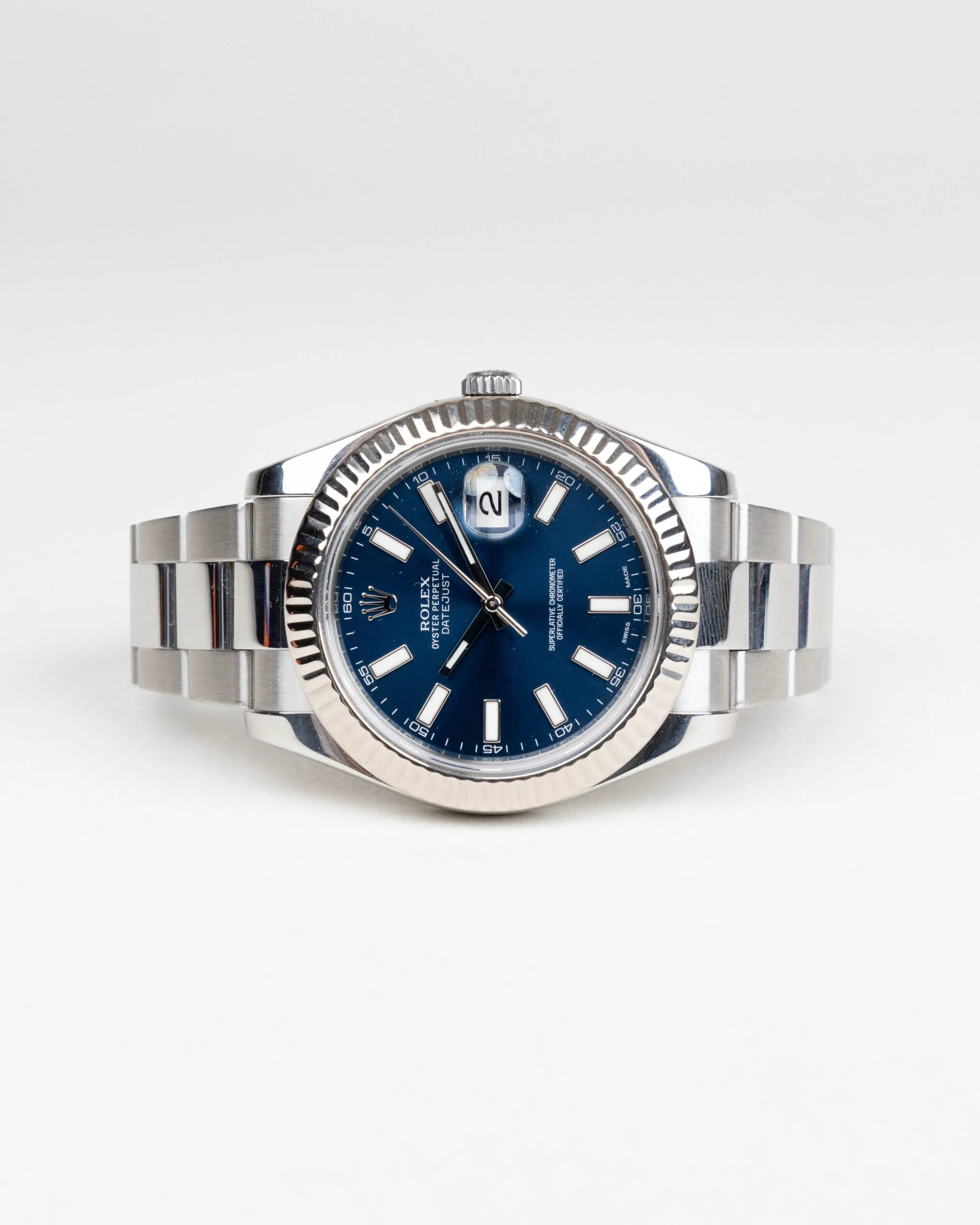 Rolex Datejust II 116334 – Blue Dial Et elegant og moderne Rolex Datejust II i stål med 18 kt hvidguldsbezel. Den dybblå sunburst-skive fanger lyset smukt og giver uret et eksklusivt, tidløst udtryk. Modellen drives af det pålidelige automatiske Calibre 3136 og kommer med den klassiske Oyster-lænke, som kombinerer komfort og robusthed. Et perfekt valg for dig, der ønsker et Rolex med både diskret luksus og markant karakter.