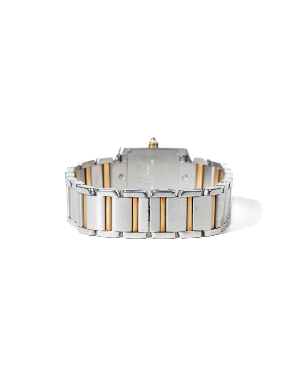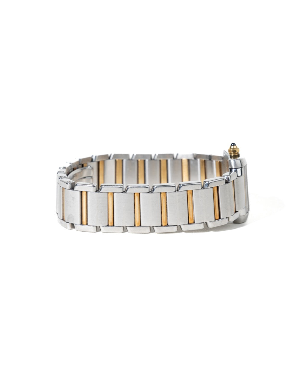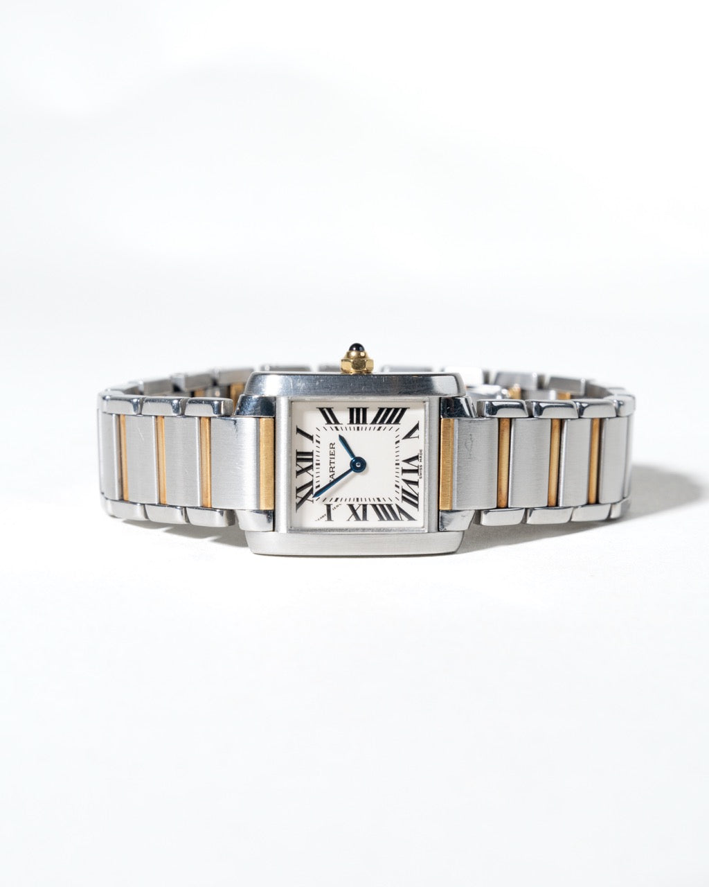 Cartier Tank Française 2384 i smuk two-tone stål/guld kombination – et tidløst design, der aldrig går af mode. Den ikoniske firkantede kasse, romertalsskive og blå visere giver uret det klassiske Cartier-udtryk, mens lænken i stål og guld tilføjer et moderne, luksuriøst touch. Et elegant og alsidigt smykkeur, perfekt til både daglig brug og særlige anledninger.Uret er gennemtestet og fuldt funktionsdygtigt. Uret kan have ganske små og ubetydelige kosmetiske ridser.