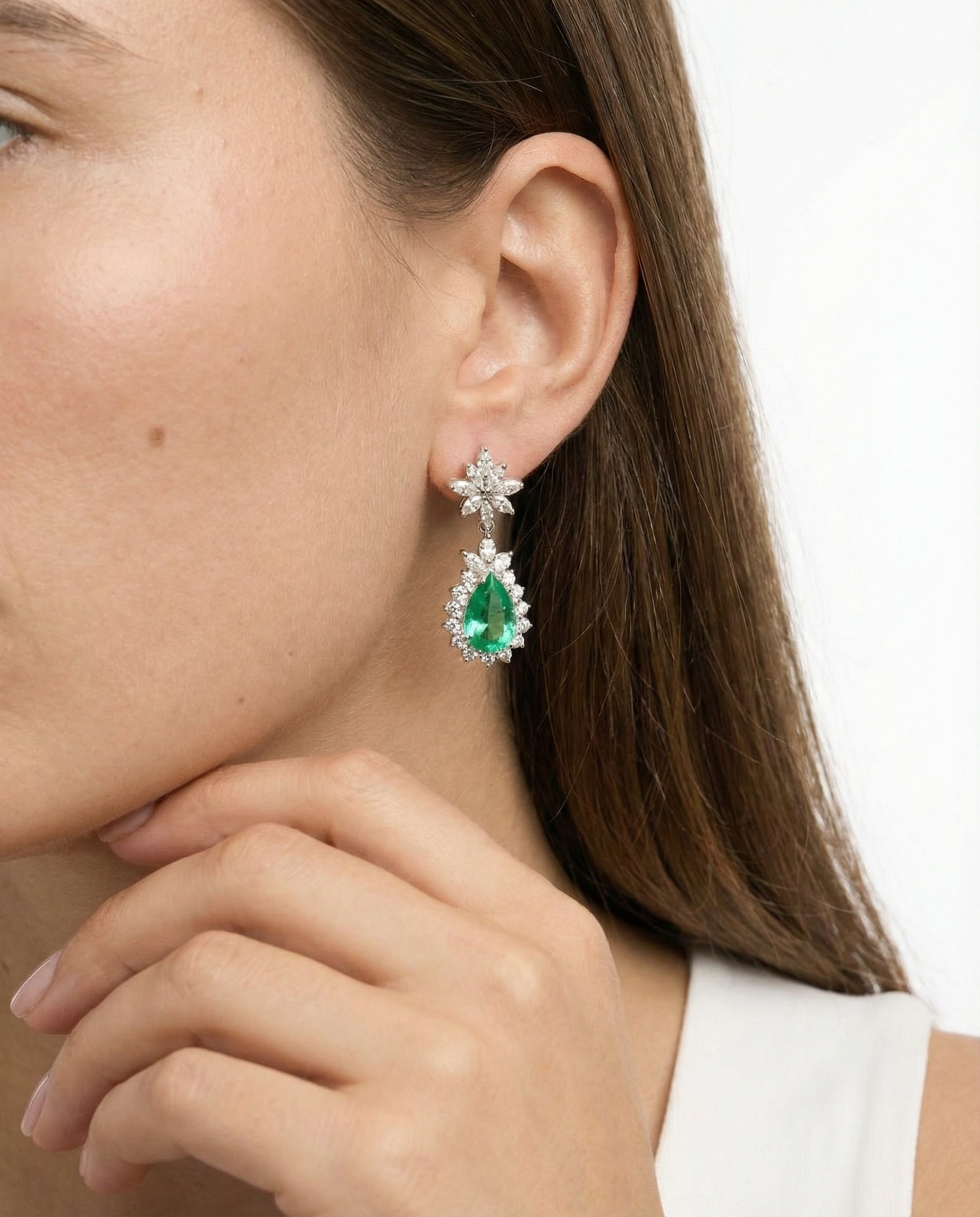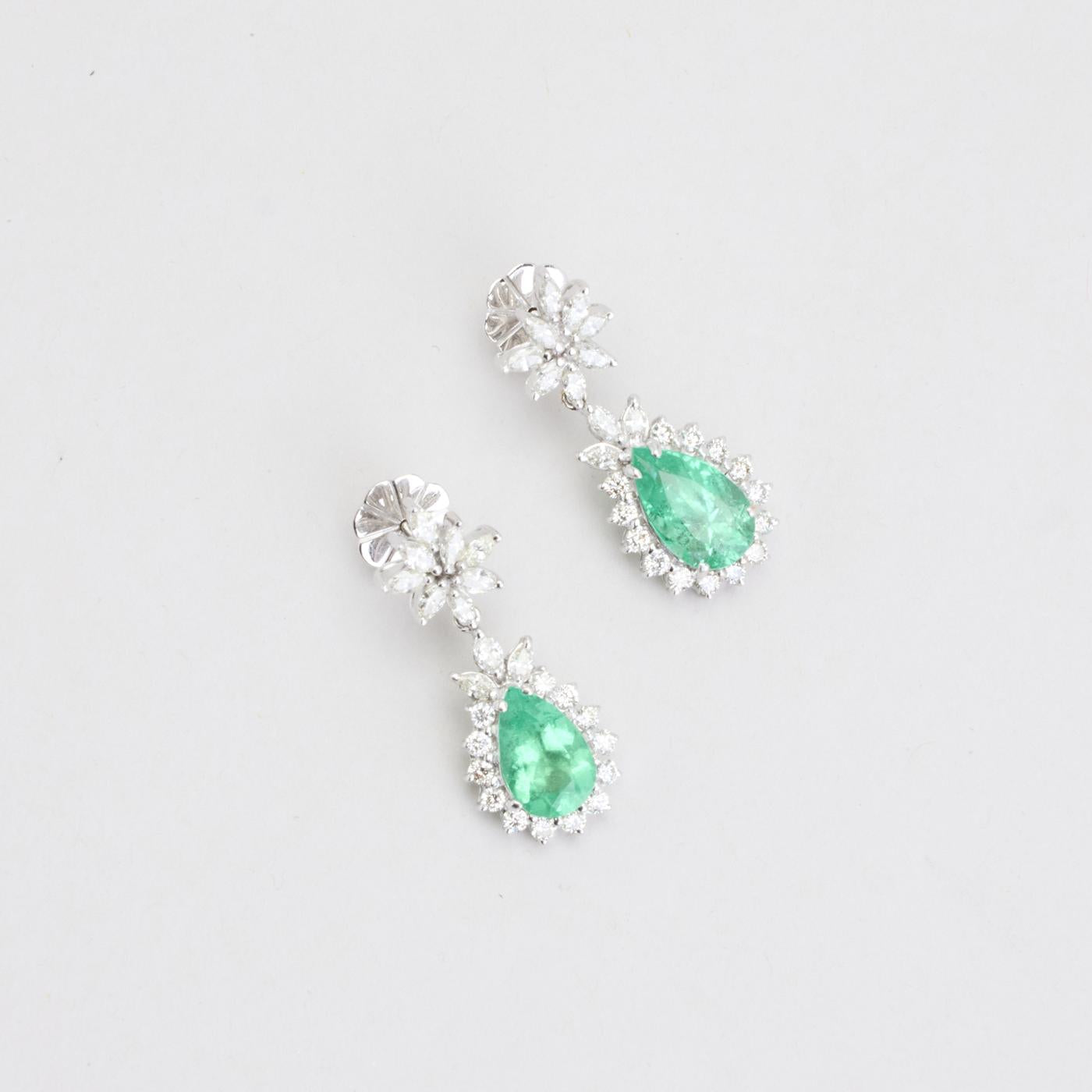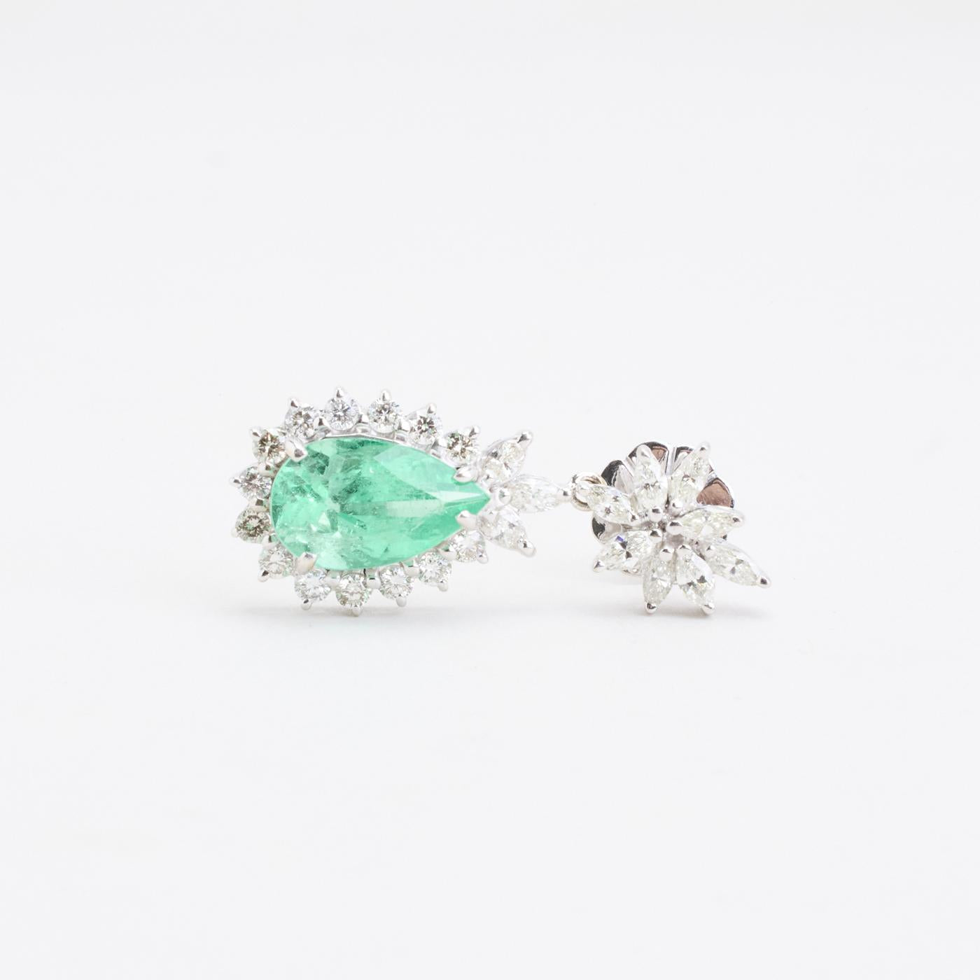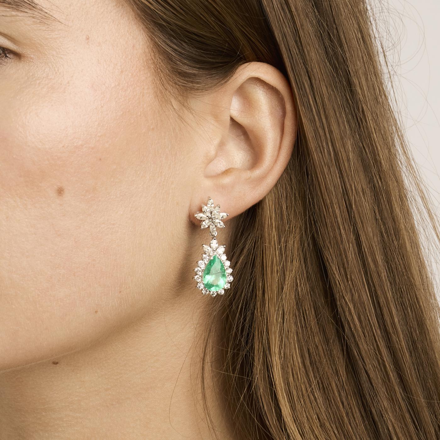 Model: Roset øreringe med diamant (2.46 ct) i 18K hvidguld med en smaragd, 3.5 cm,