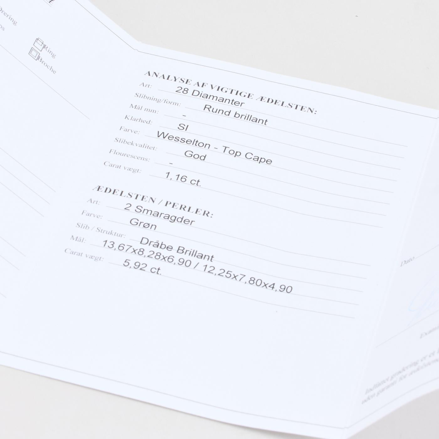 Diamanter: 2.46 ct. totalt fordelt på 50 naturlige diamanter. og 28 x 0.04 ct. Farve Wesselton-Top Cape og 22 x 0.06 ct. Farve Wesselton-Top Cape. Klarhed VS-SI