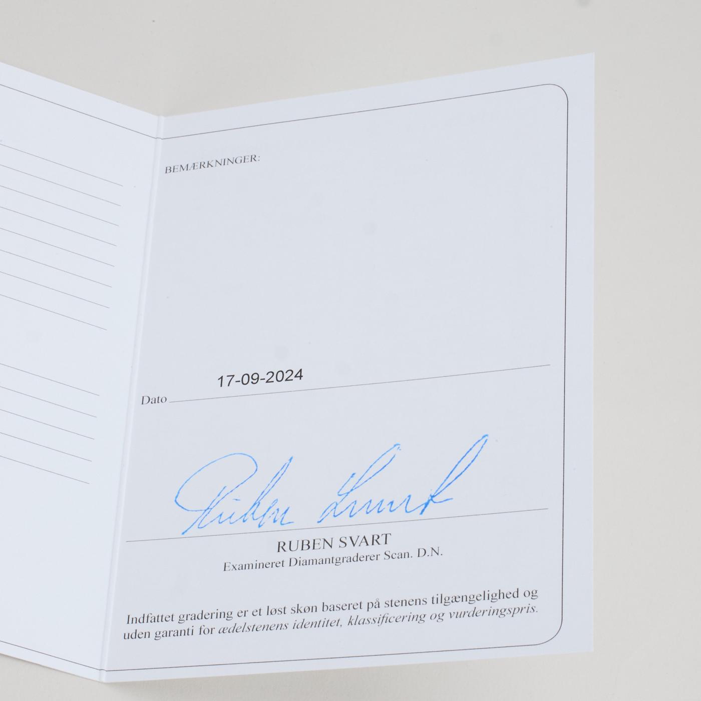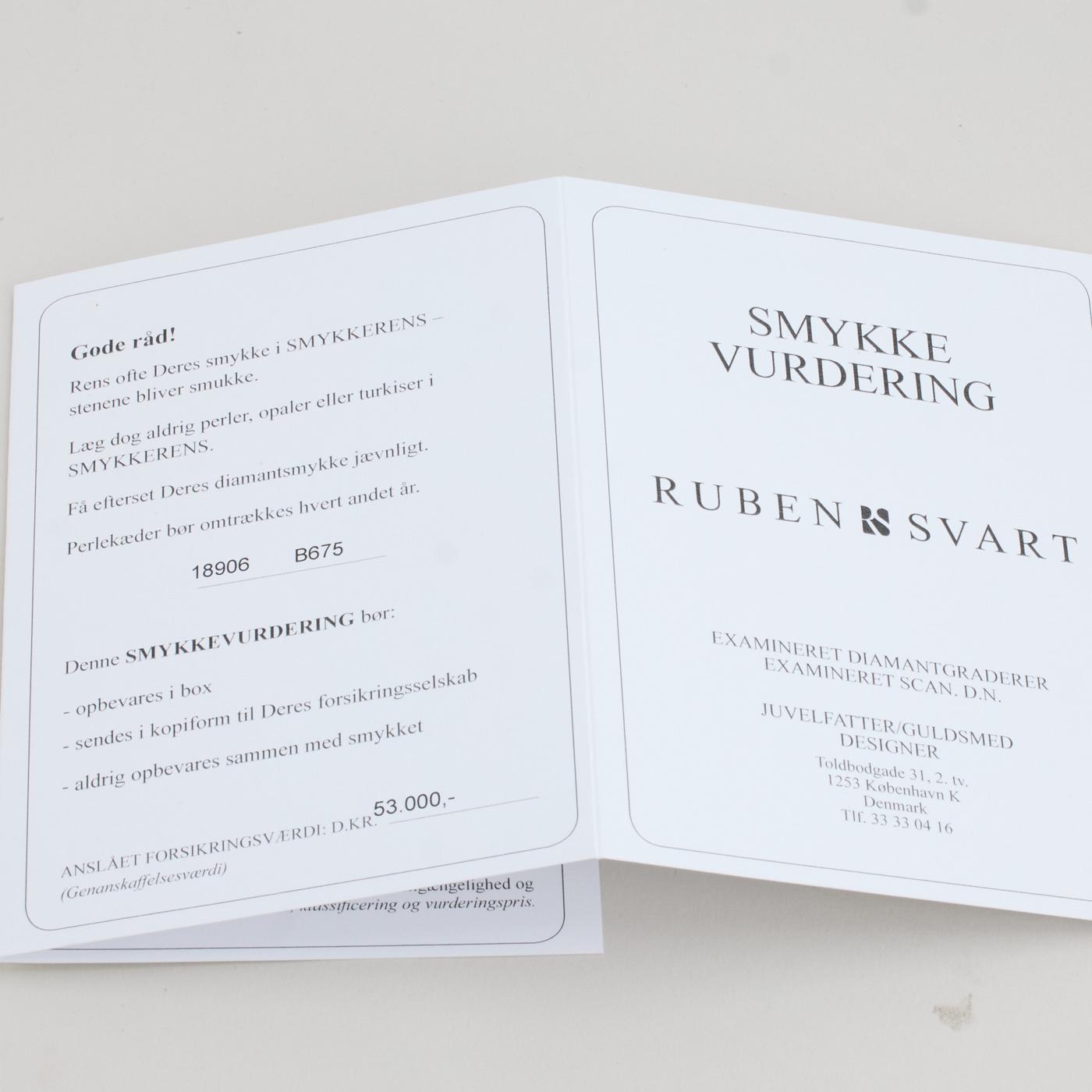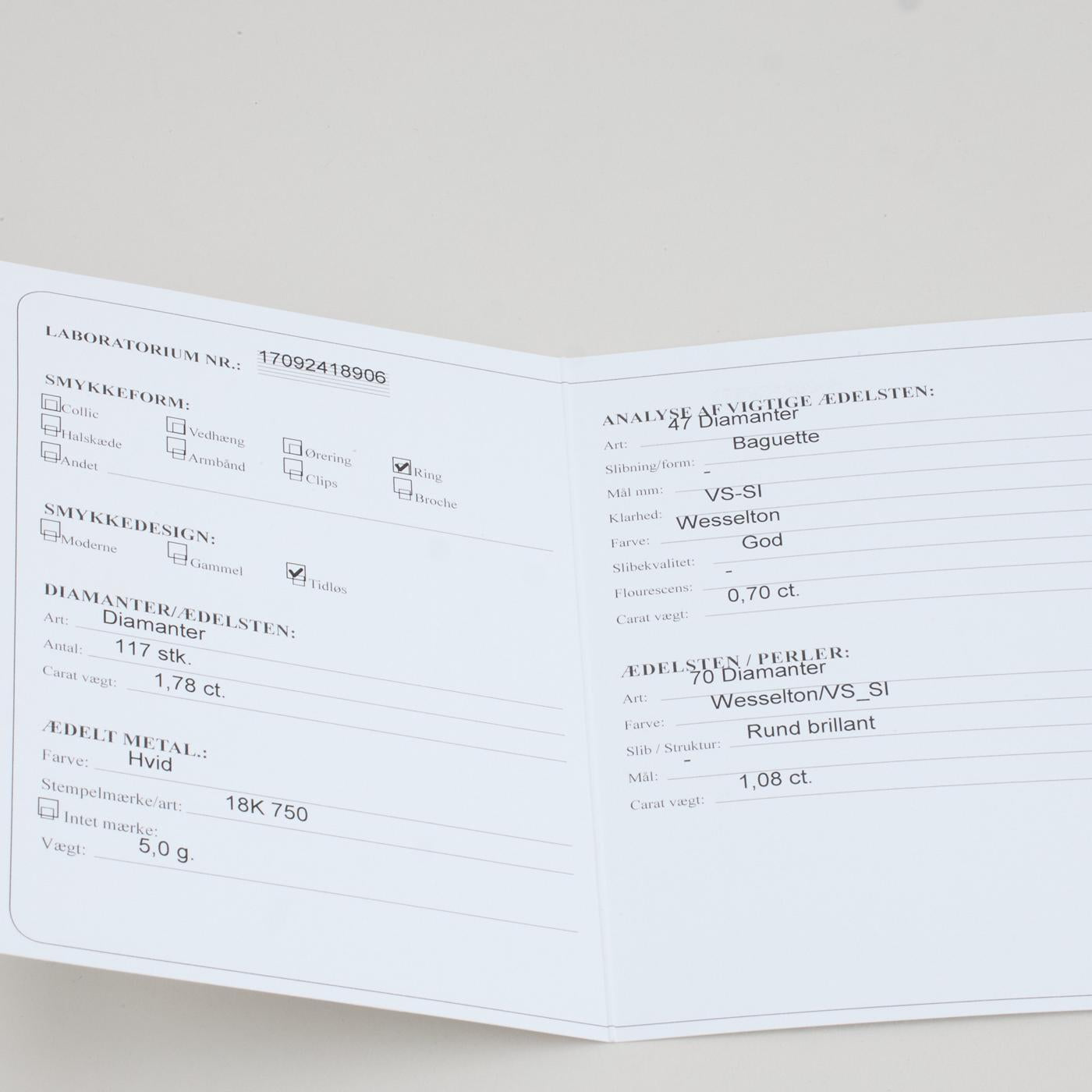 Diamanter: 1.78 ct. totalt fordelt på 117 naturlige sten. og 47 x 0.01 ct. Farve Wesselton. Klarhed VS-SI og 70 x 0.02 ct. Farve Wesselton. Klarhed VS-SI