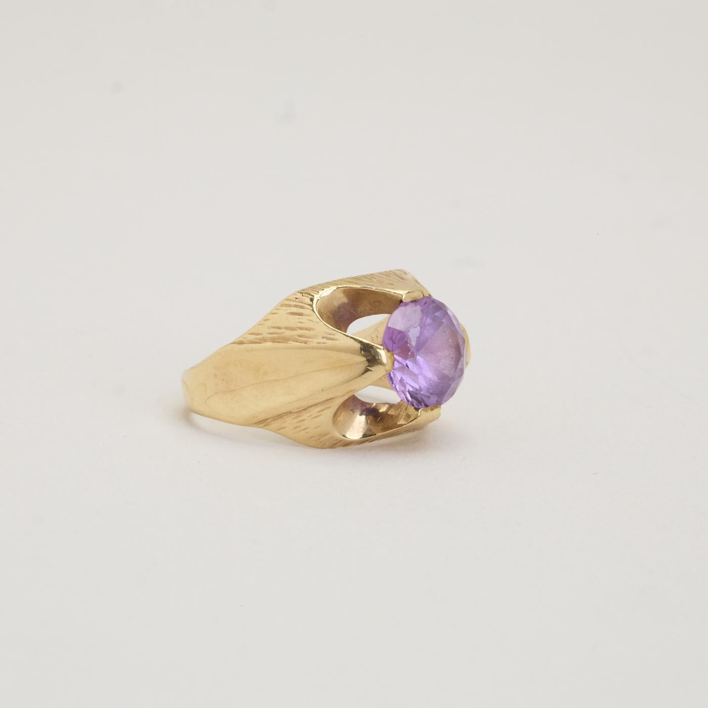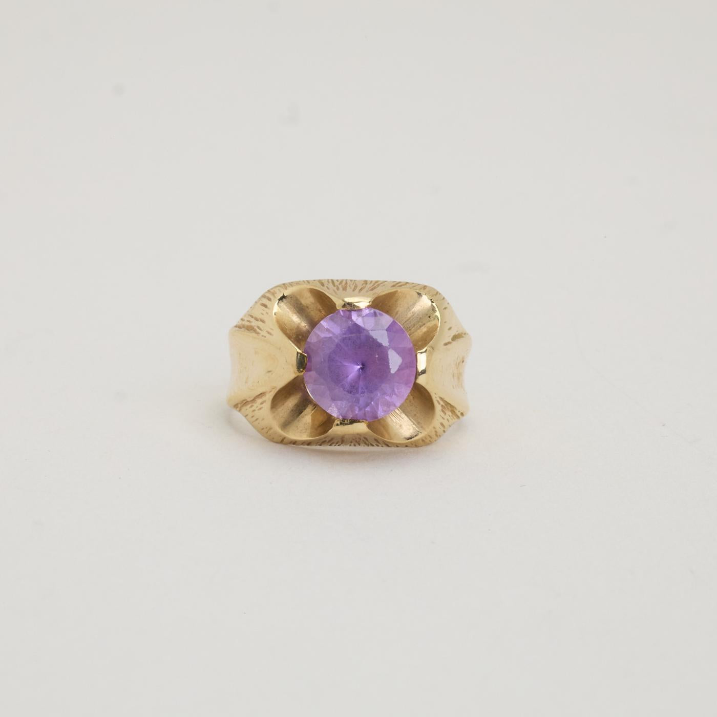 Signet ring i 14K guld med facetteret lyslilla sten, Str. 50