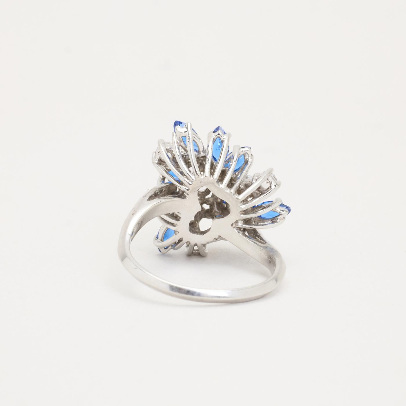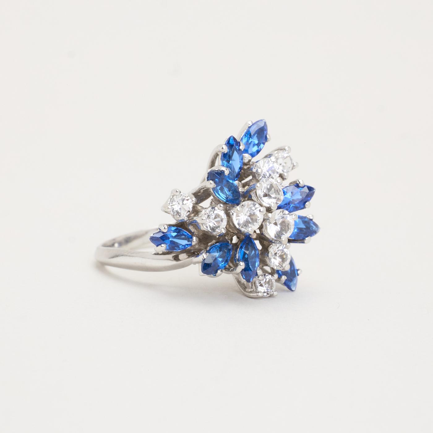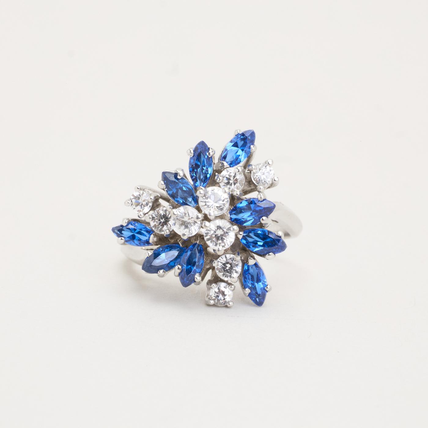 Cocktailring i 14K hvidguld med zirkoniaer, blå marquise-slebne sten og klare runde sten, Str. 51