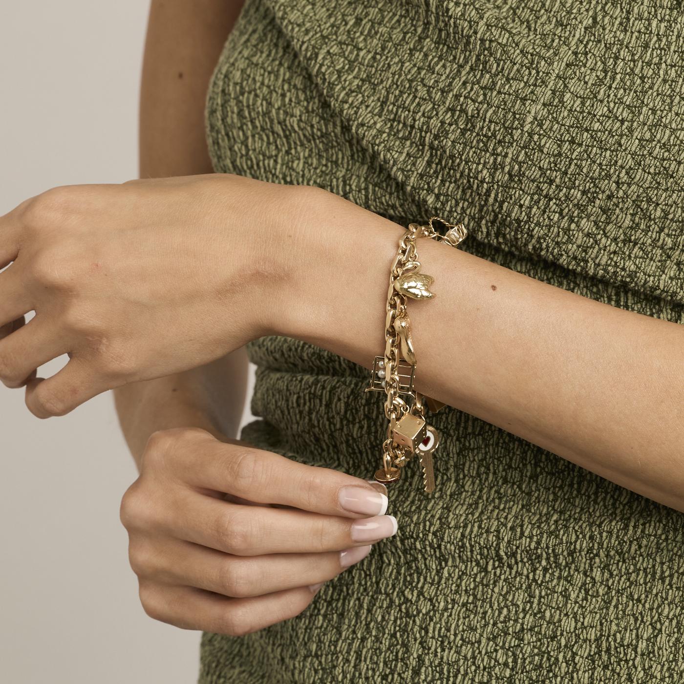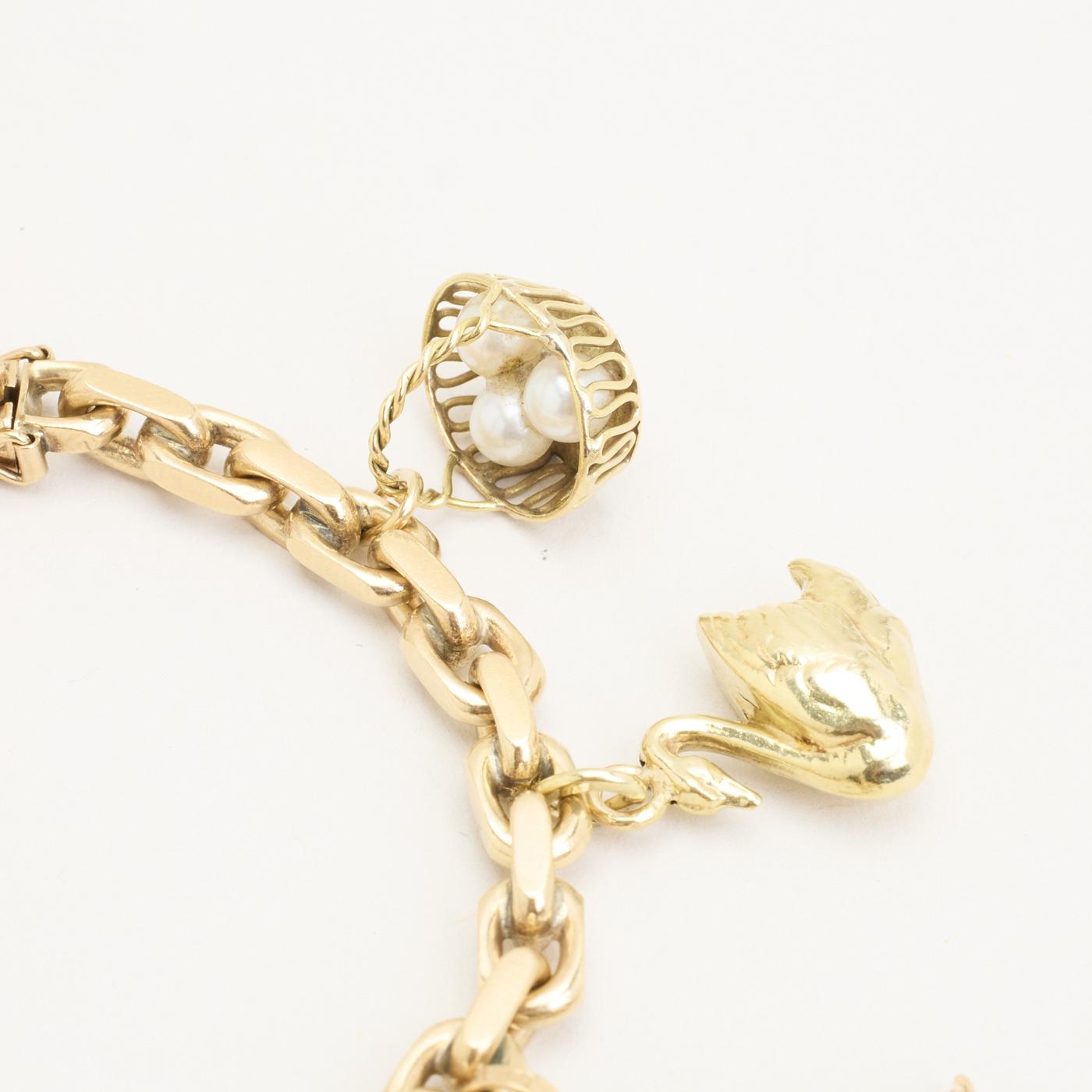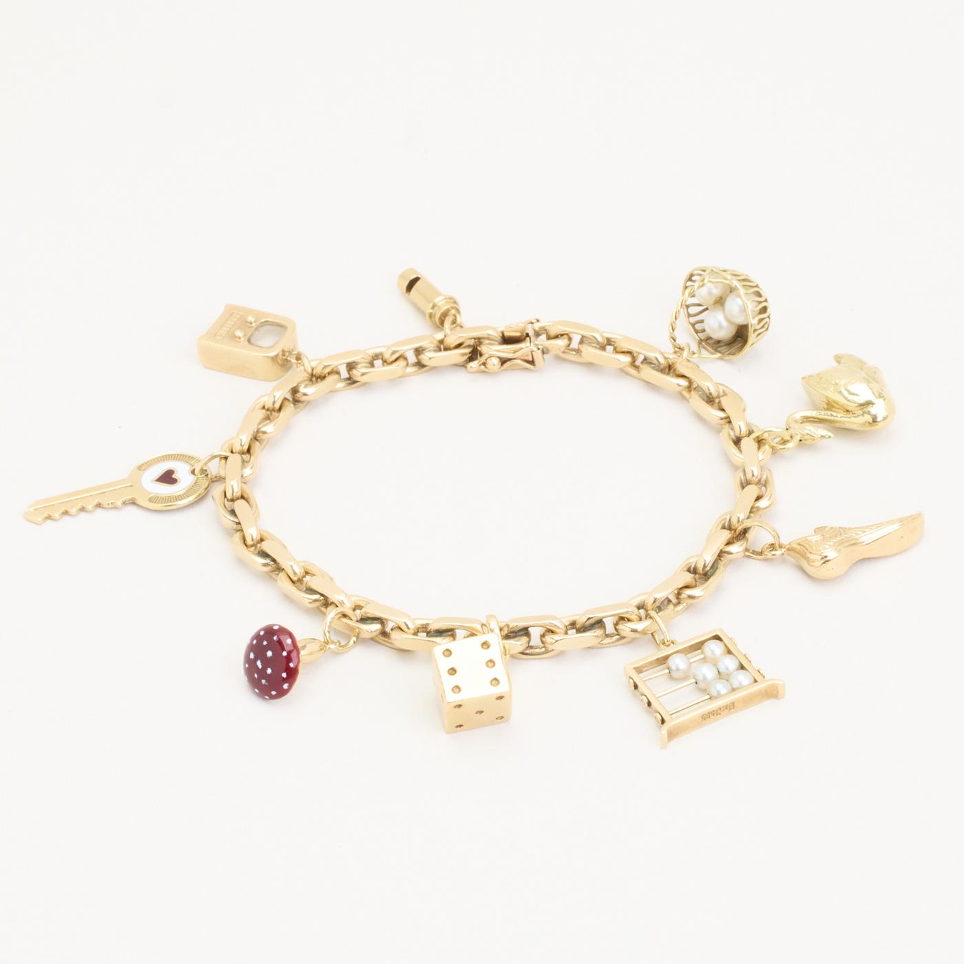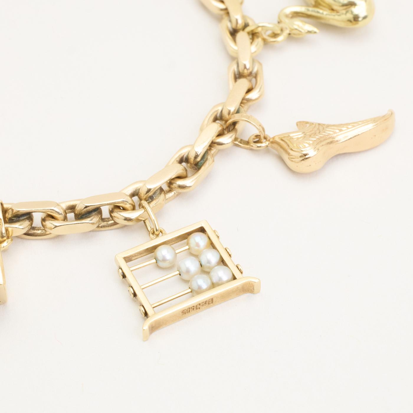 Charm-armbånd i 14K guld med otte vedhæng, perlelignende elementer og emaljedetaljer, 19,5 cm, karabinlås