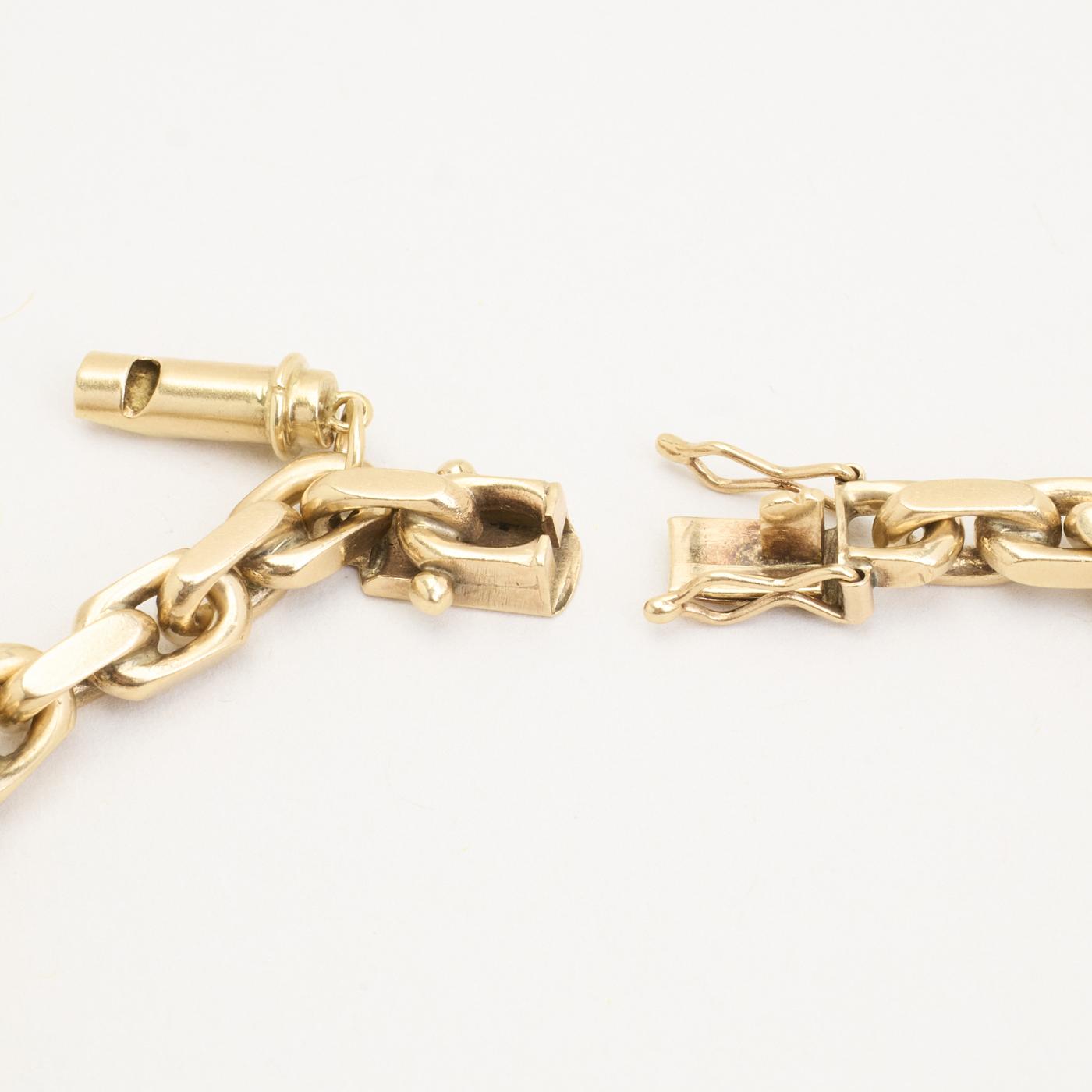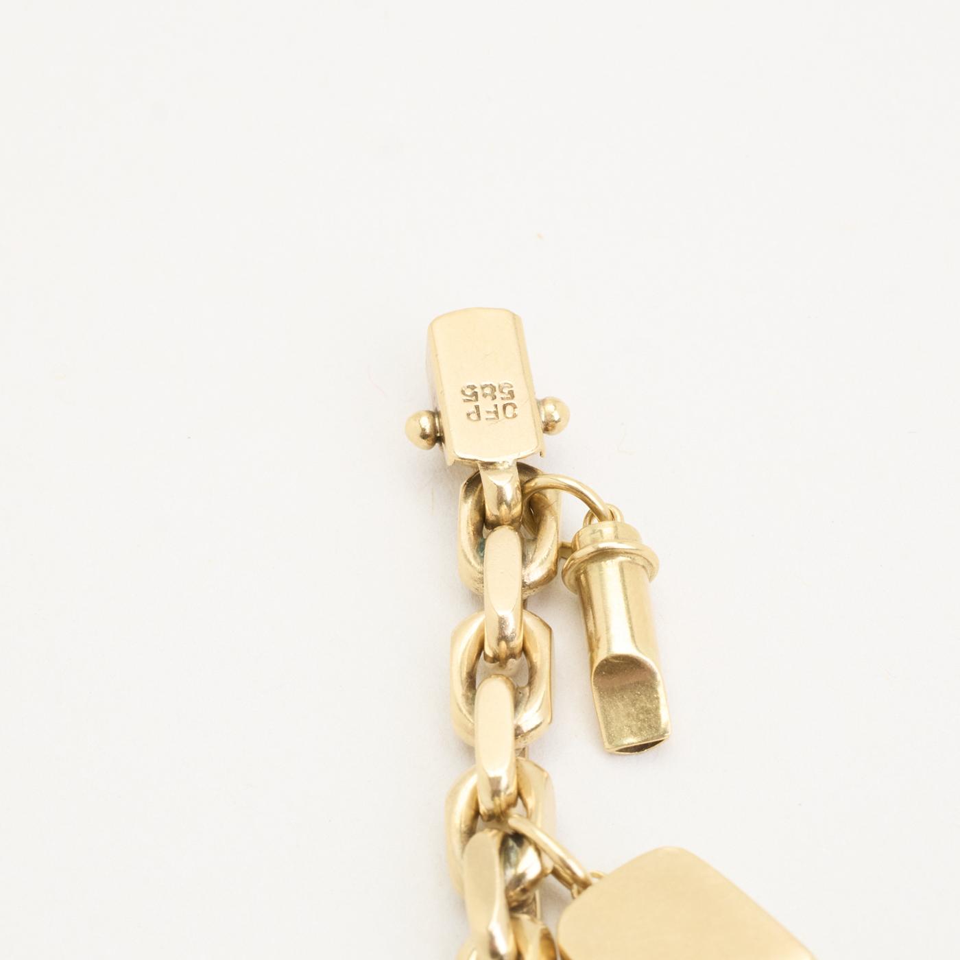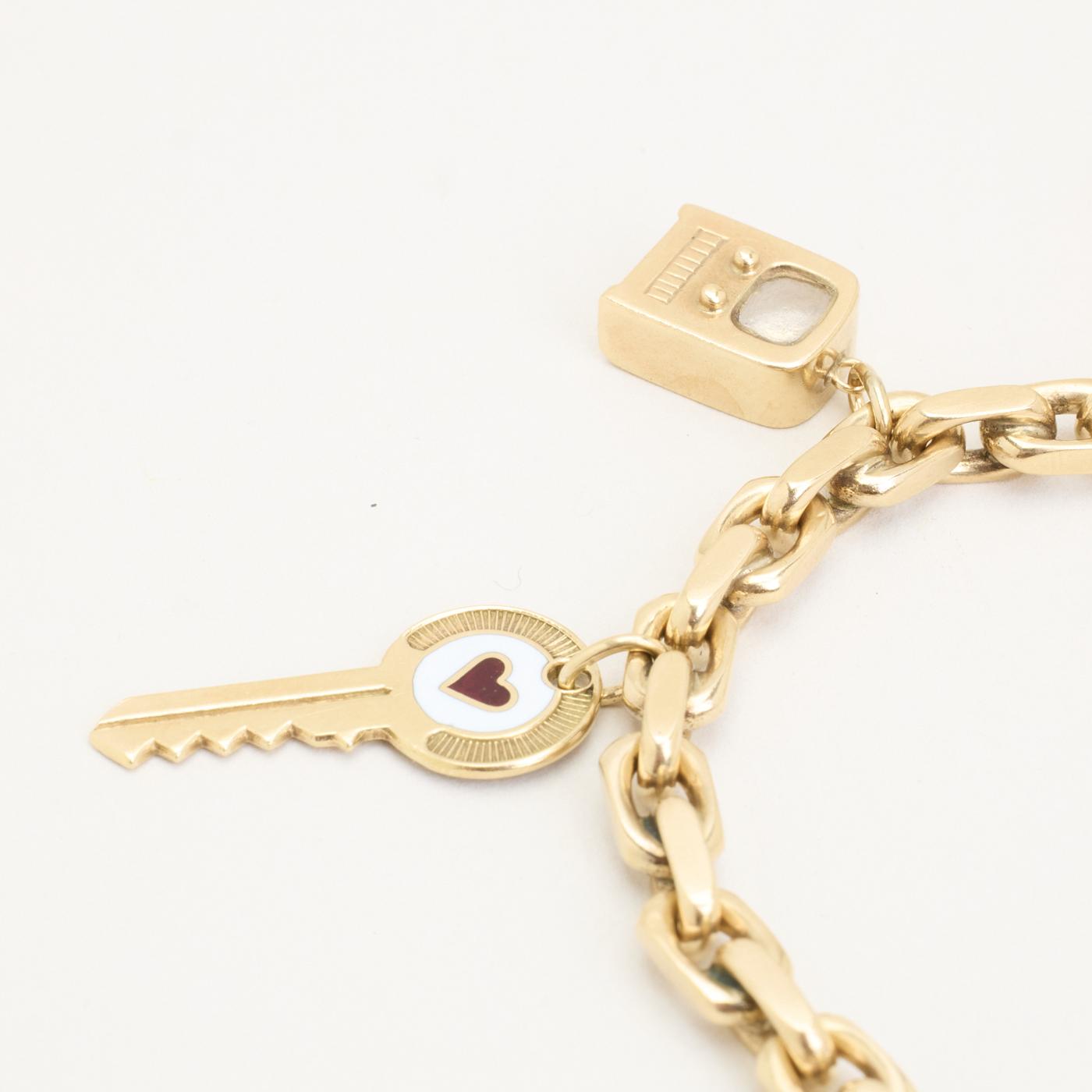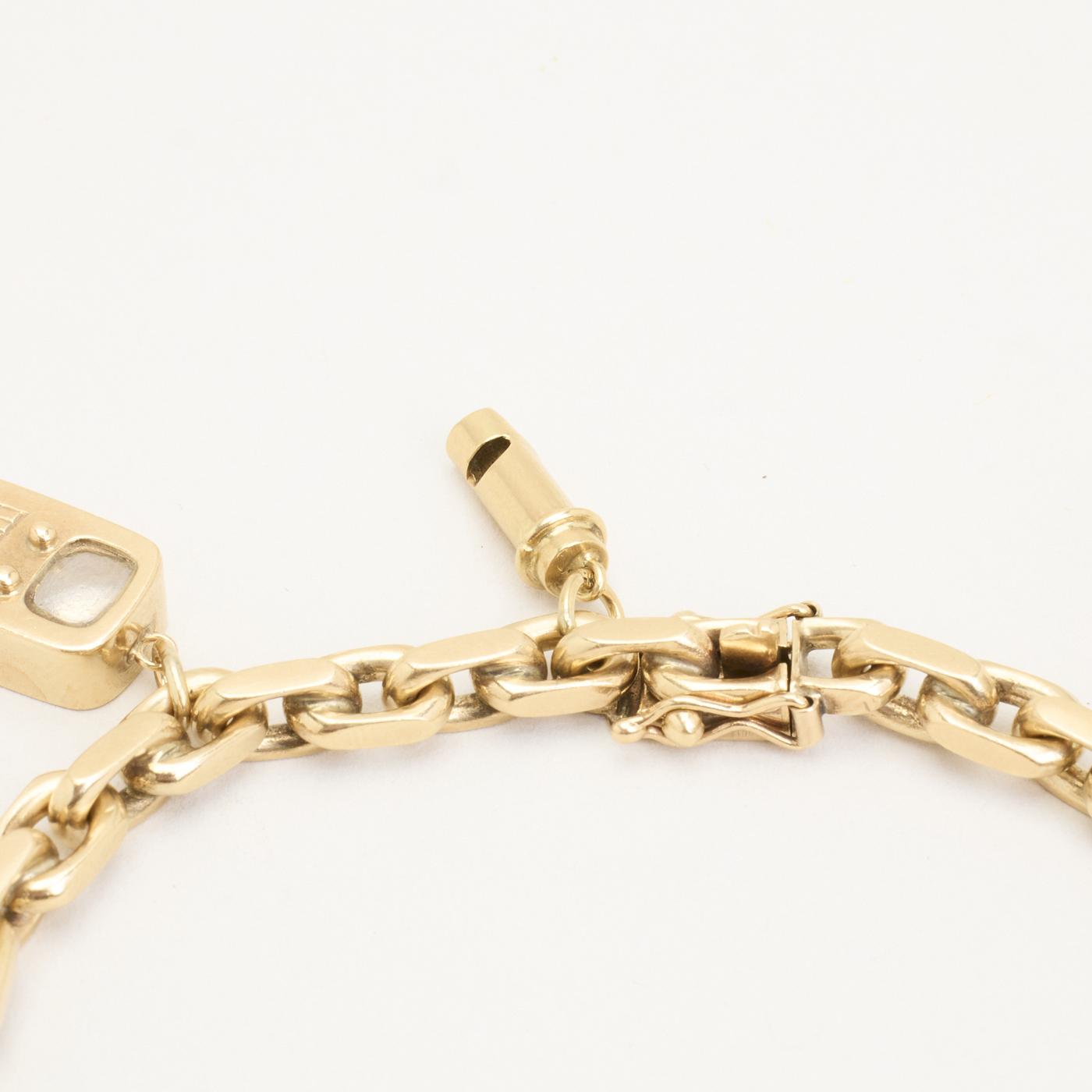 Charm-armbånd i 14K guld med otte vedhæng, perlelignende elementer og emaljedetaljer, 19,5 cm, karabinlås