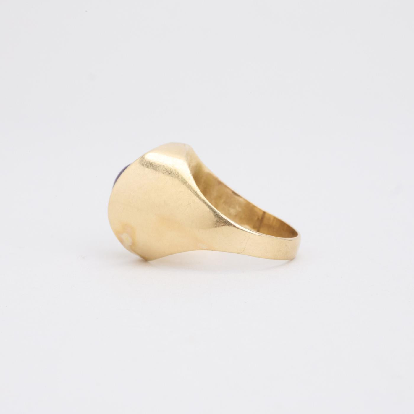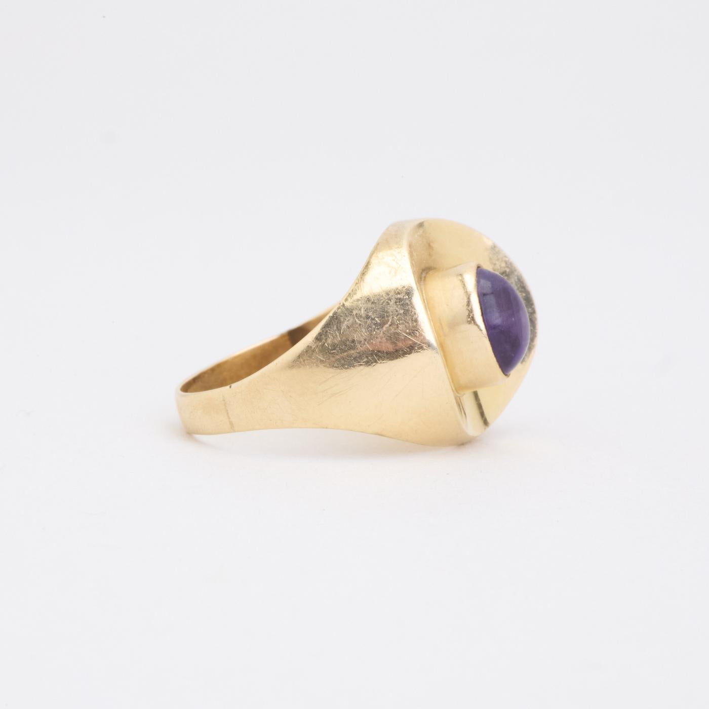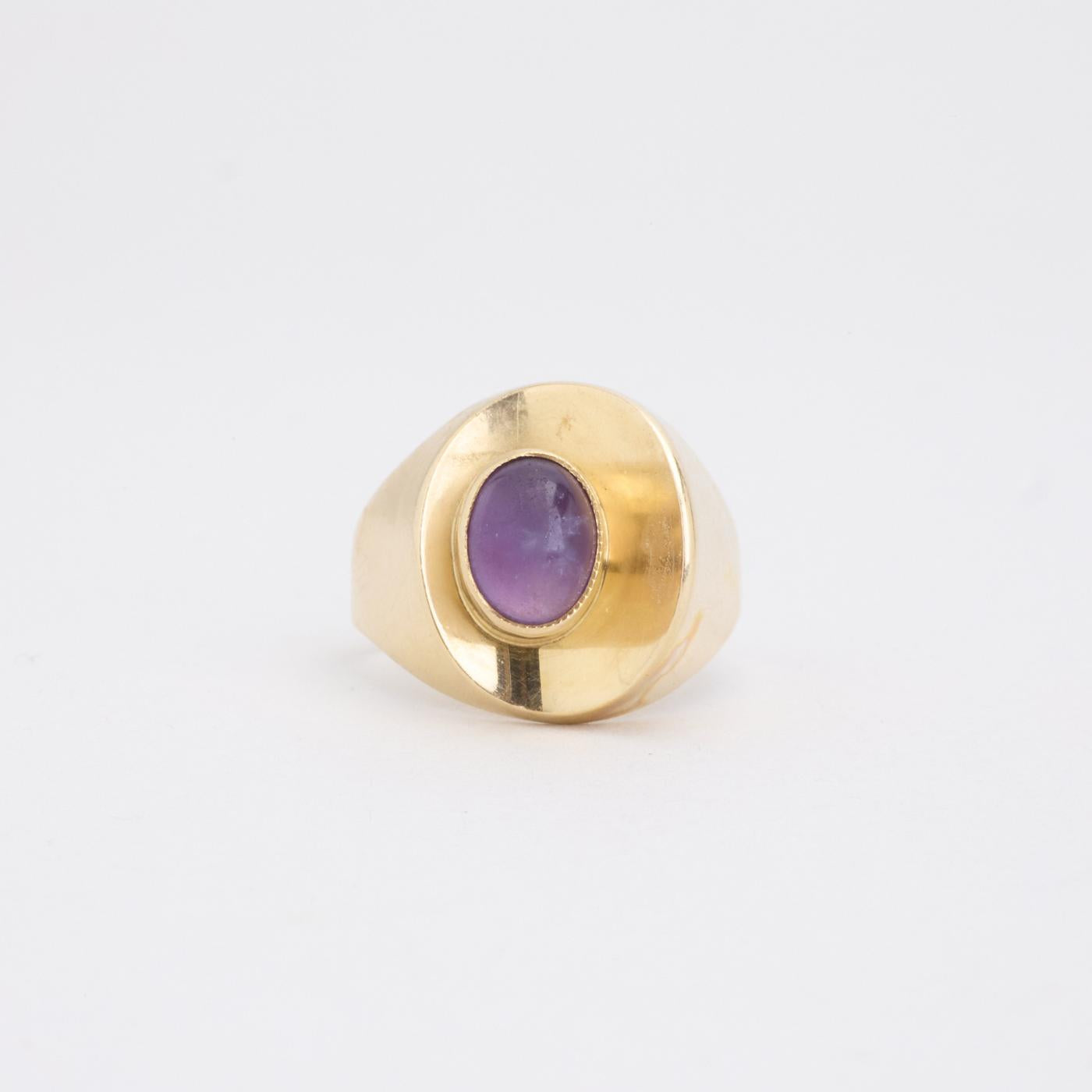 Signetring i 14K guld med cabochonsleben violet sten, Str. 54