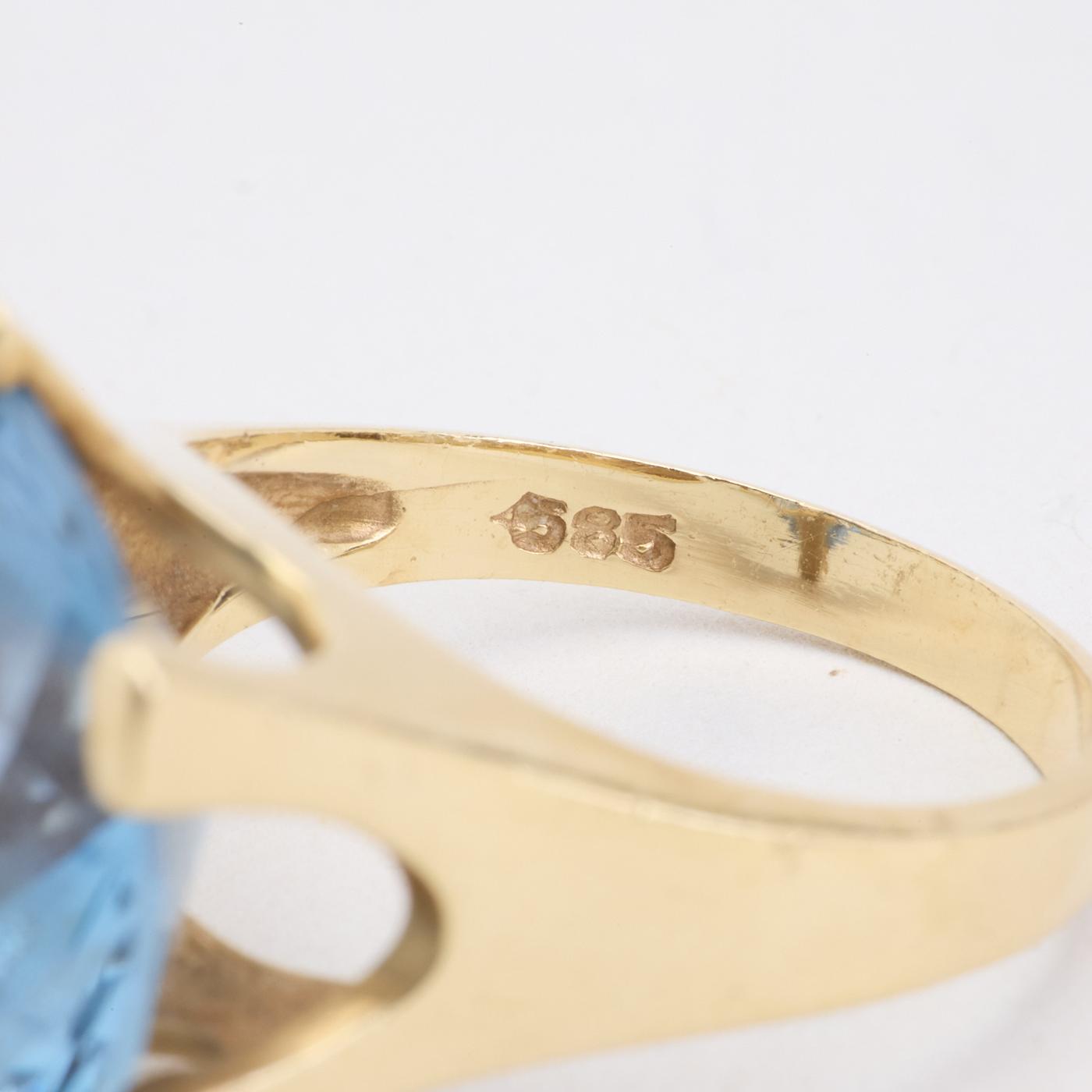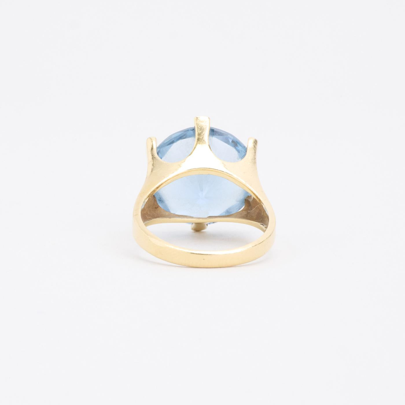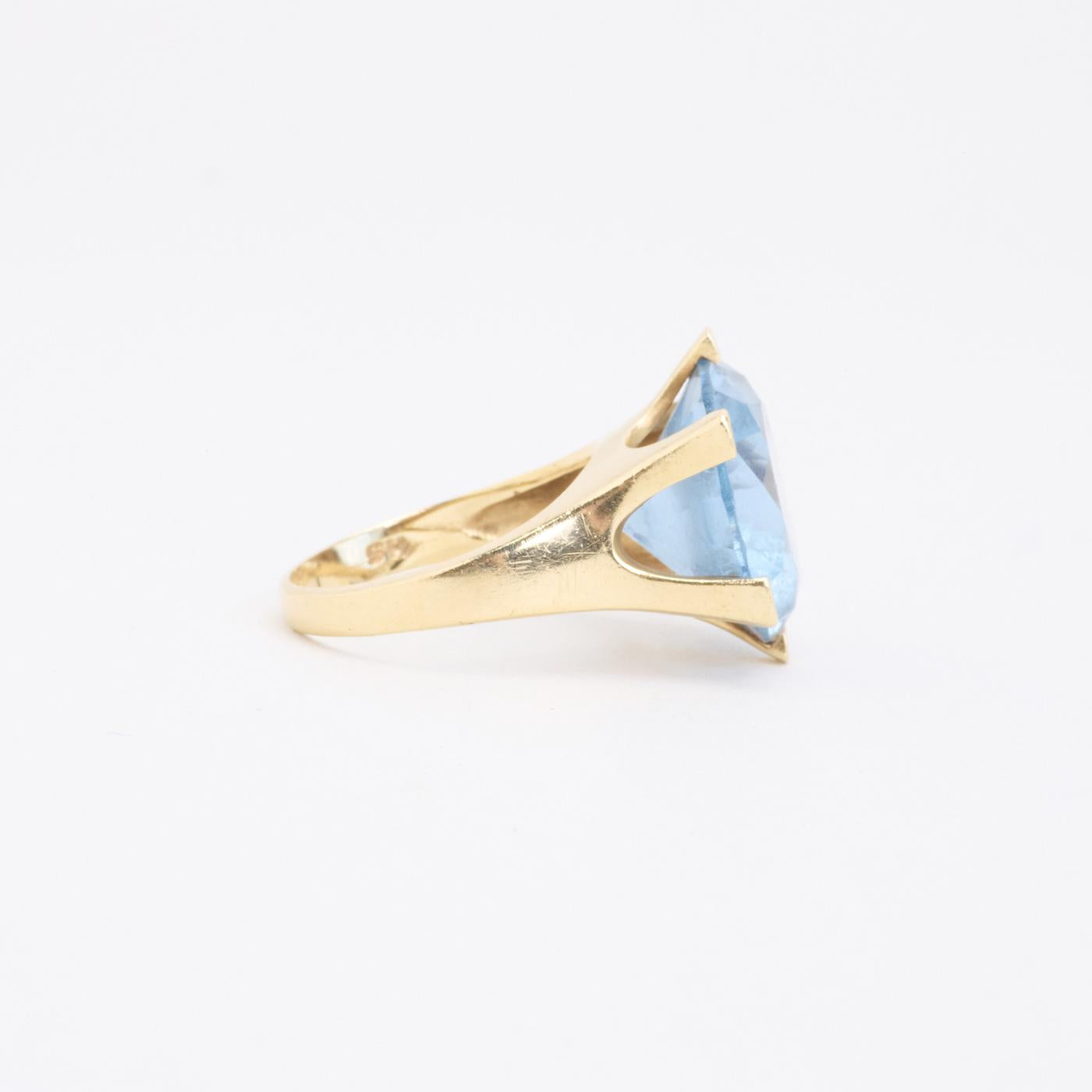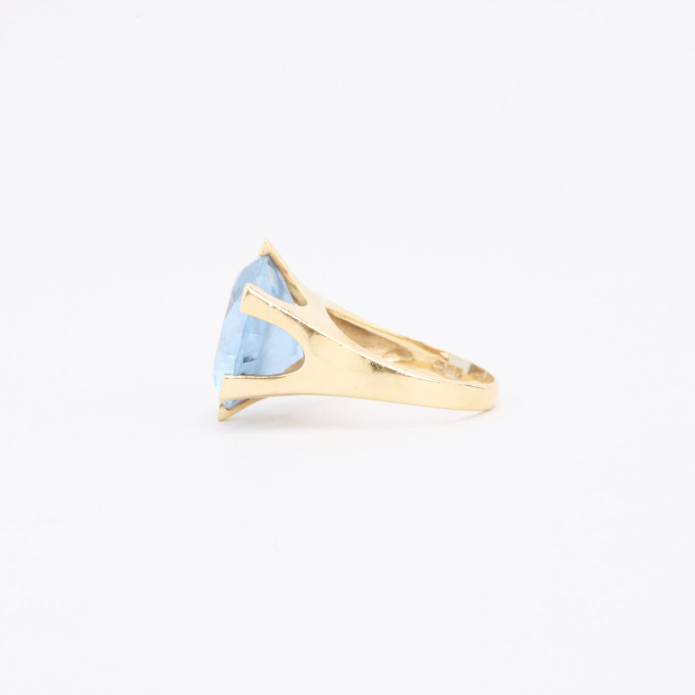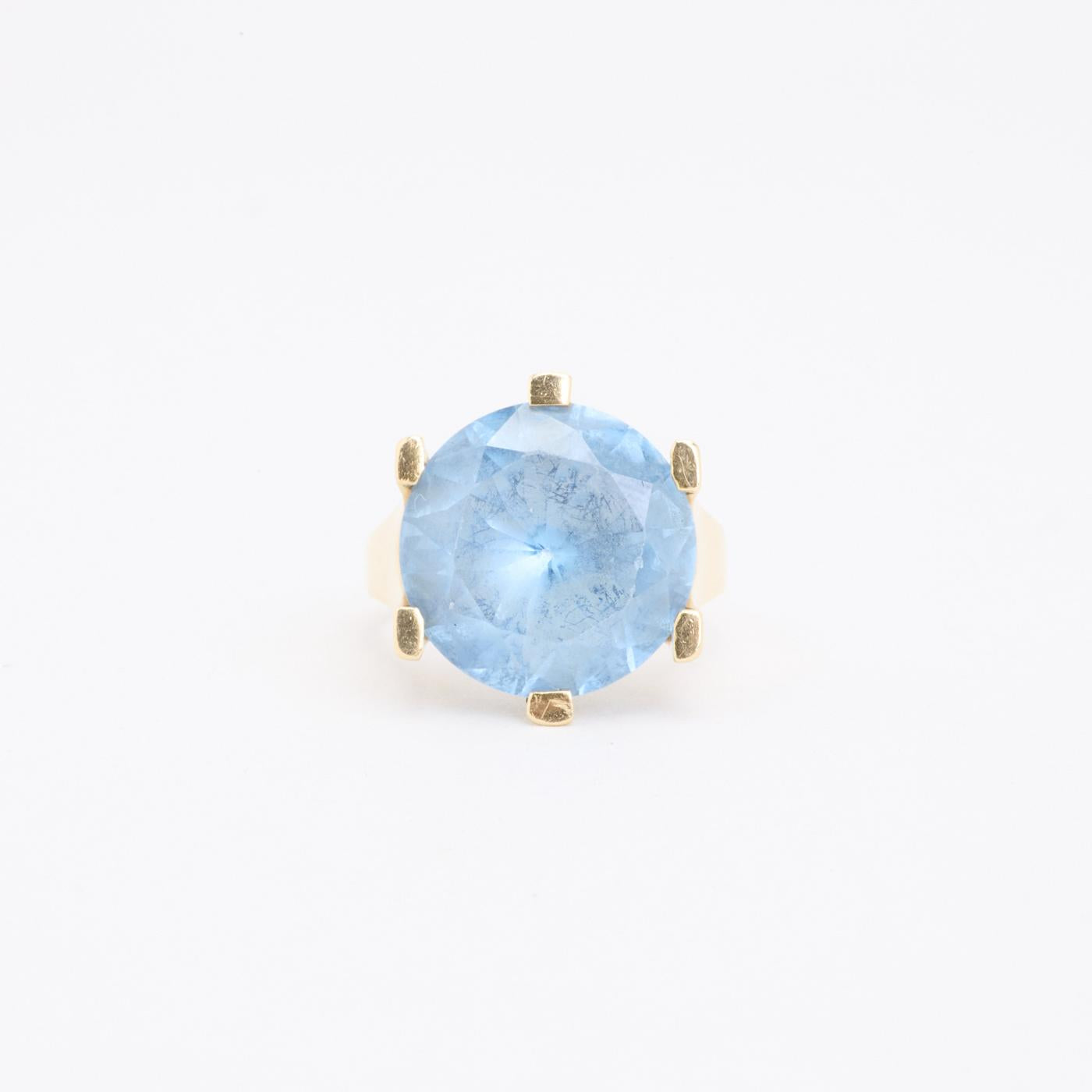 Cocktailring i guldfarvet metal med stor, rund facetsleben lyseblå sten, Str. 53