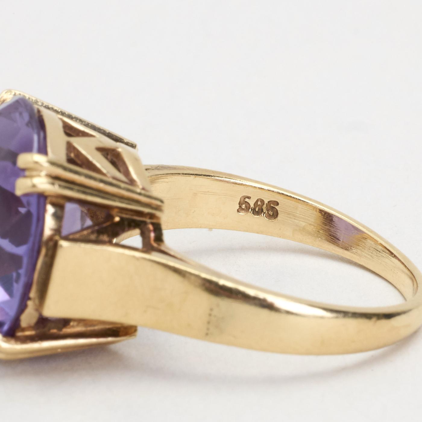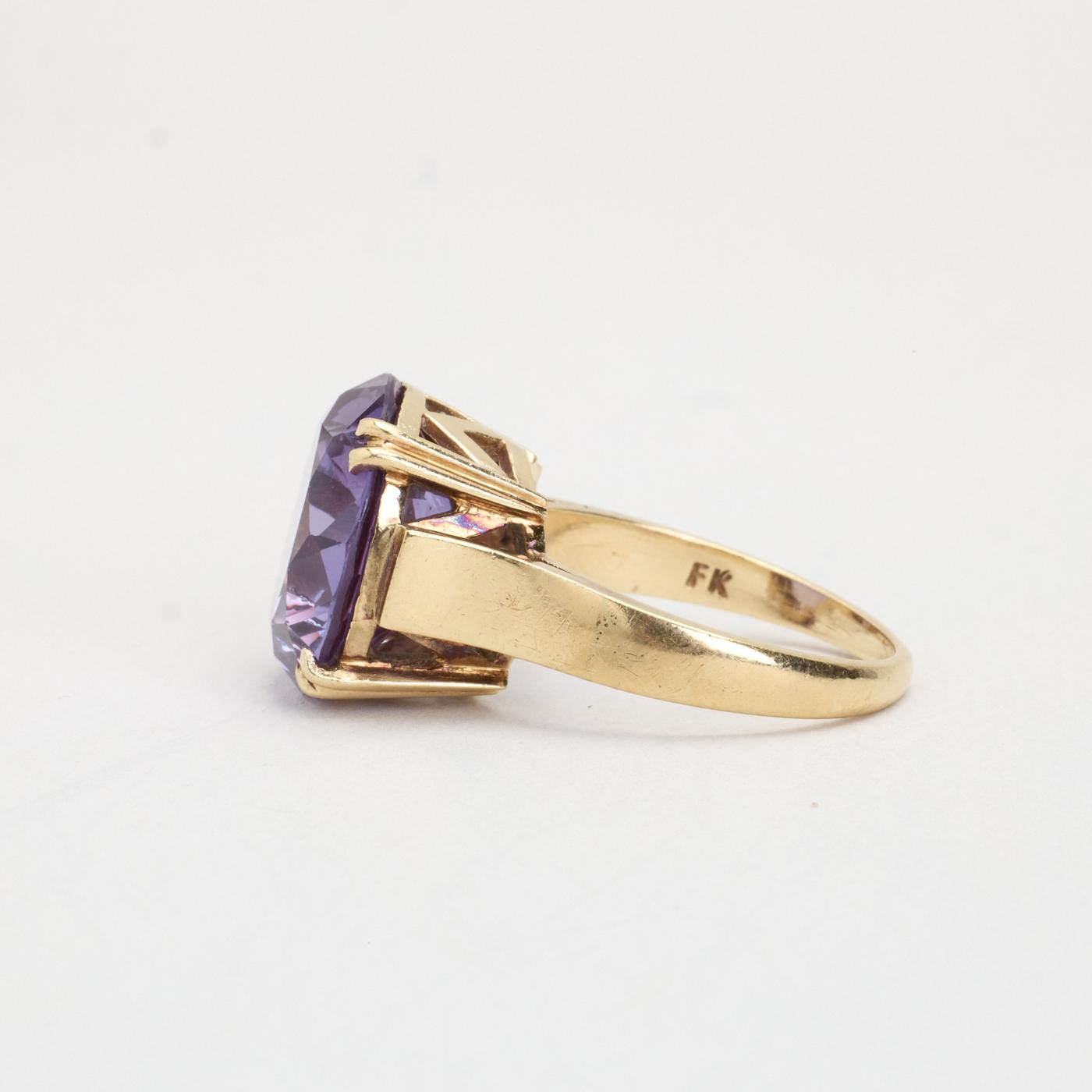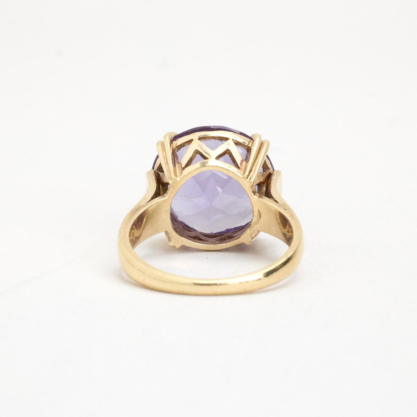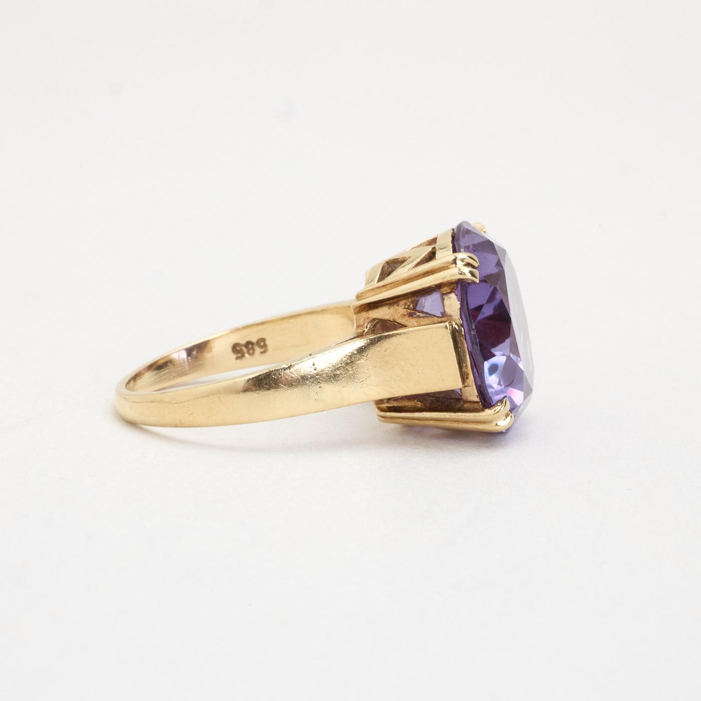Statement ring i 14K guld med stor rundfacetteret lilla sten i seksgrebsfatning, Str. 57