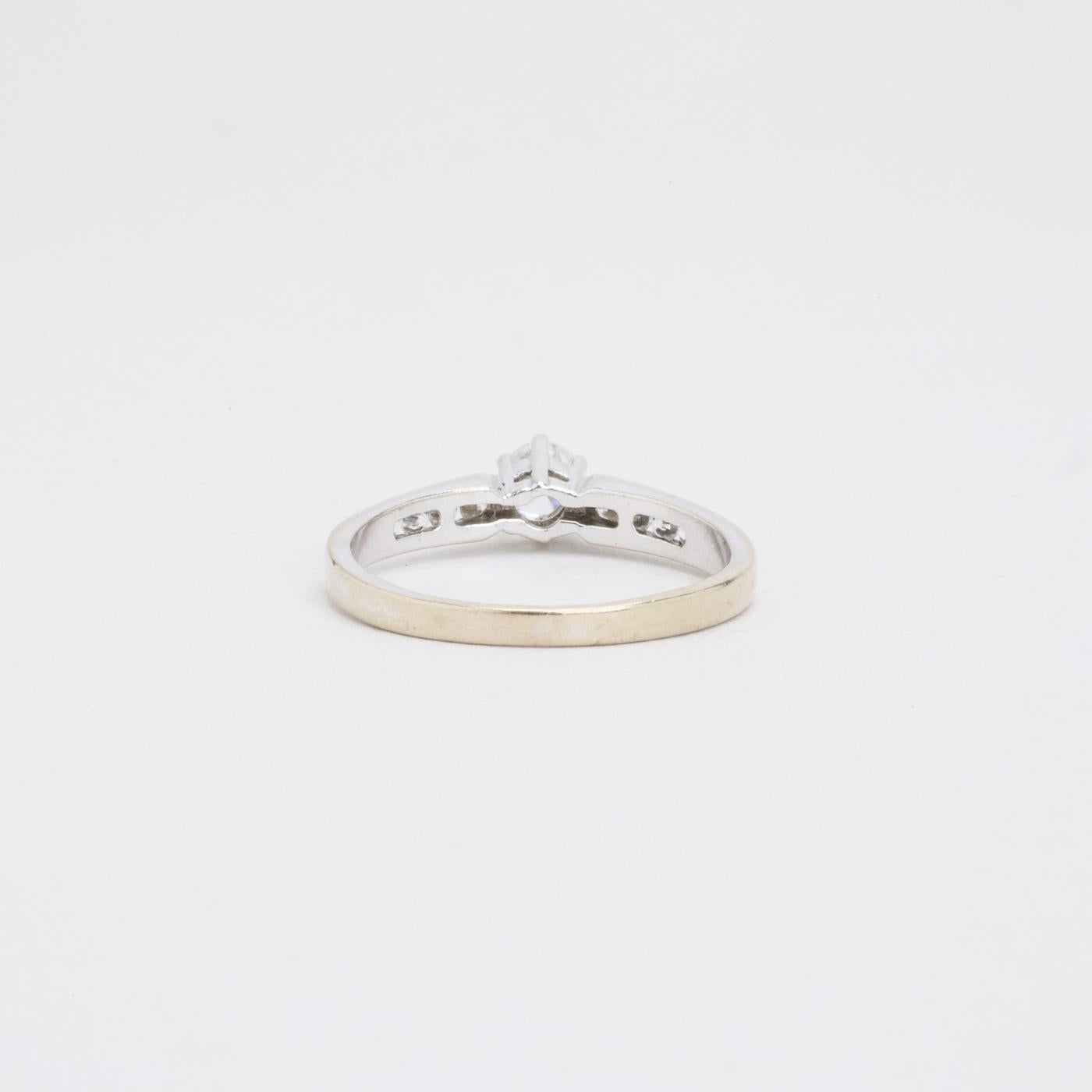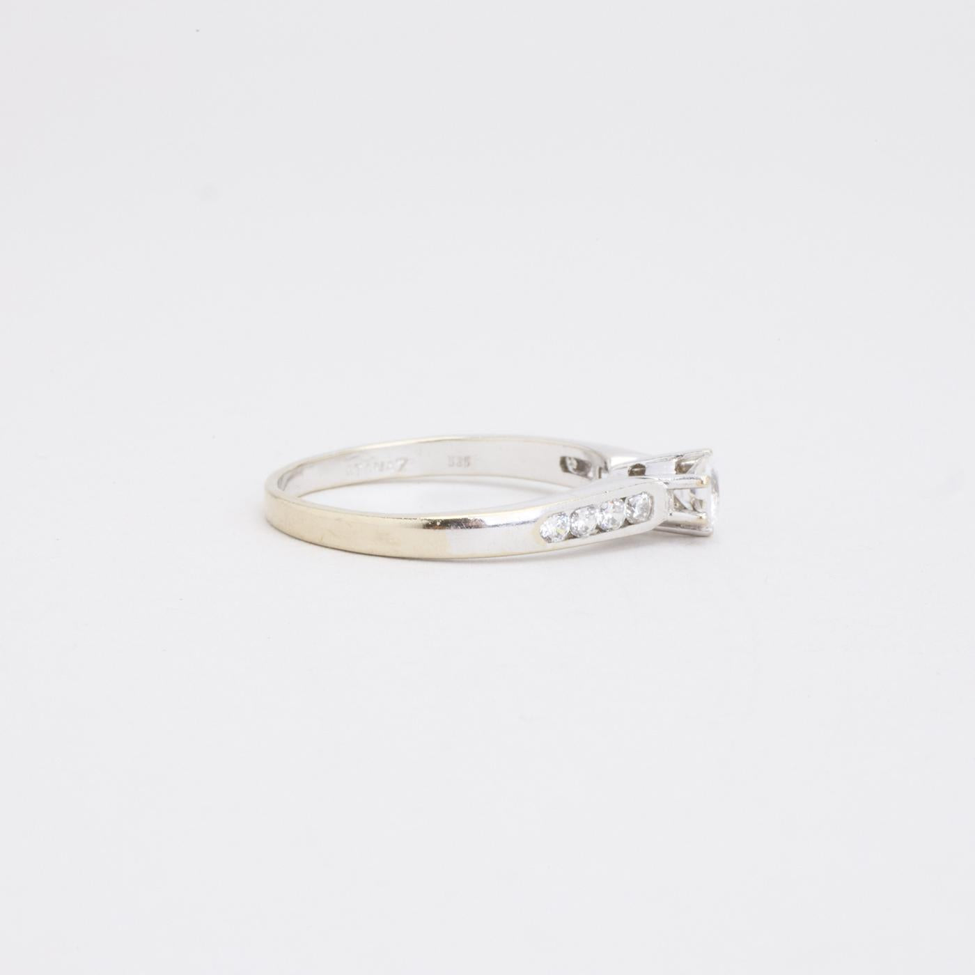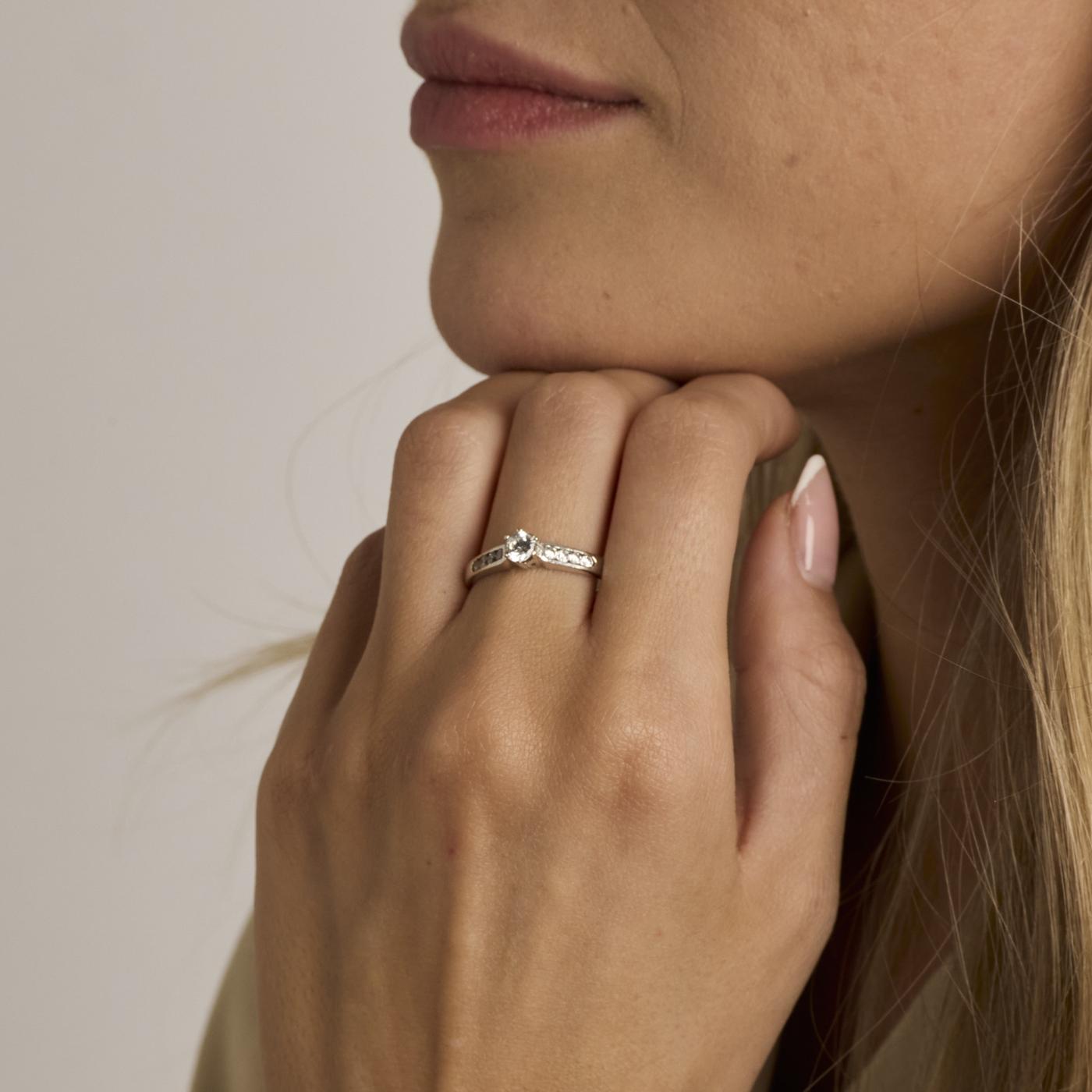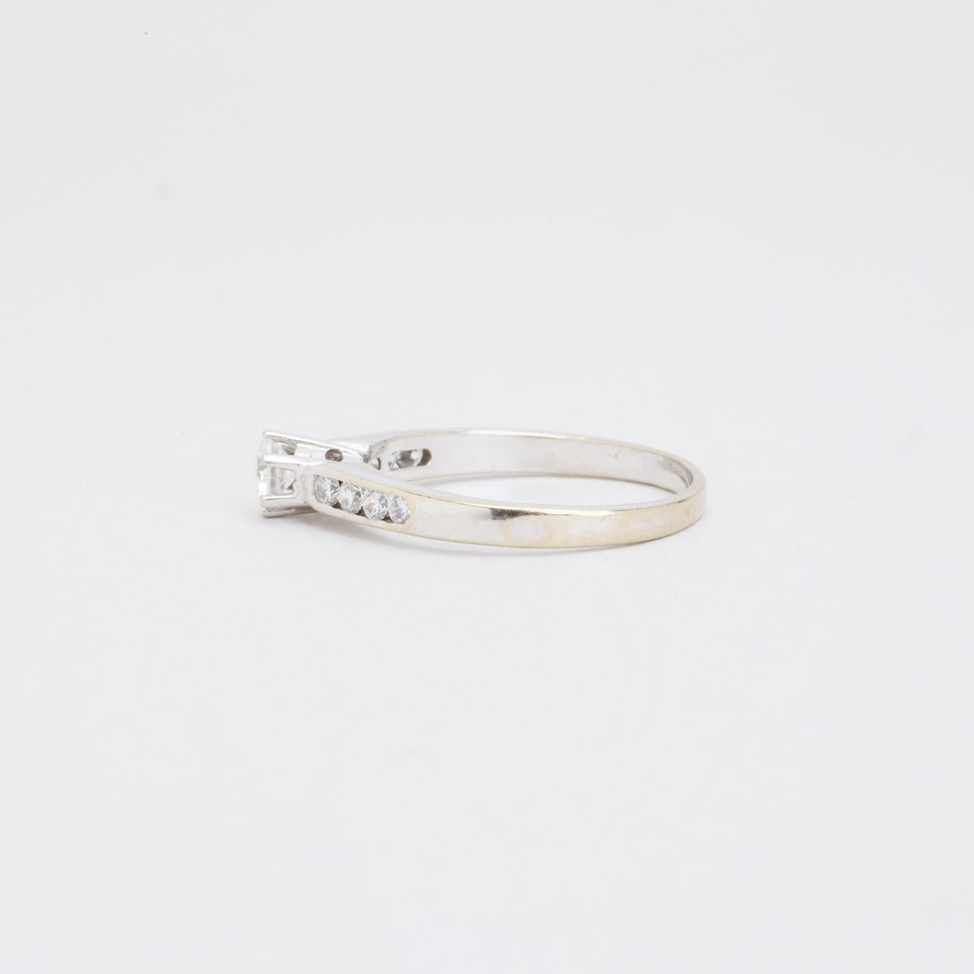 Solitaire ring i 14K hvidguld med en Zirkonia og seks mindre Zirkoniaer i kanalindfatning, Str. 57