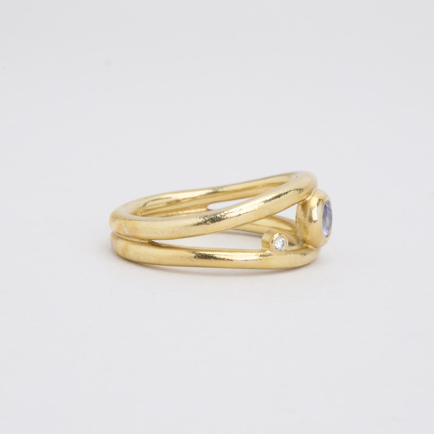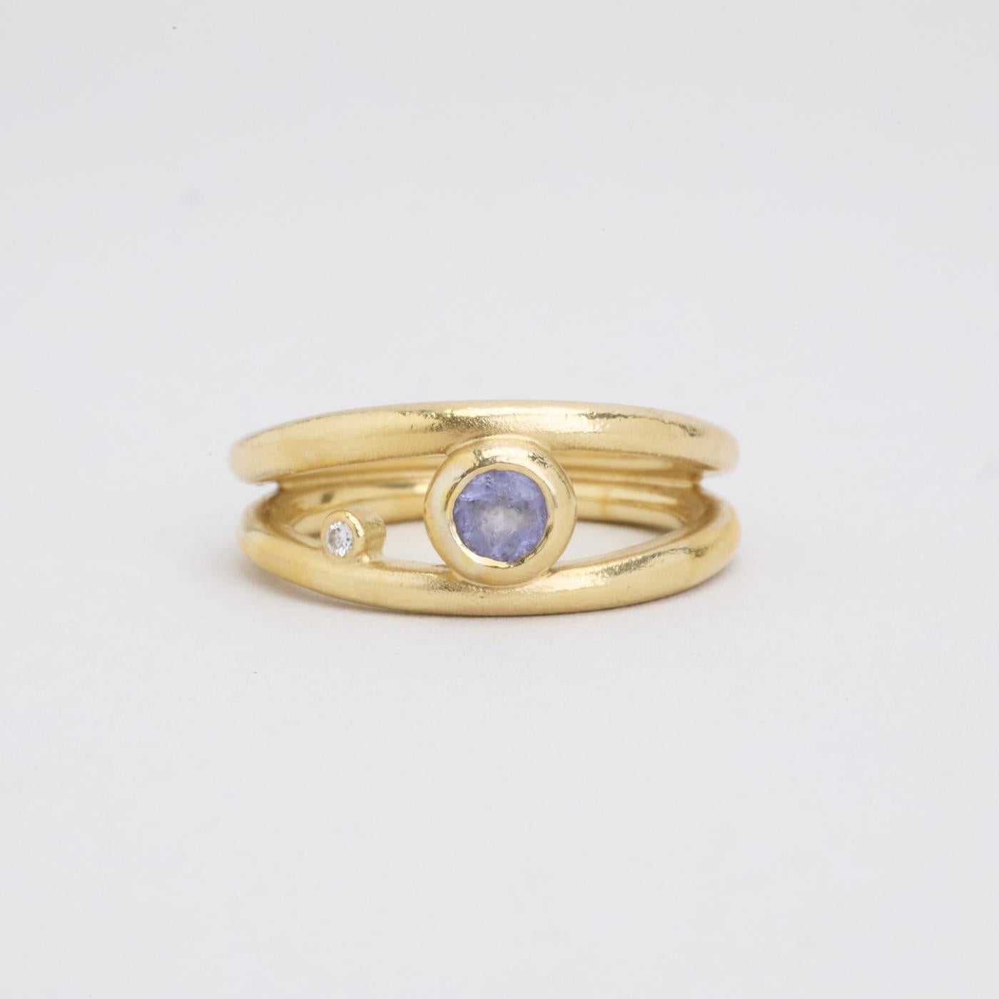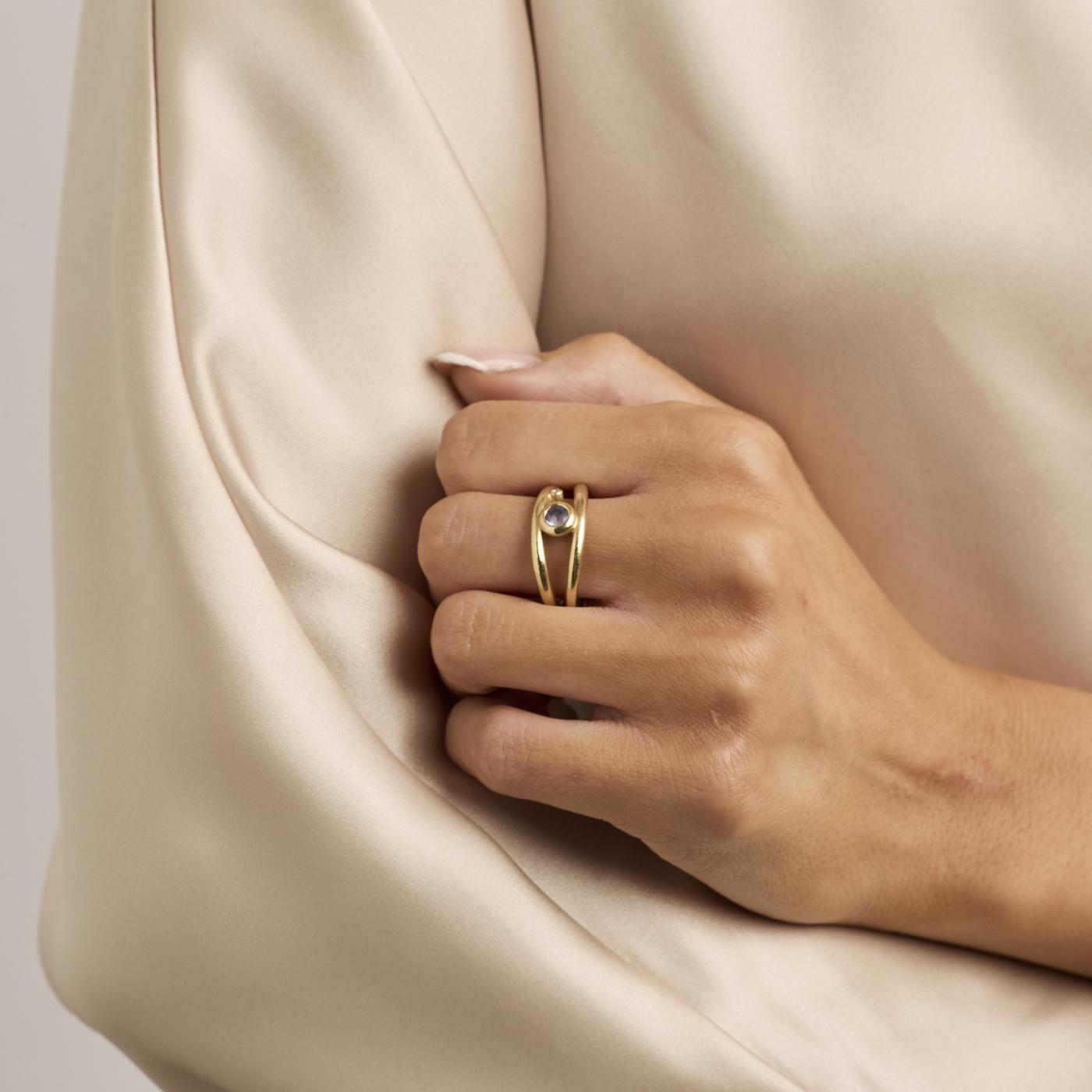 Statement ring i 14K guld, med diamant (0.02 ct) og blåviolette sten, Str. 53