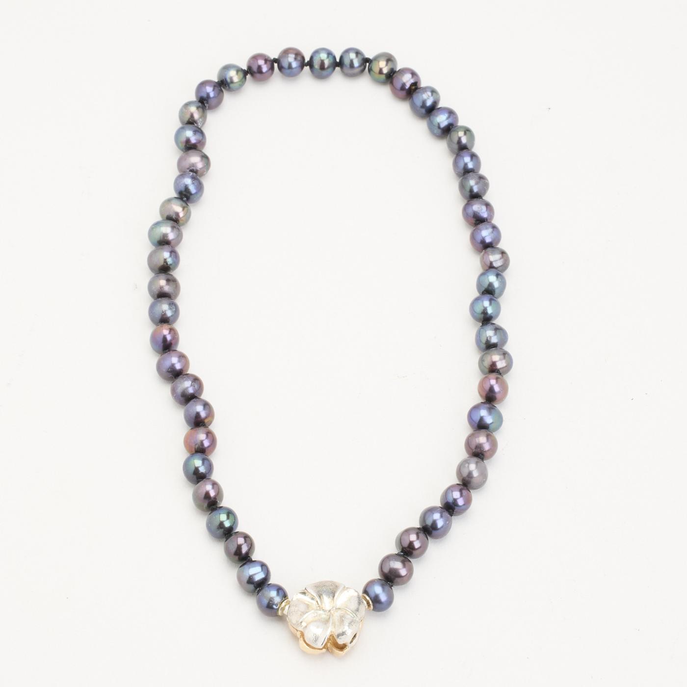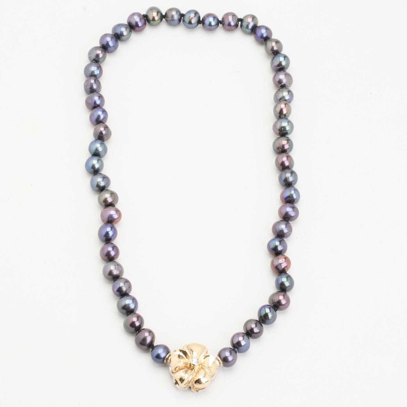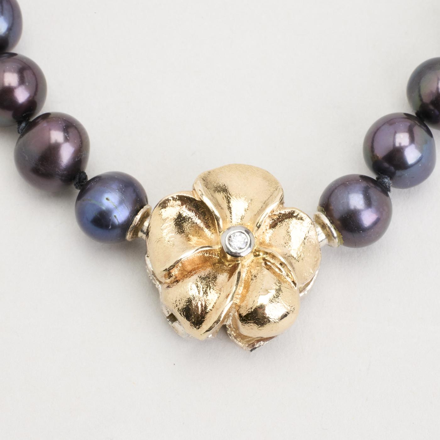 Perlehalskæde i 14K guld med blomstermotiv og diamant (0.03 ct), 43 cm