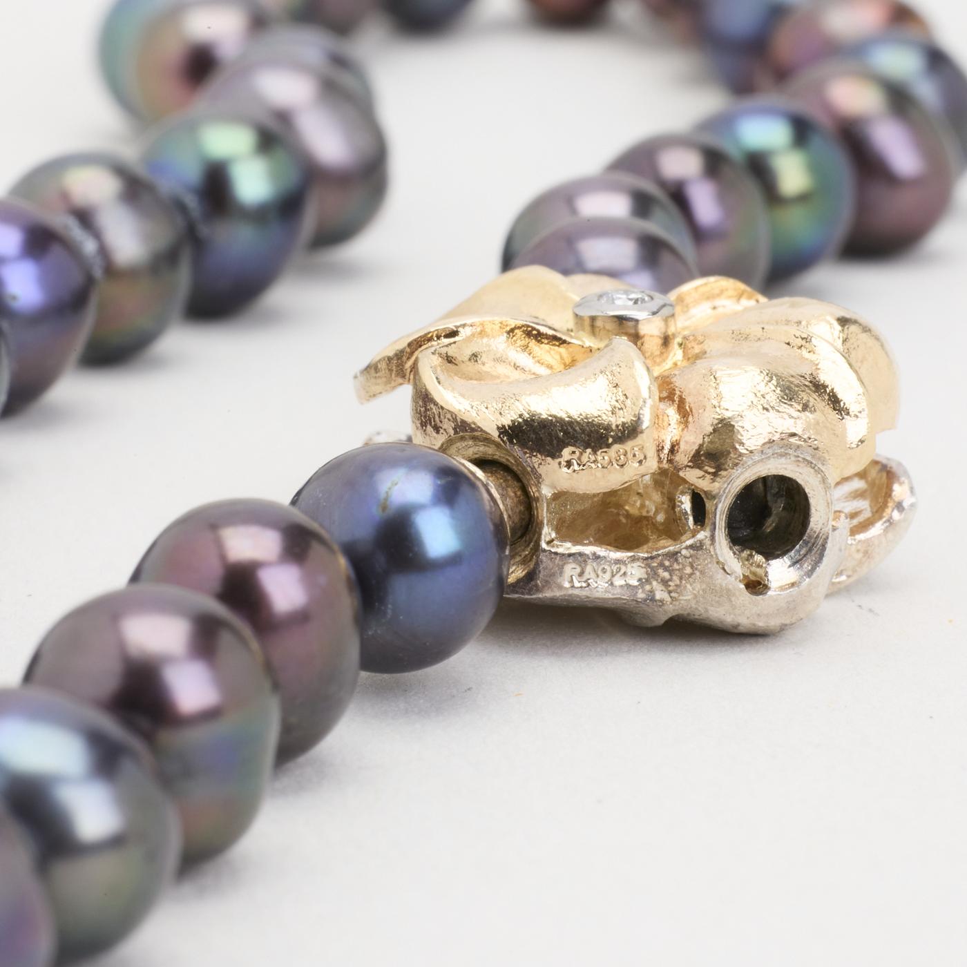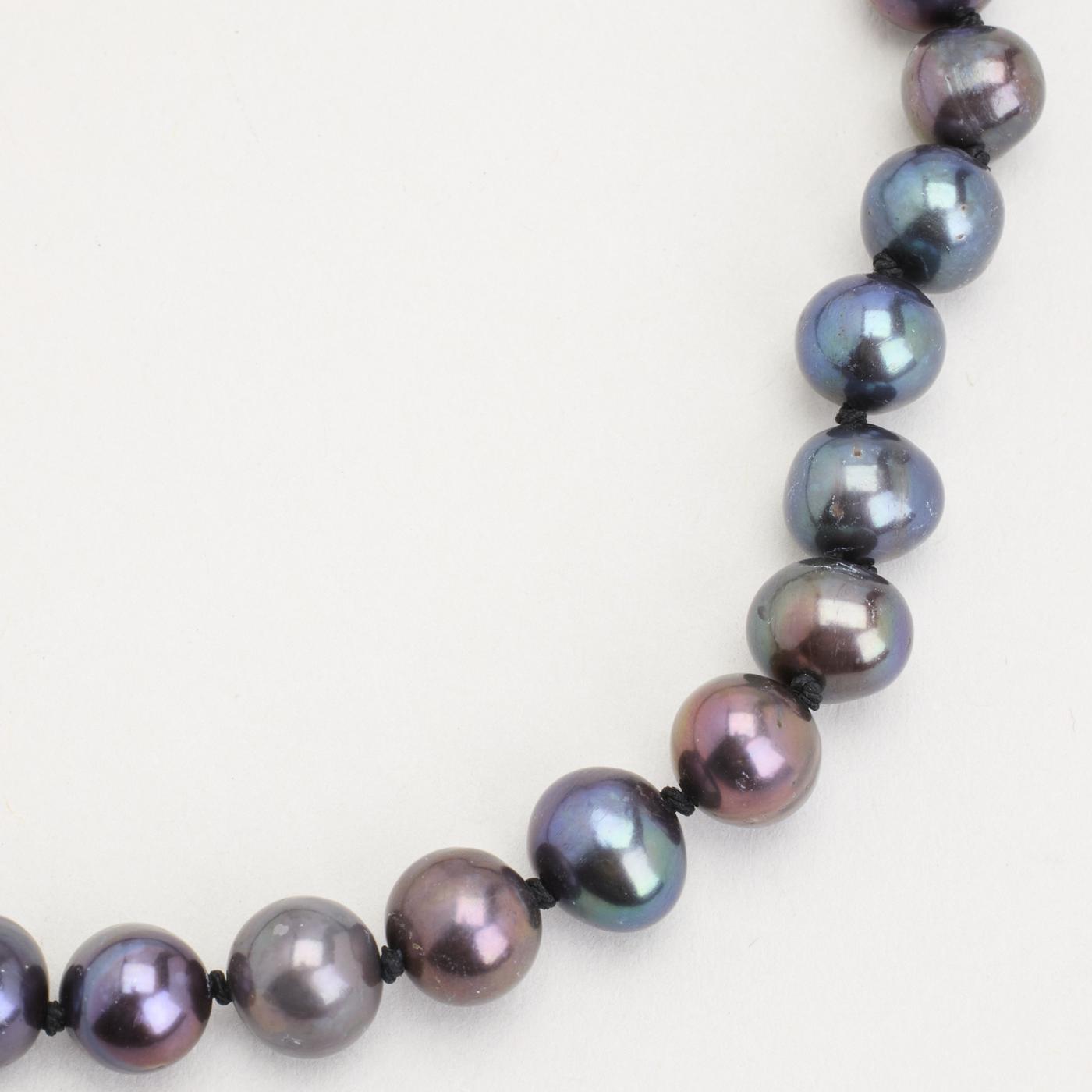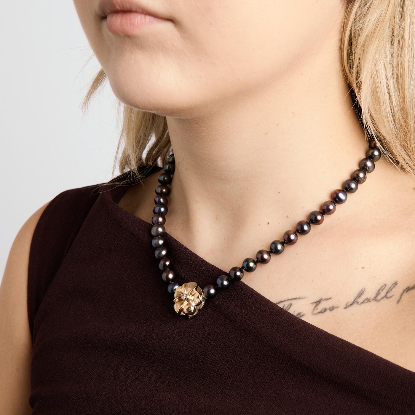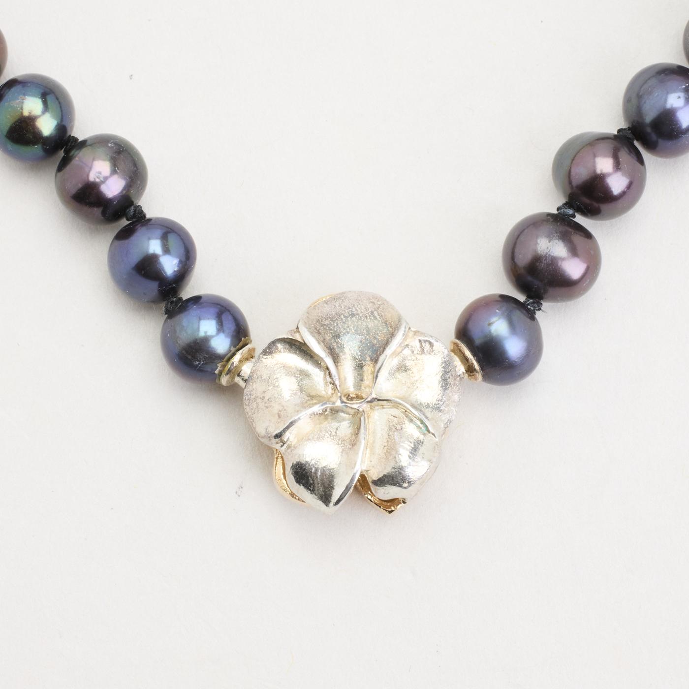 Perlehalskæde i 14K guld med blomstermotiv og diamant (0.03 ct), 43 cm