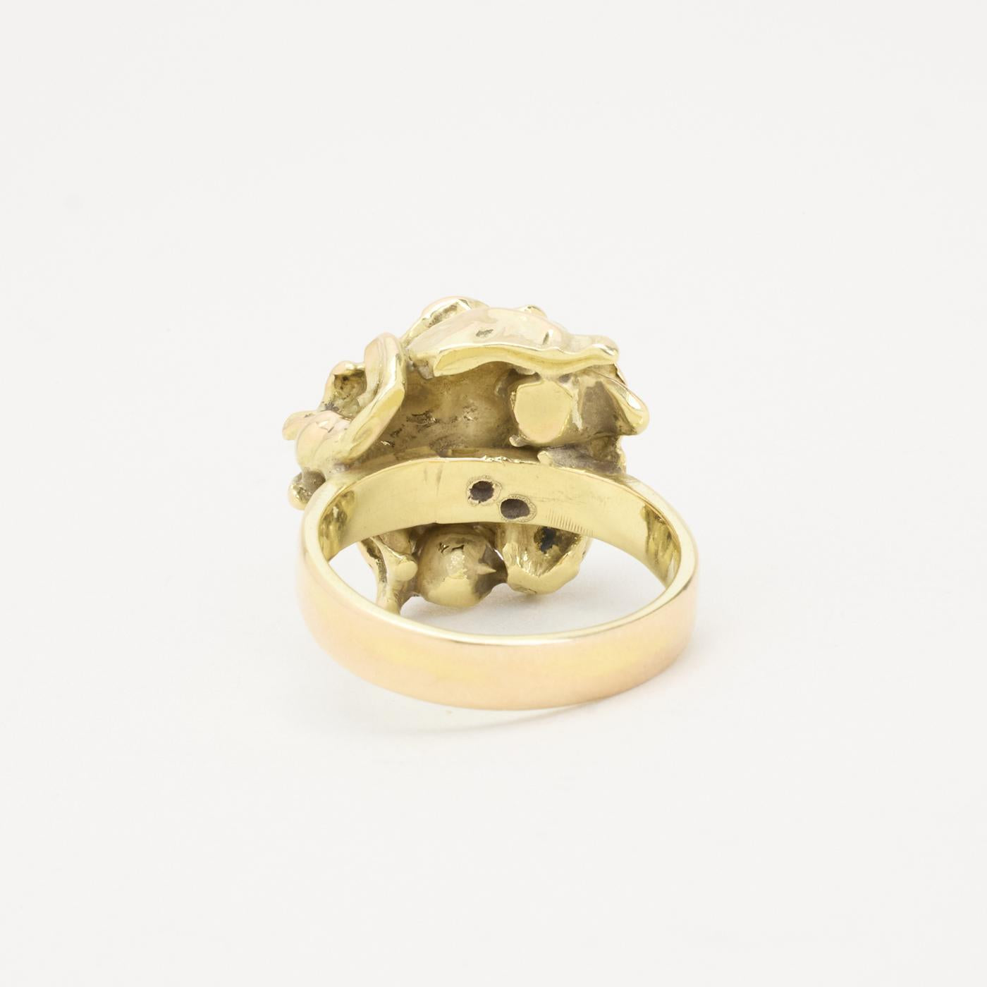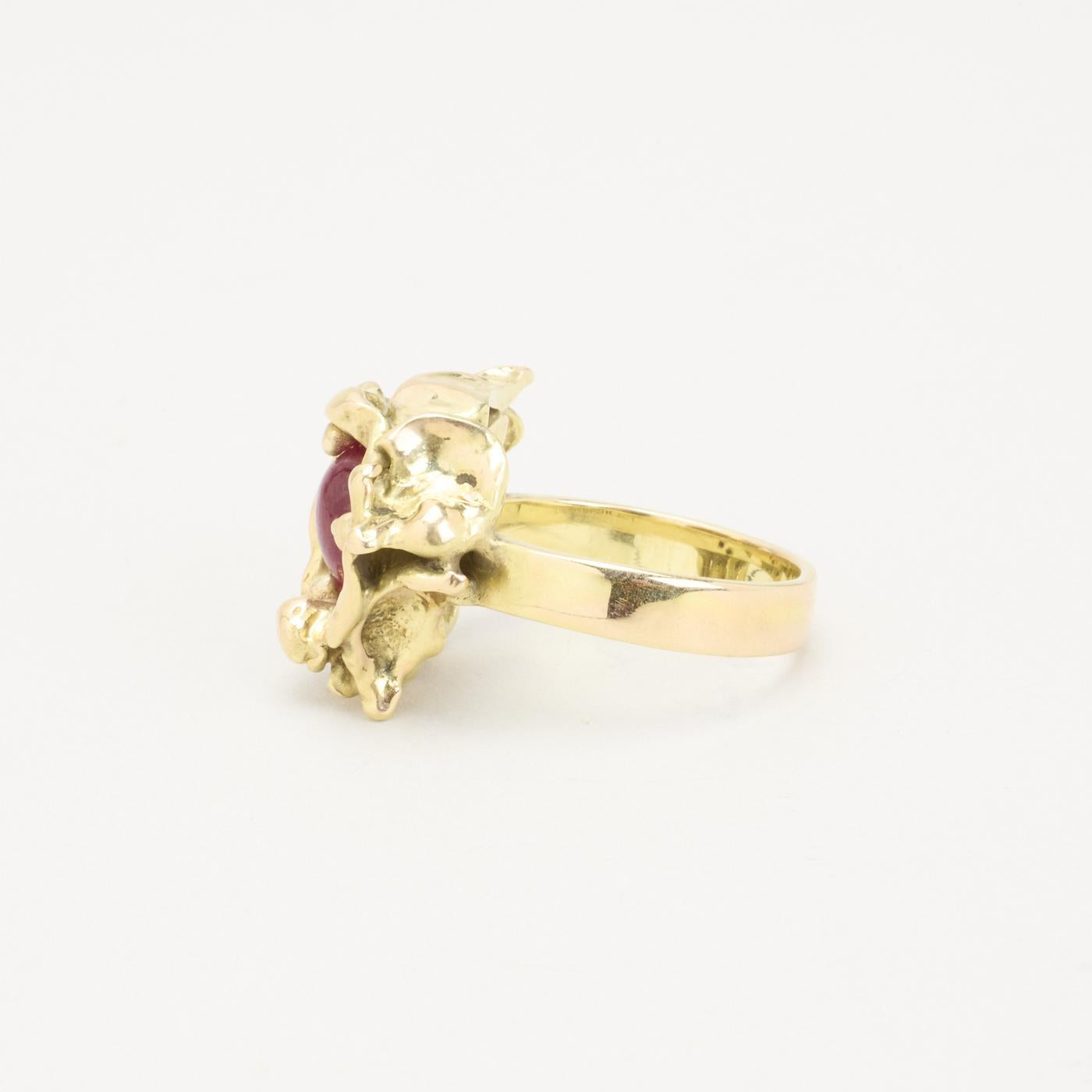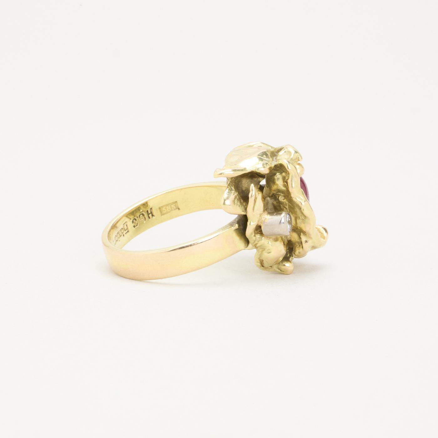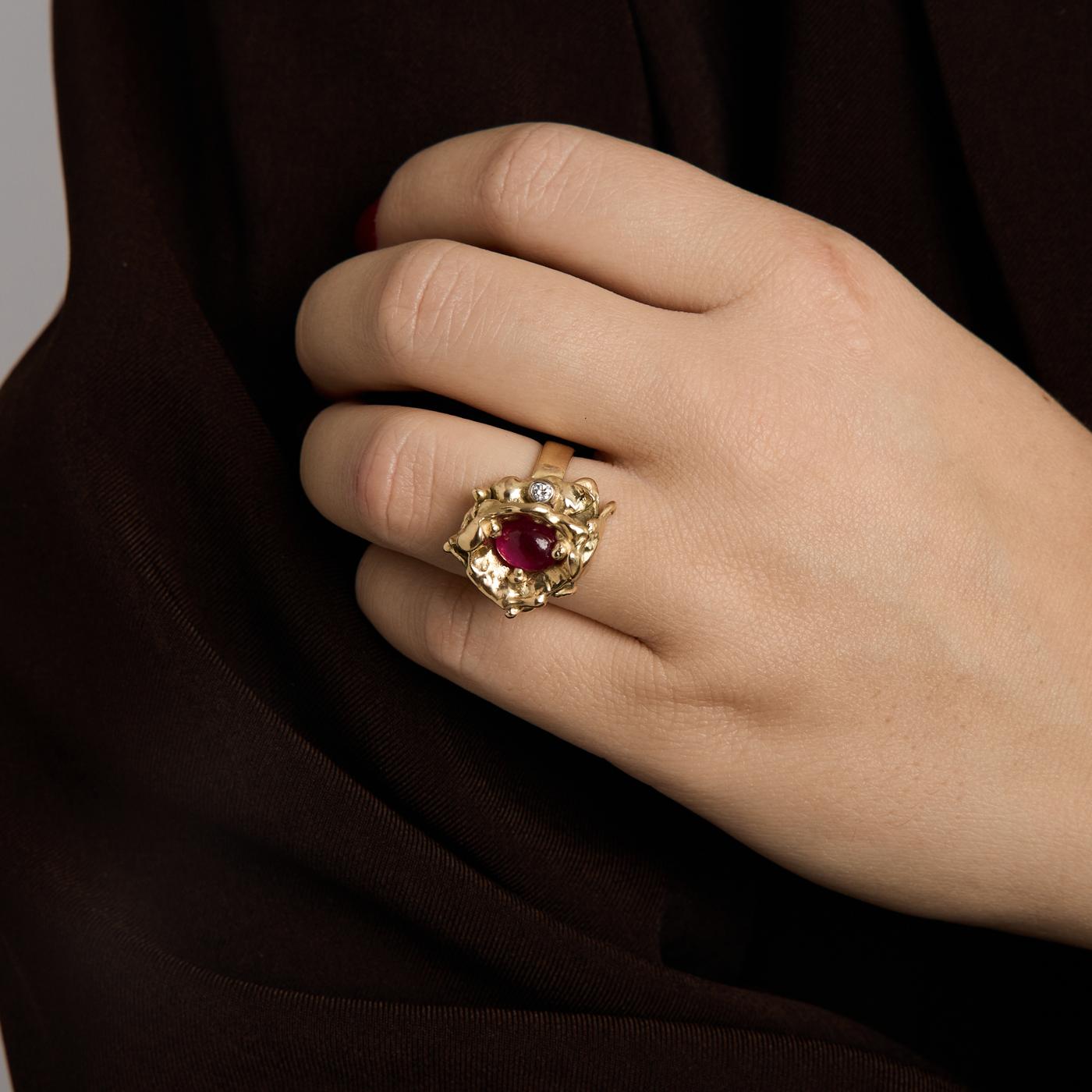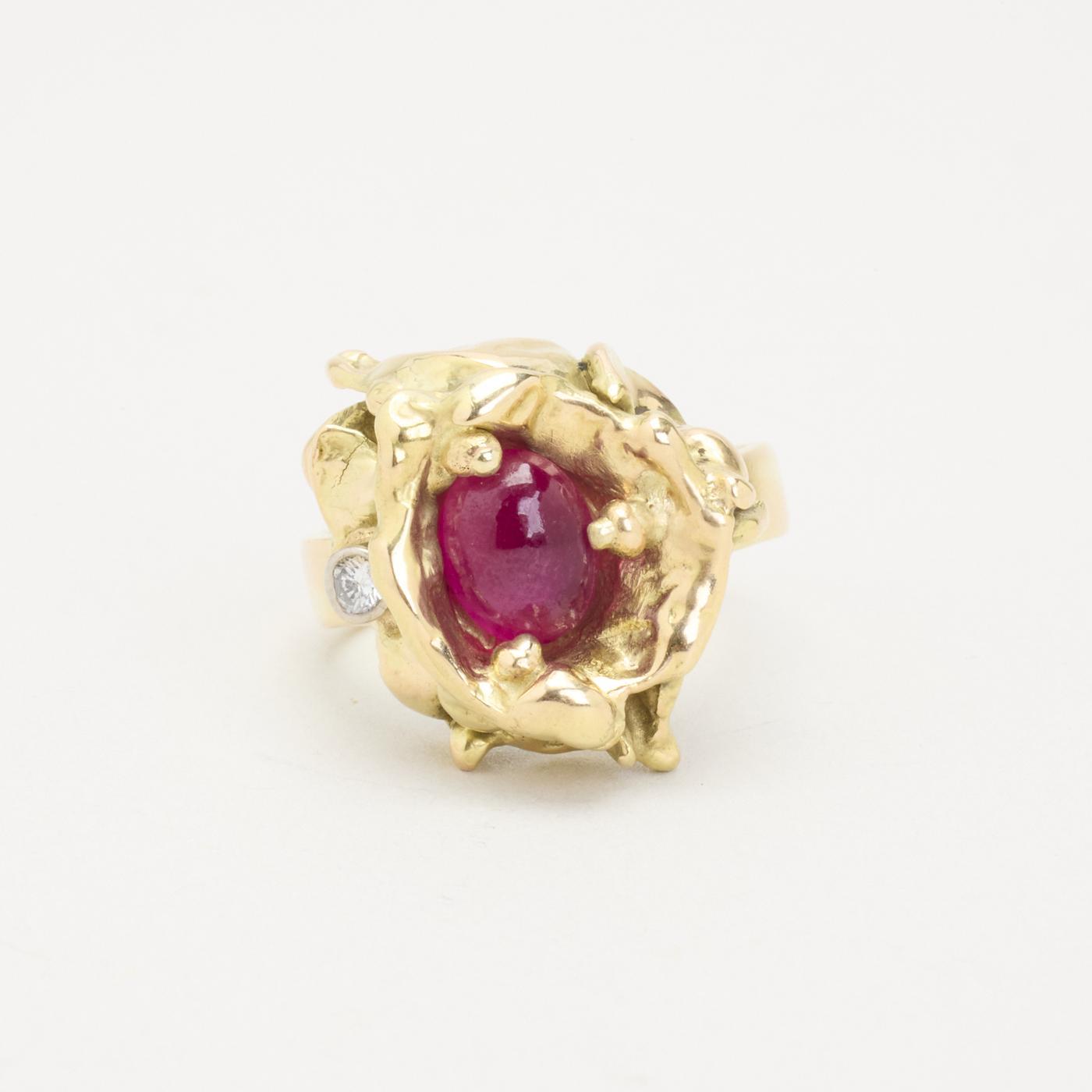 Cocktailring i 14K guld med en diamant (0.06 ct) og en syntetisk rubin, Str. 55