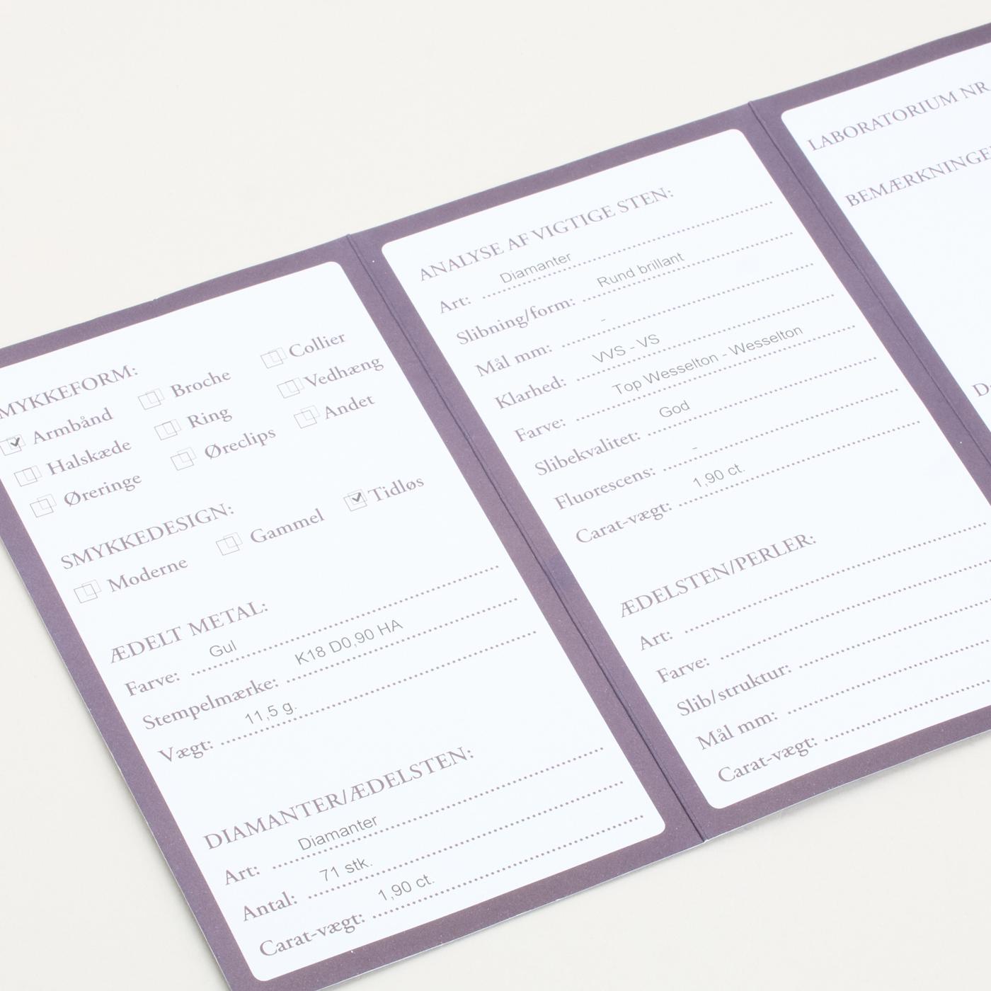 Diamanter: 1.90 ct. totalt fordelt på 71 naturlige sten. og 71 x 0.03 ct. Farve Top Wesselton-Wesselton. Klarhed VVS-VS