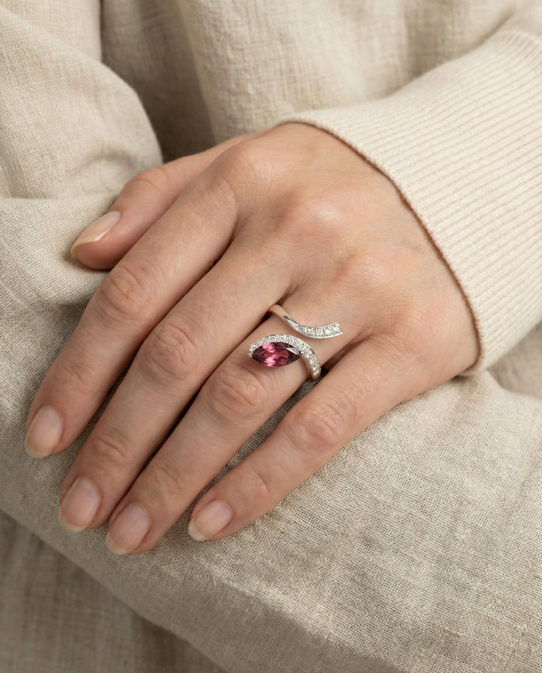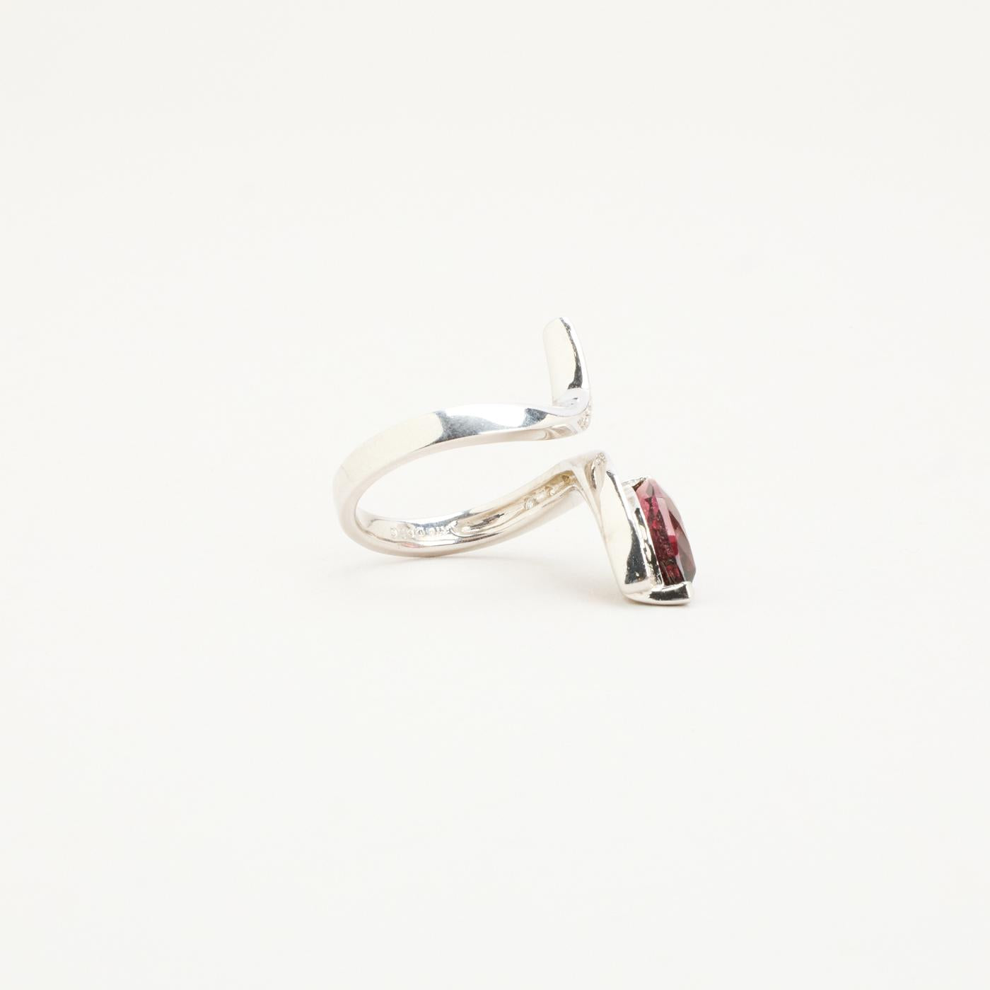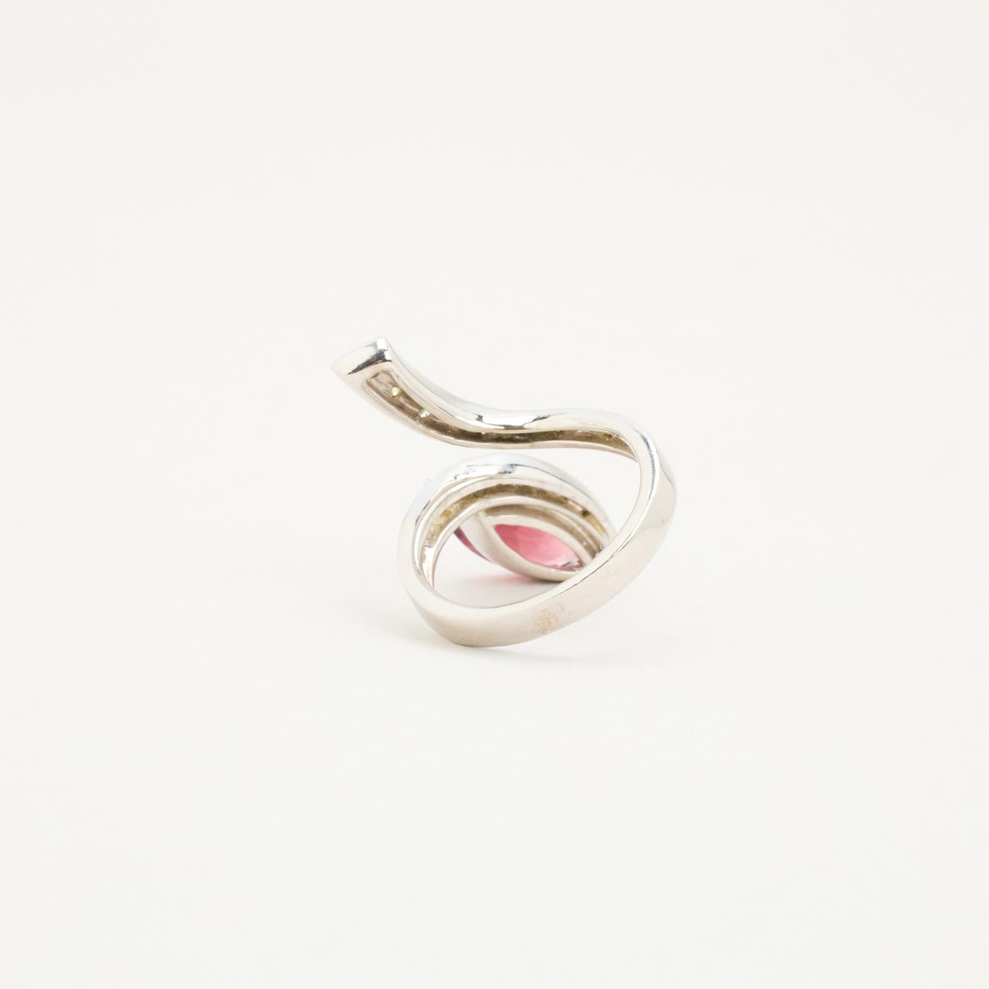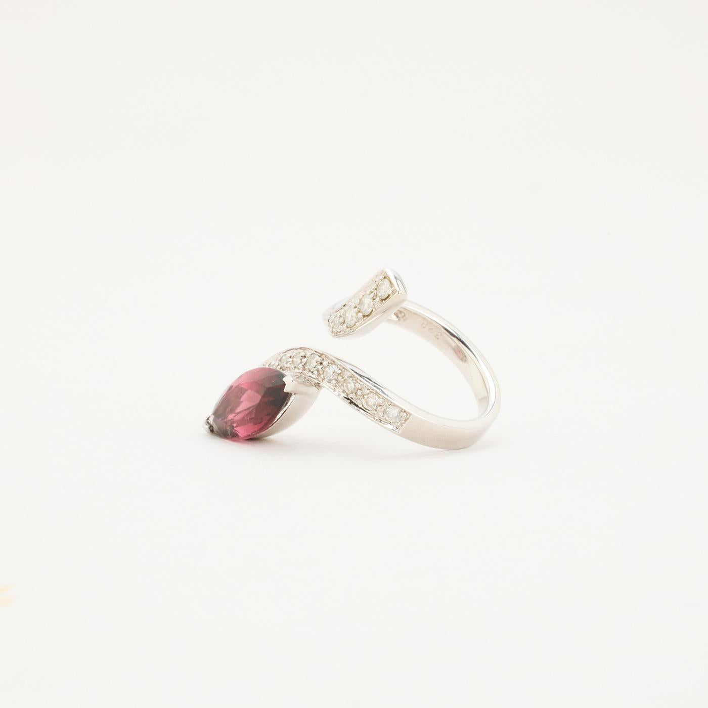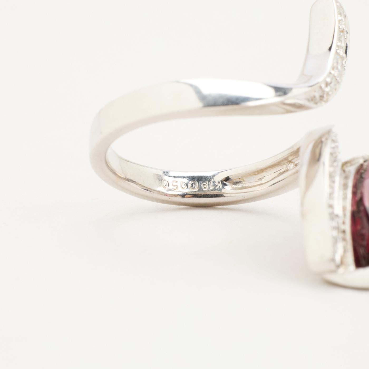 Crossoverring i 18K hvidguld med en violet sten og diamanter (0.50 ct), Str. 53