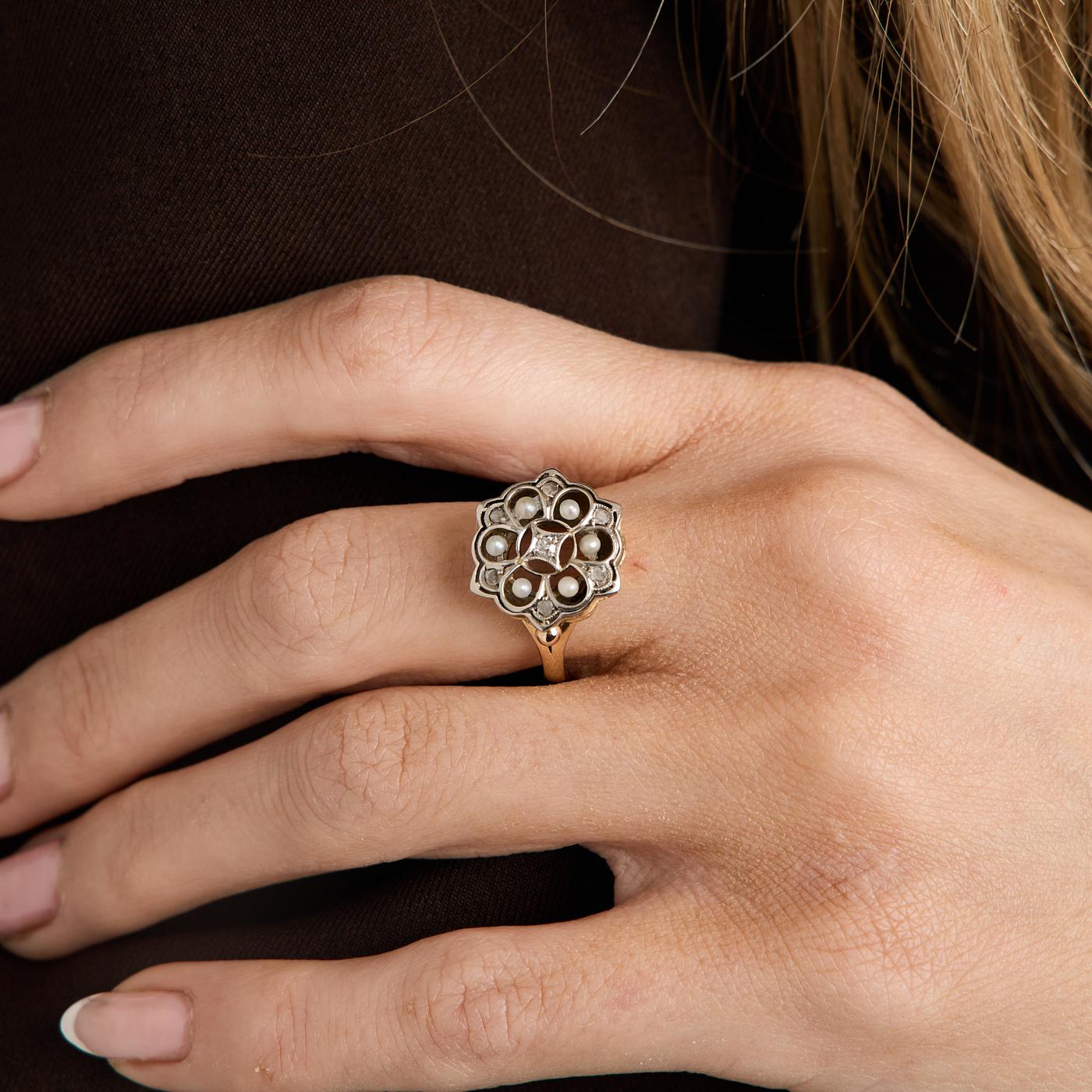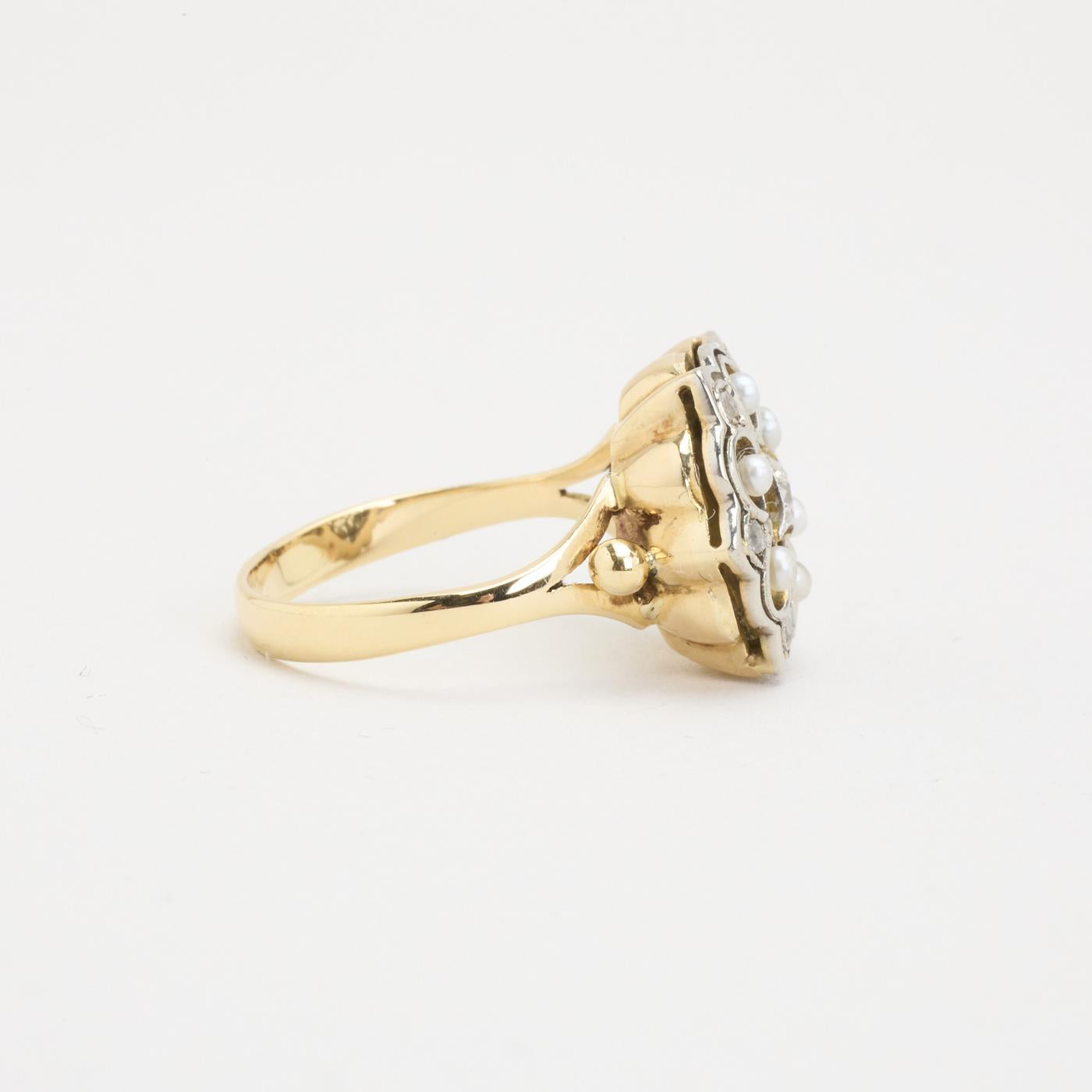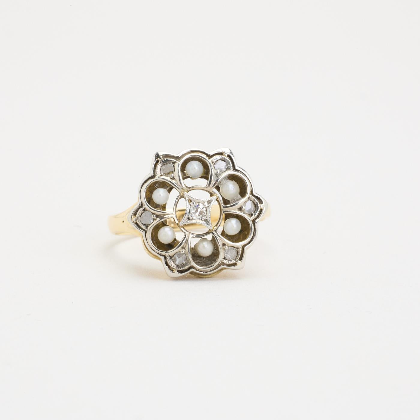 Rosetring i 18K guld og hvidguld med diamanter (0.05 ct) og perler, Str. 53