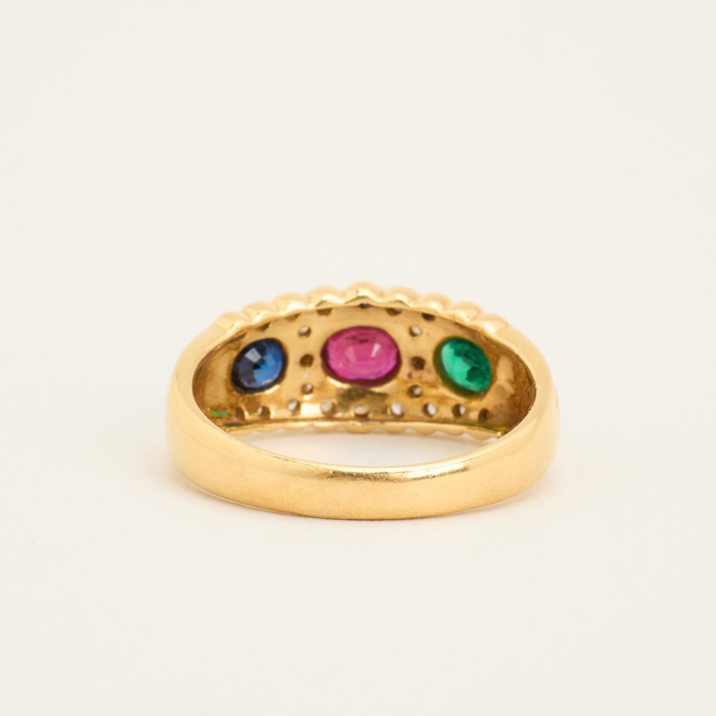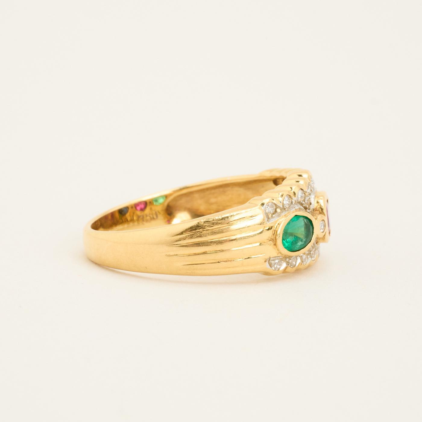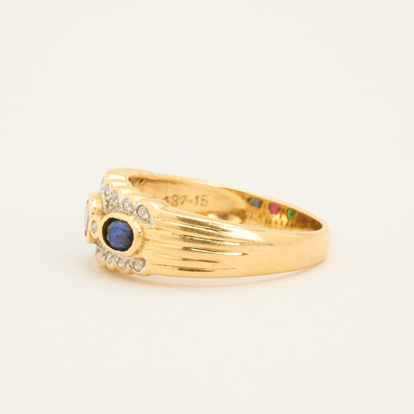 Gypsyring i 18K guld med flere hvide sten, én rød sten, én grøn sten, én blå sten og en diamant (0.07 ct), Str. 57