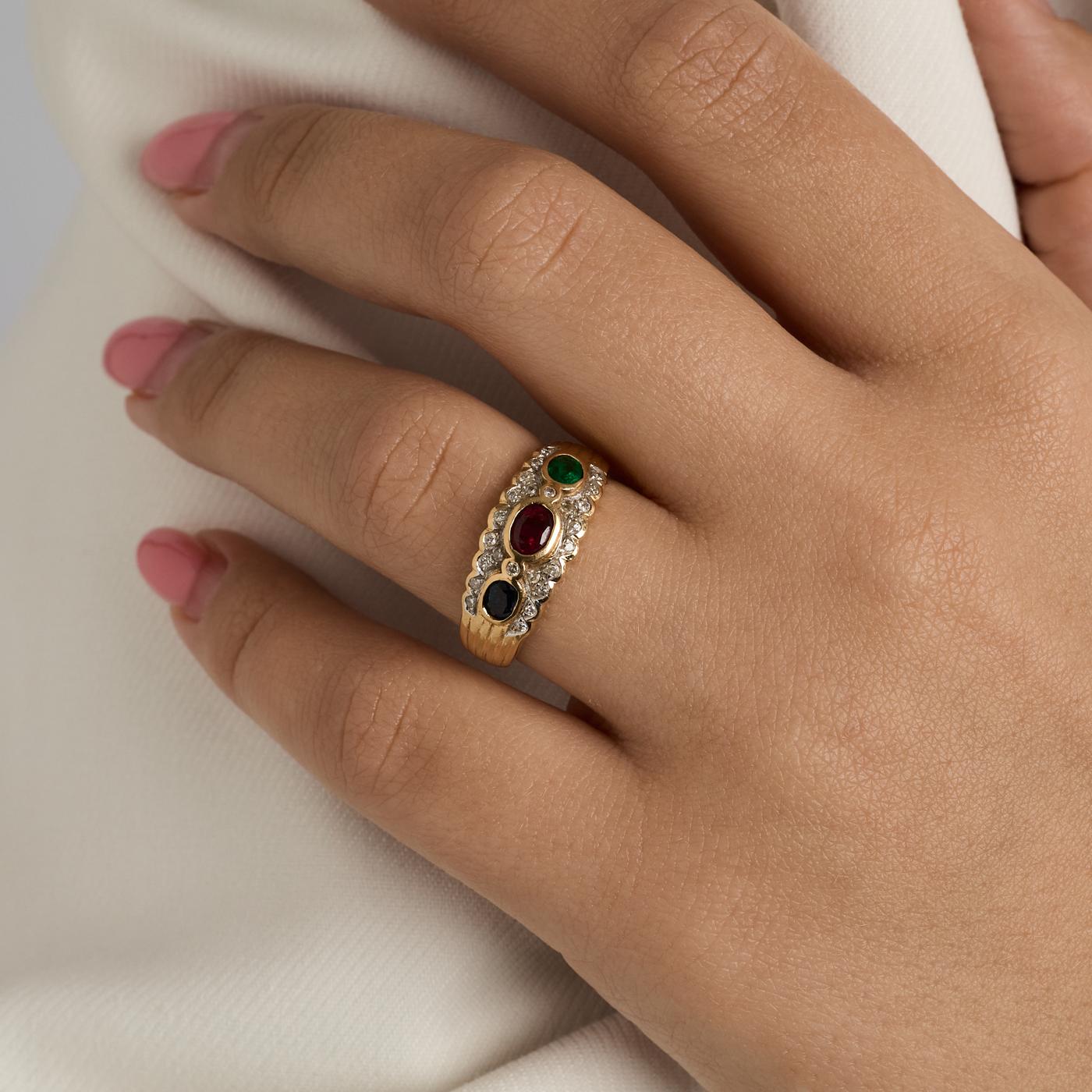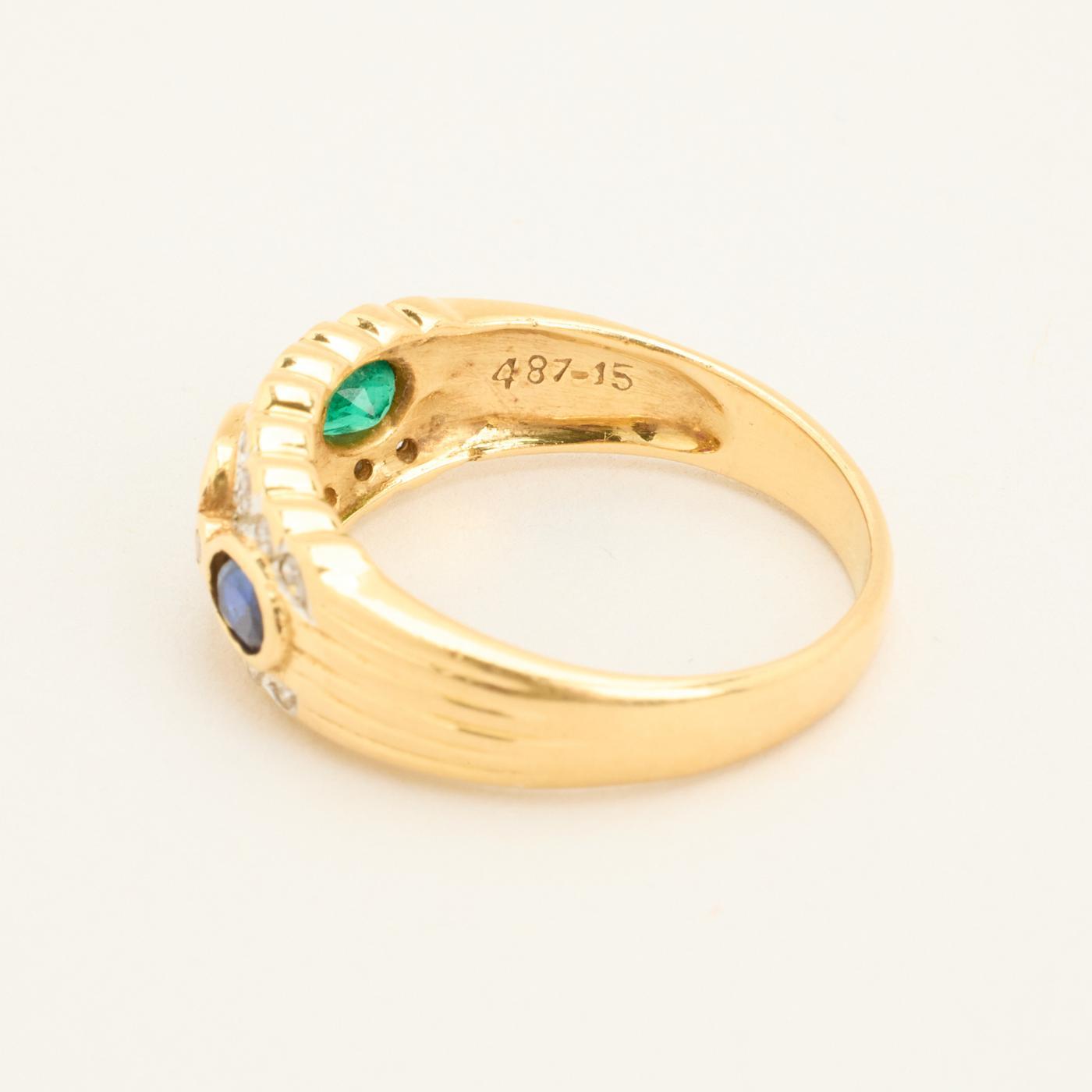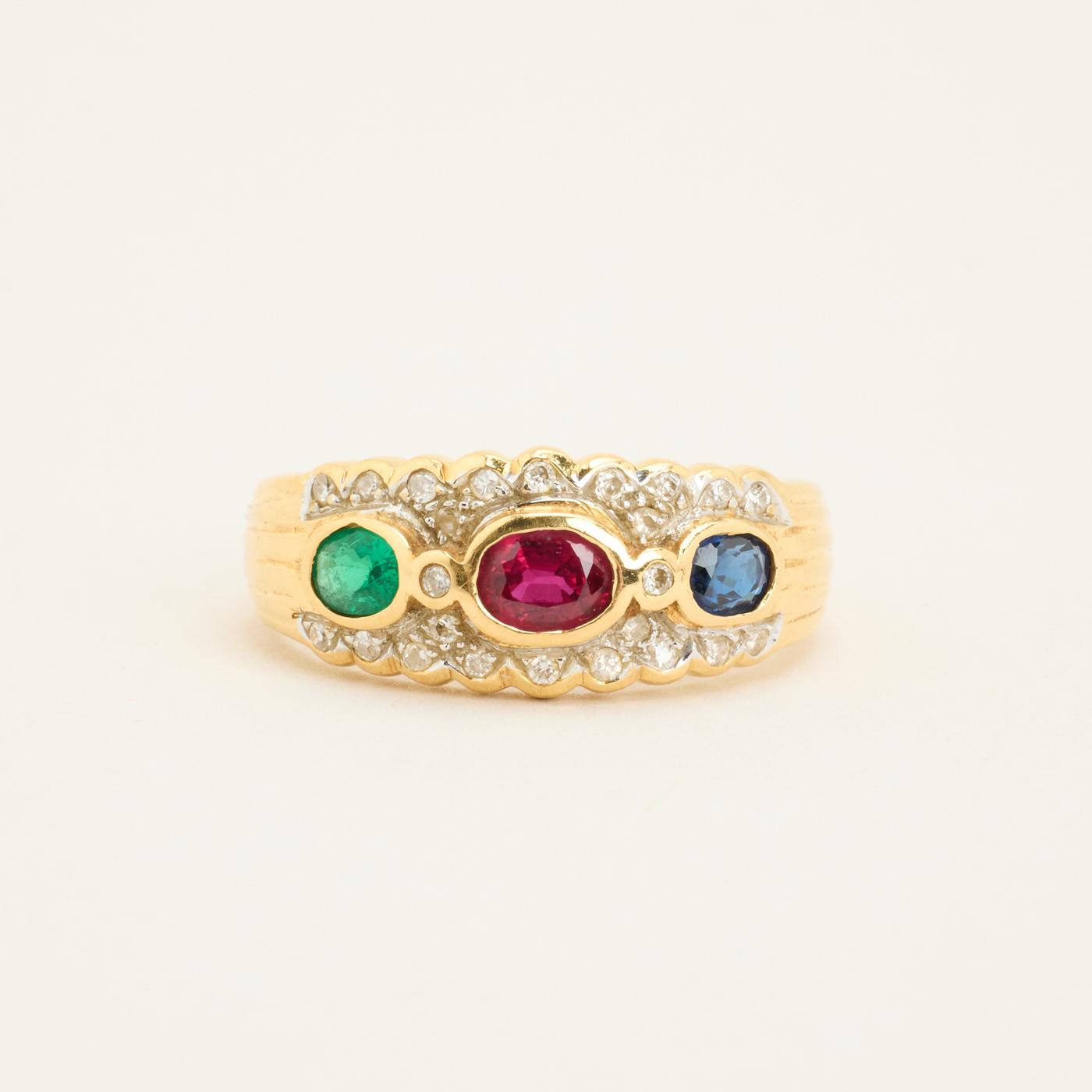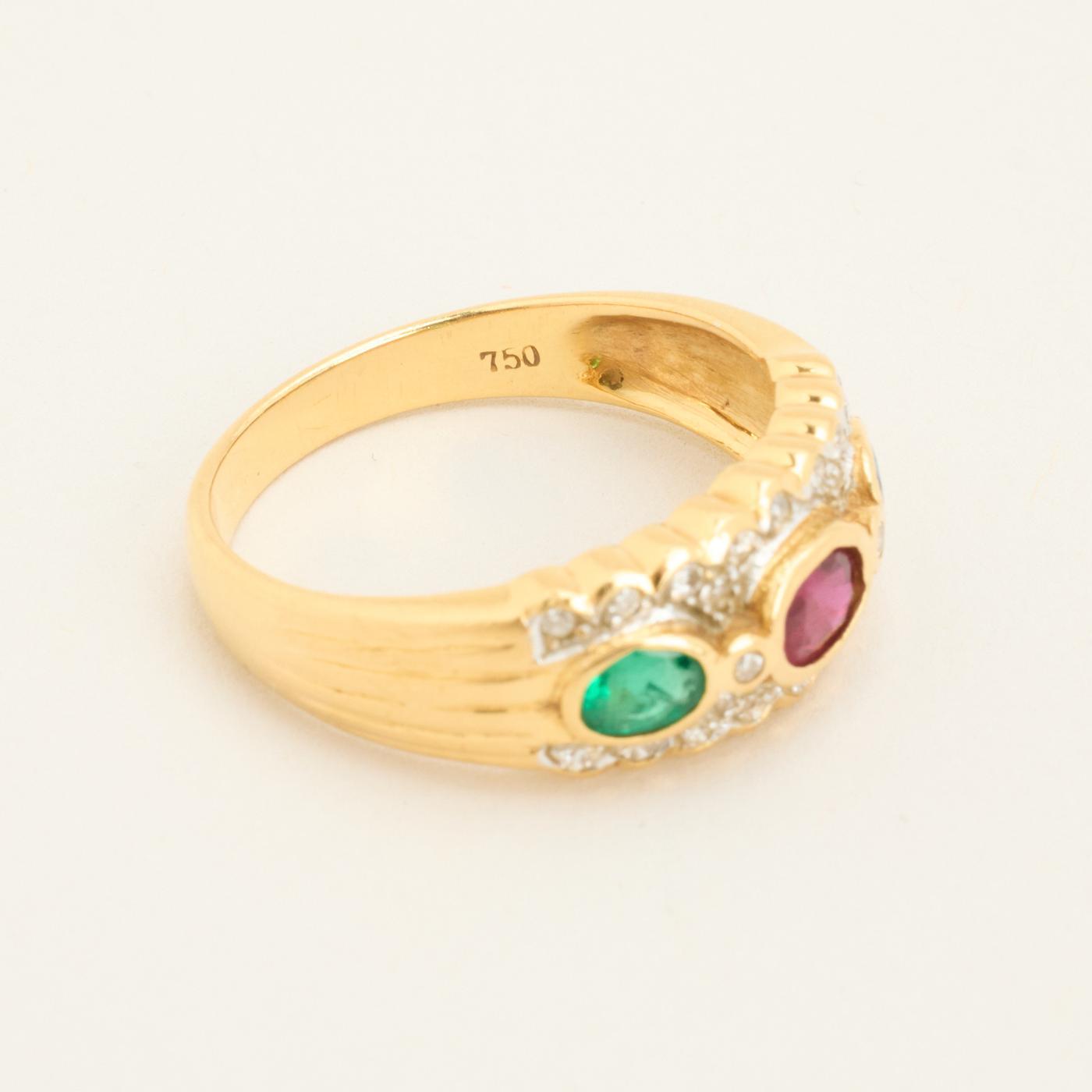 Gypsyring i 18K guld med flere hvide sten, én rød sten, én grøn sten, én blå sten og en diamant (0.07 ct), Str. 57