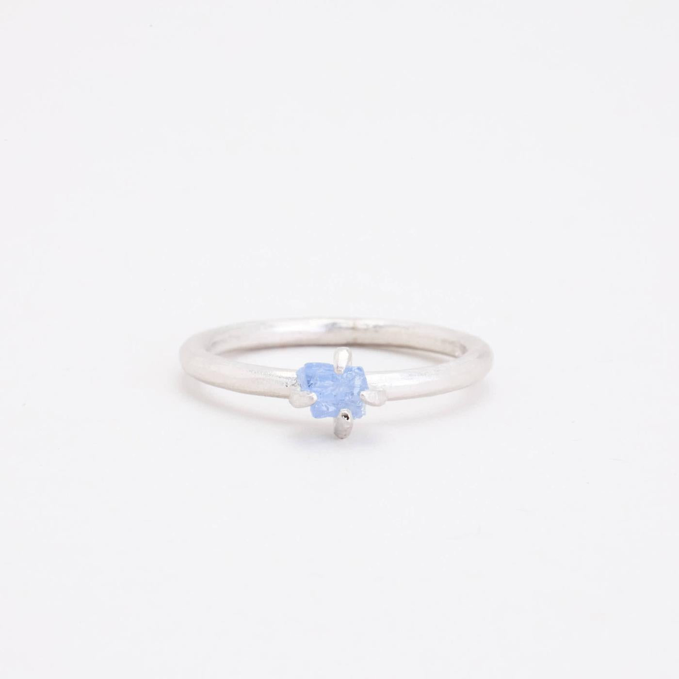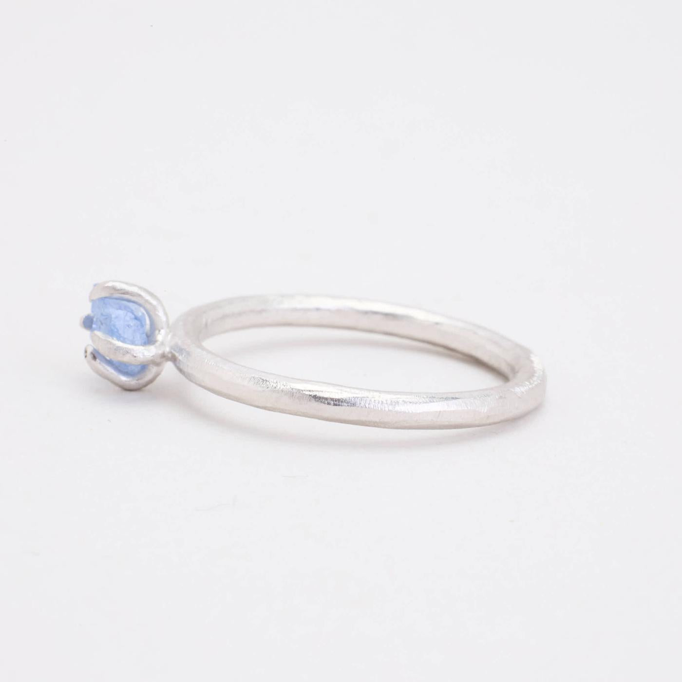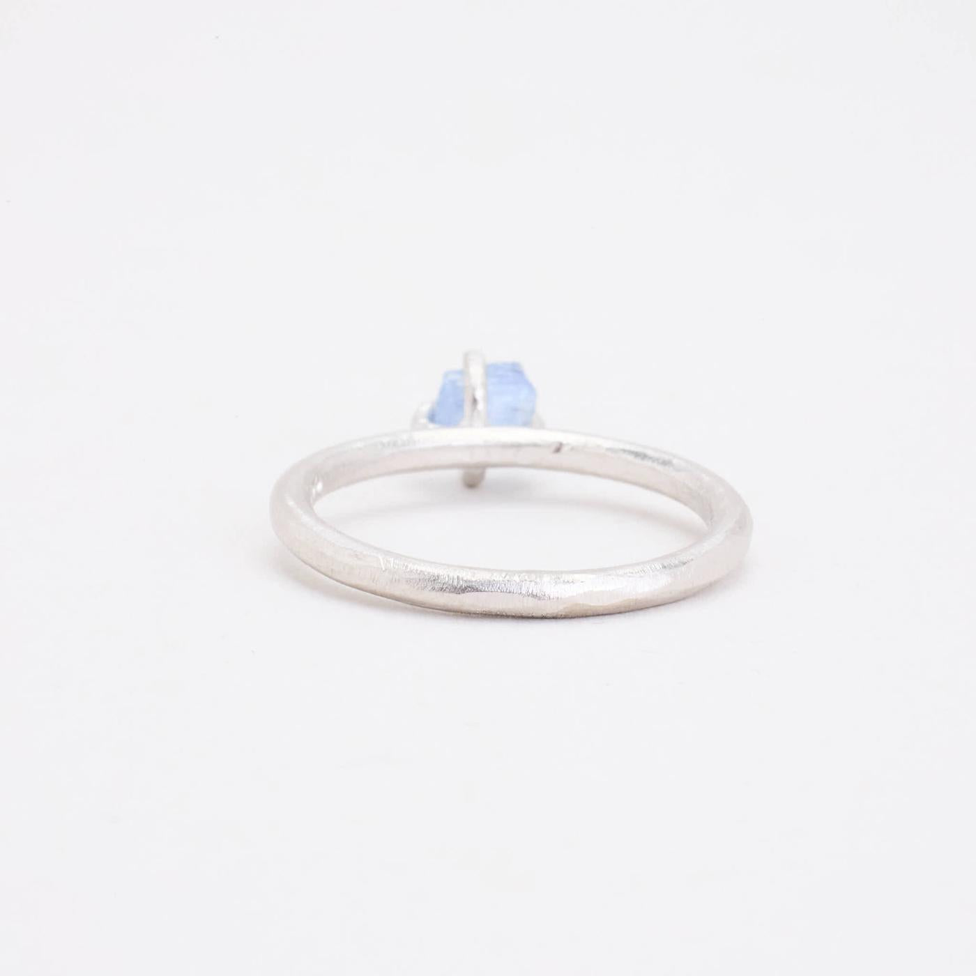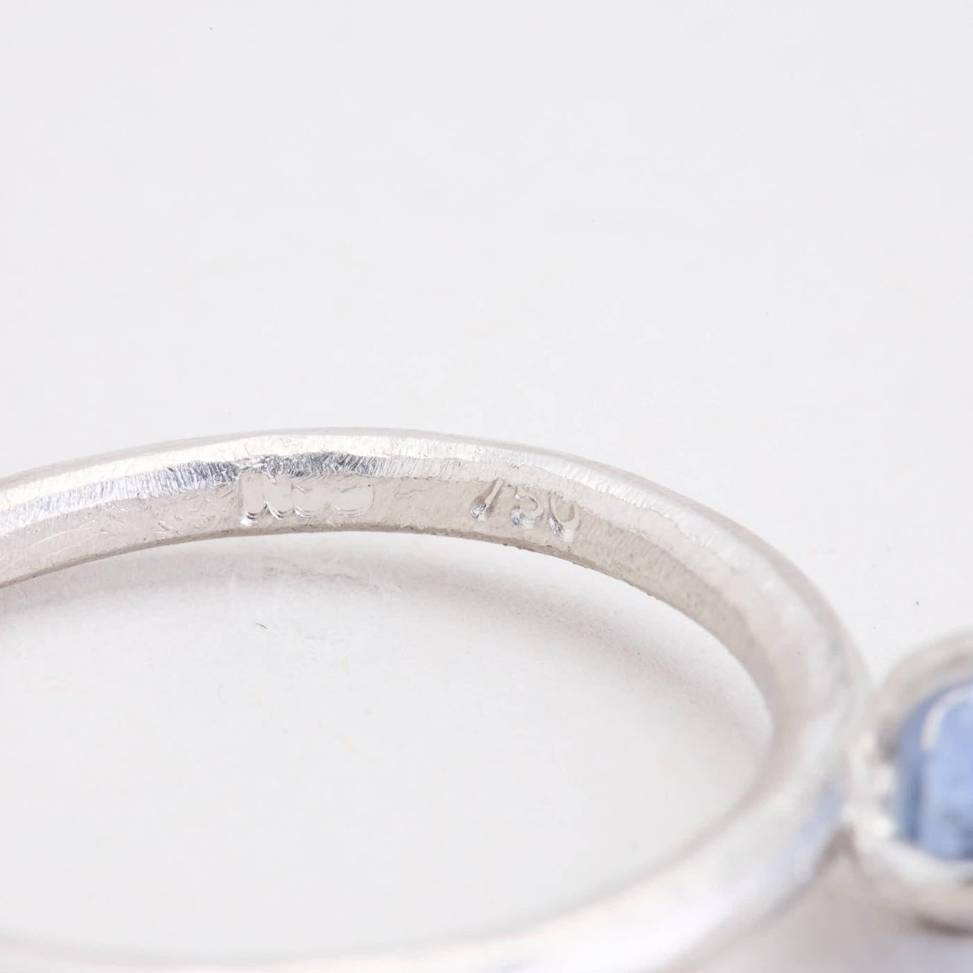 Solitairering i 18K hvidguld med lyseblå sten, str. 54, 3 g