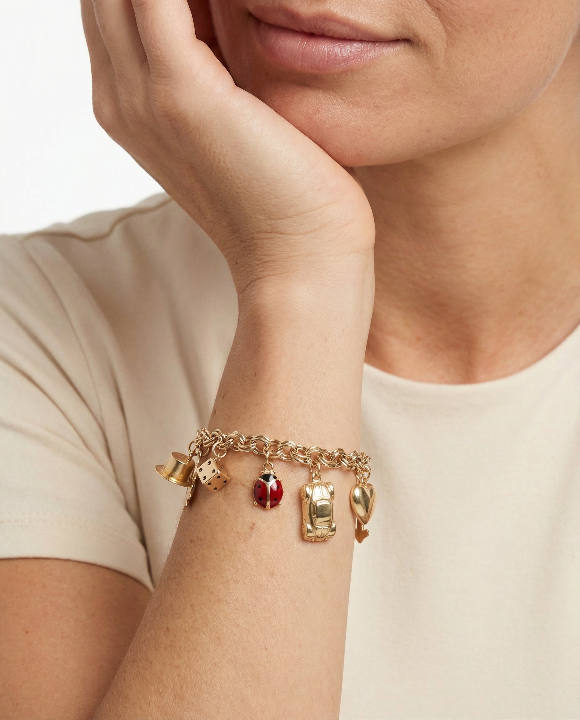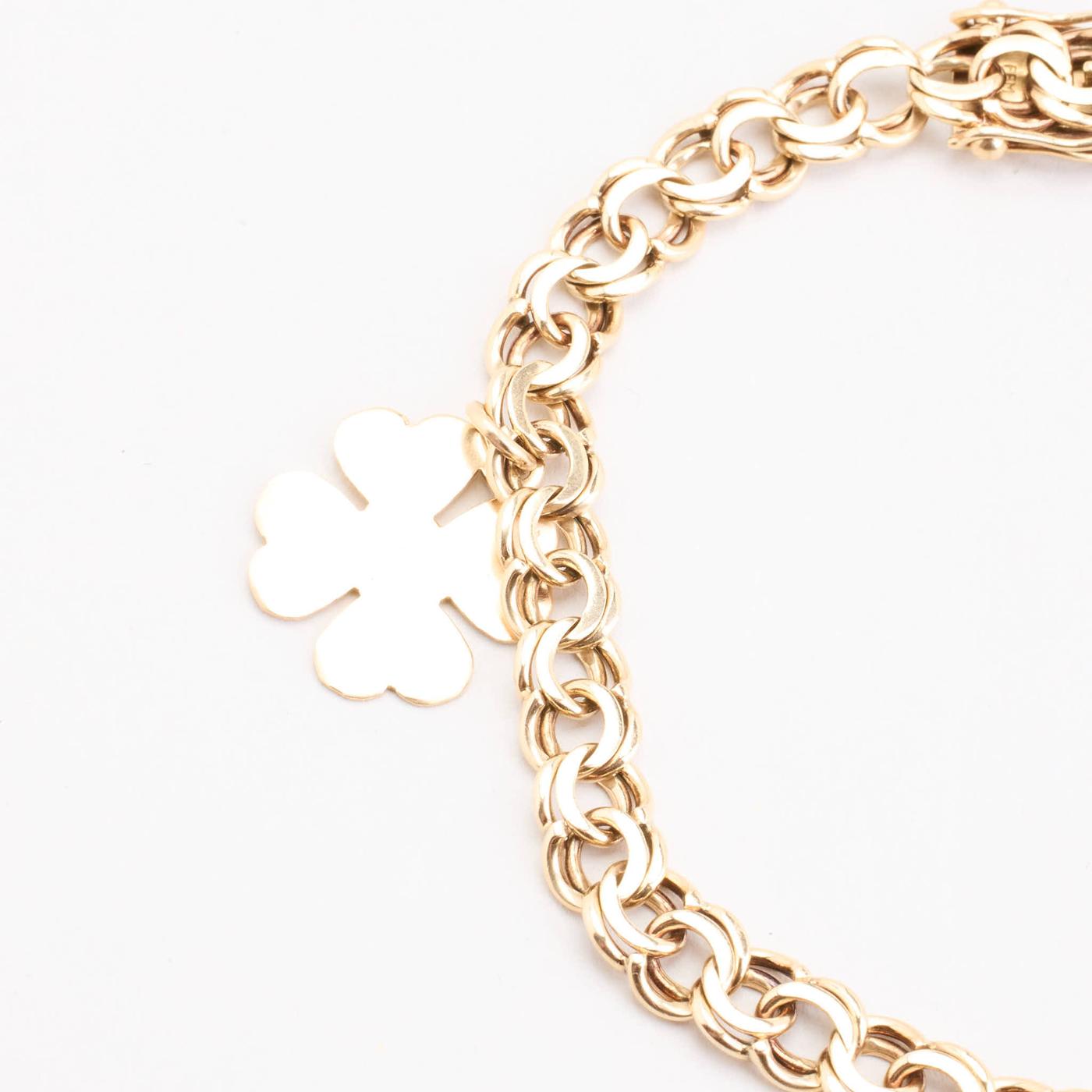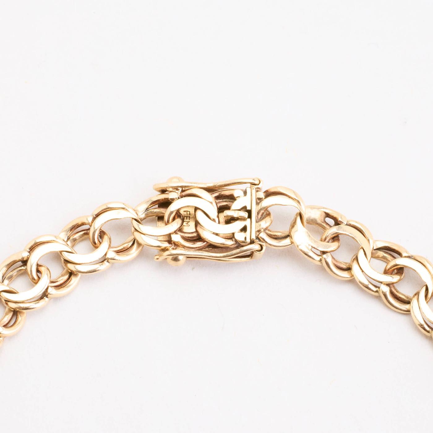 Bismarck charm-armbånd i 14K guld med røde sten, 19 cm