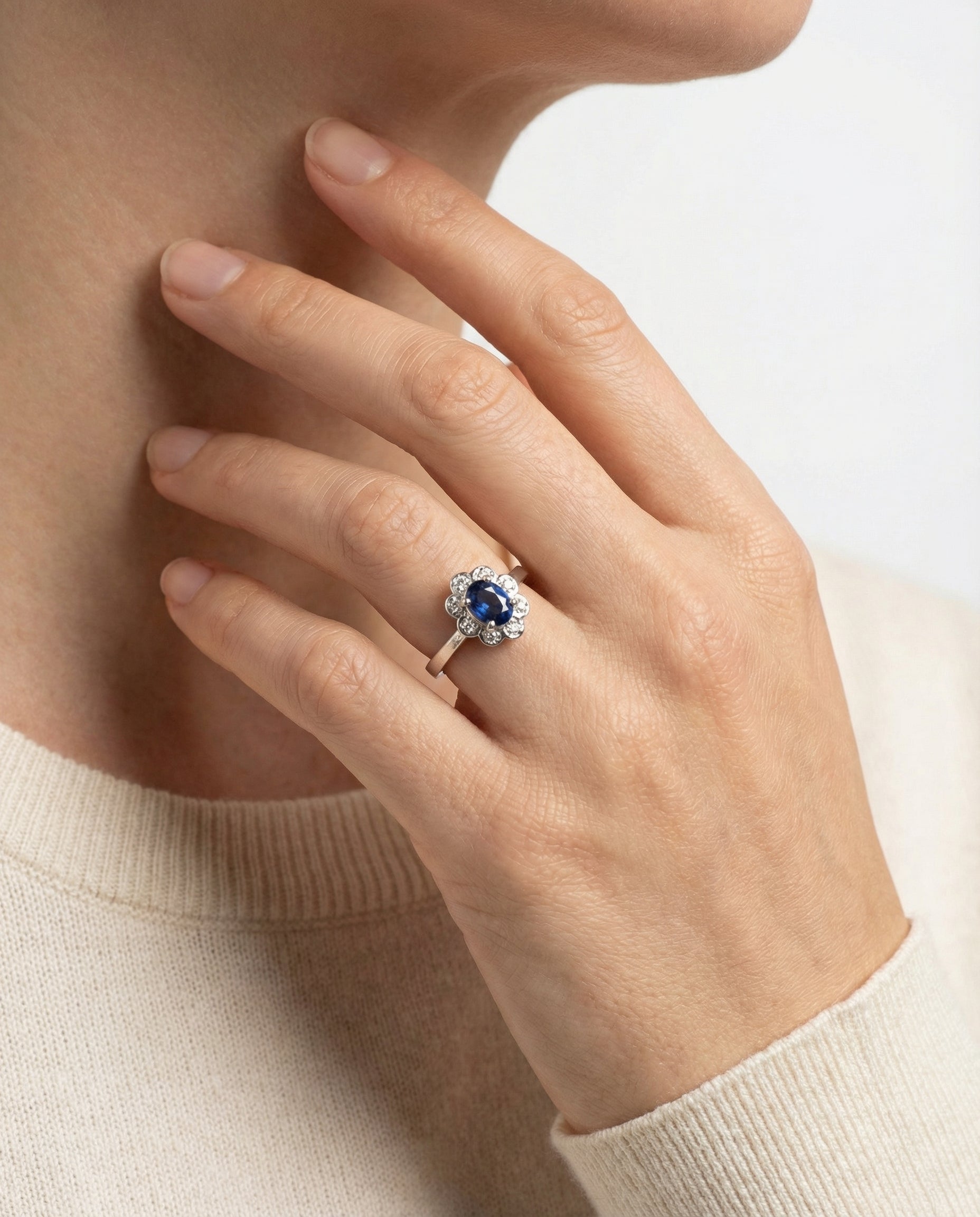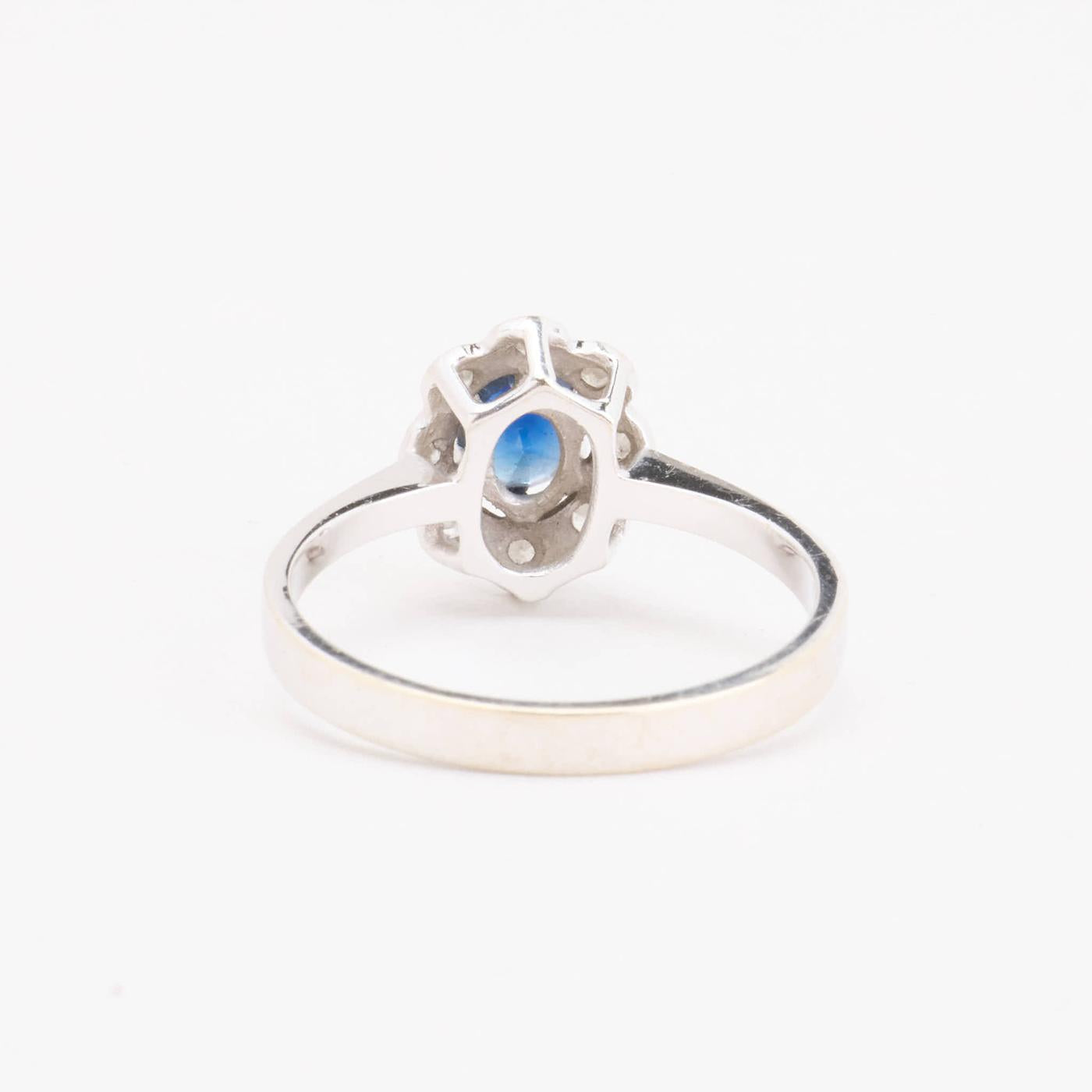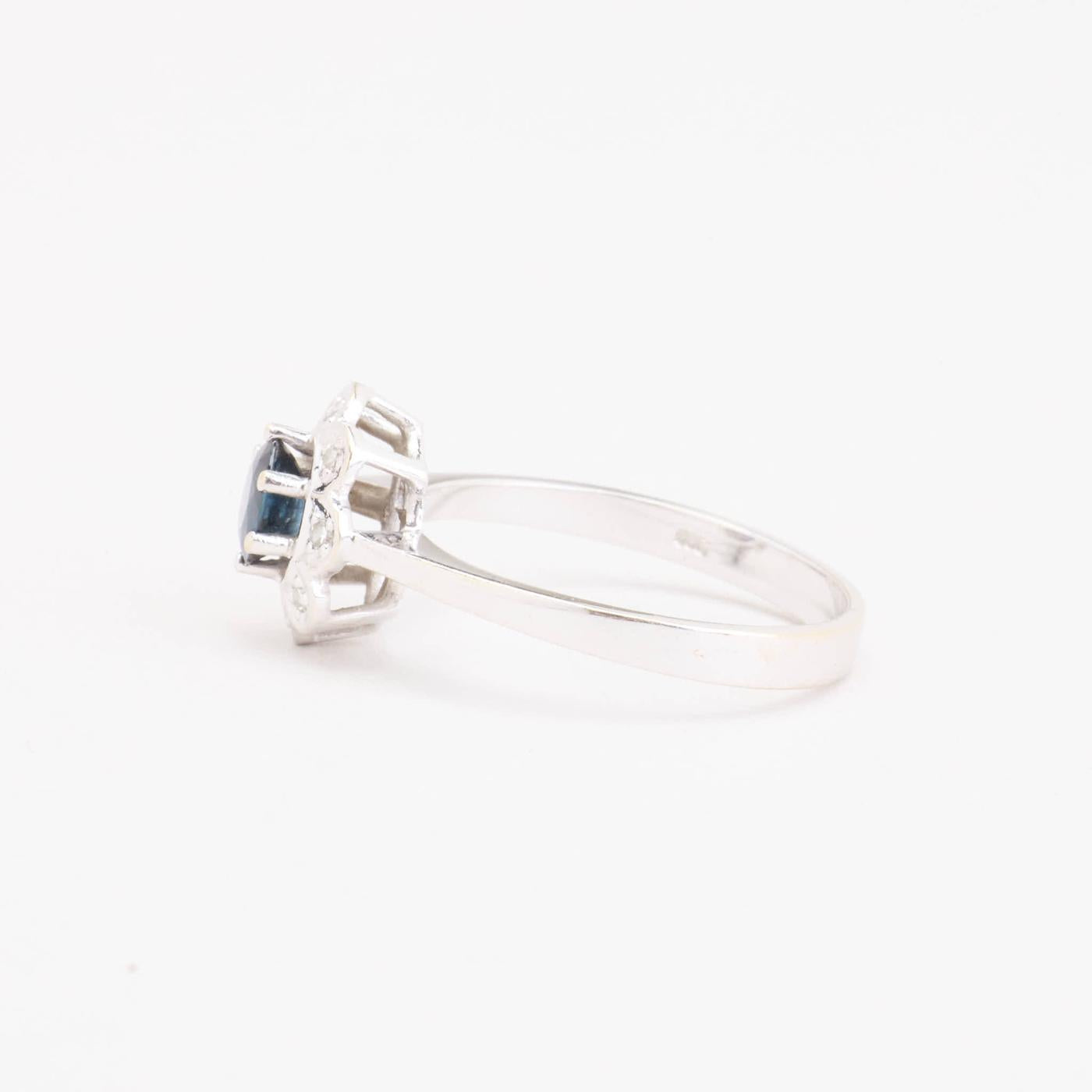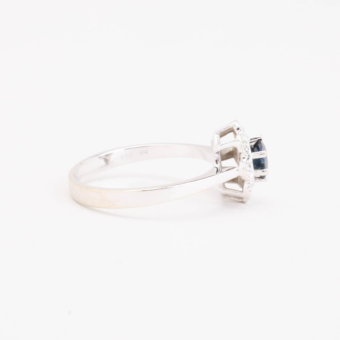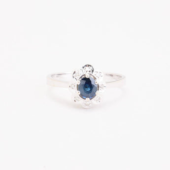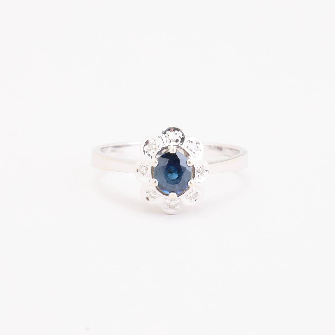 Rosetring i 14K hvidguld med flere diamanter (0.05 ct) og en safir, Str. 55, 2.2 g