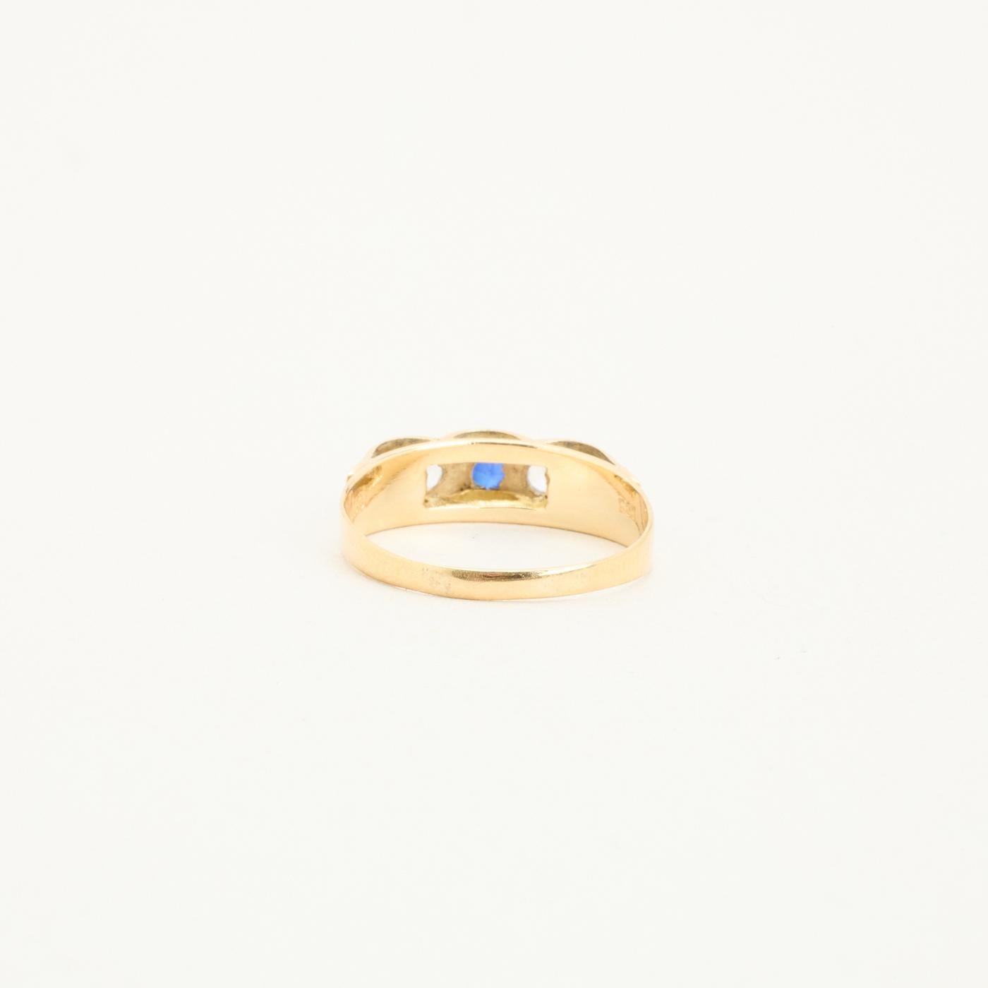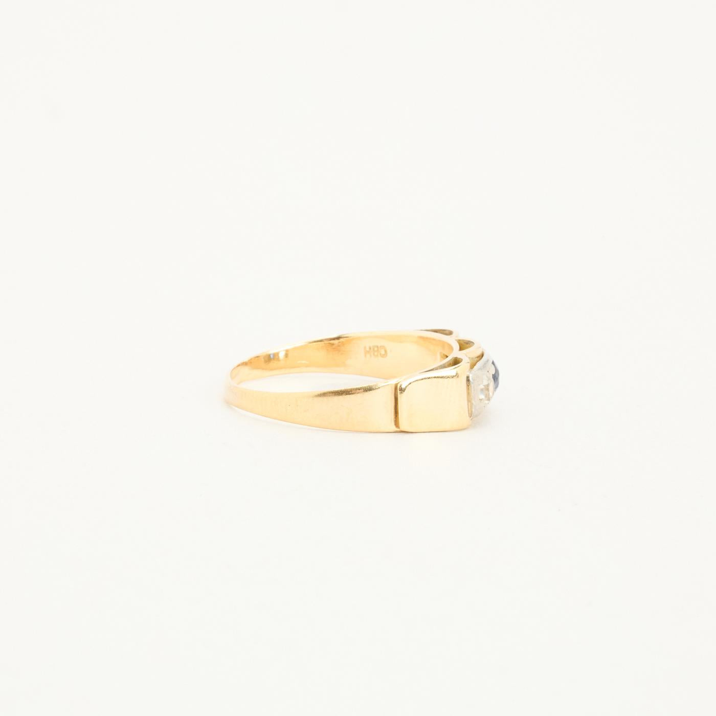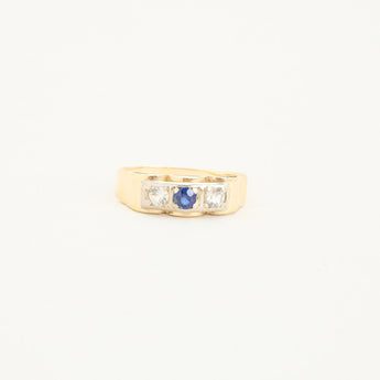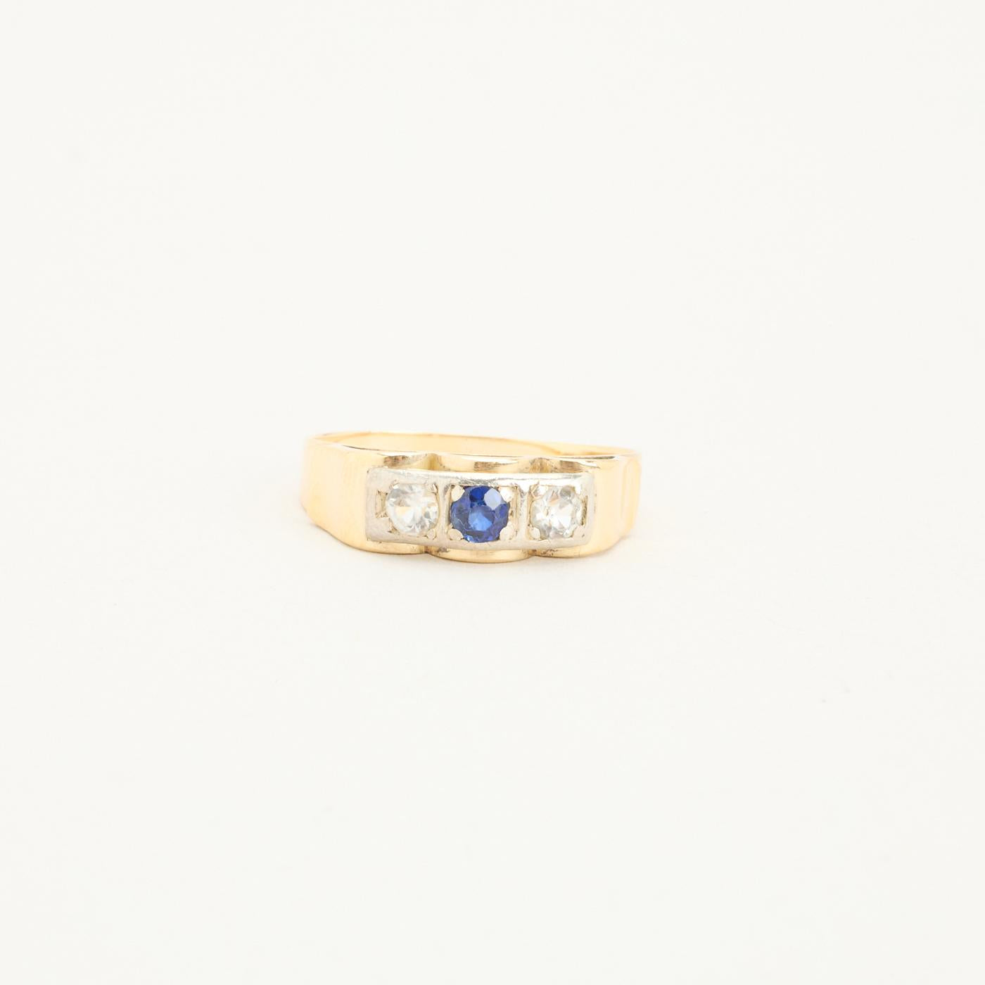 Trestensring i 14K guld med en blå sten og to hvide sten, Str. 58