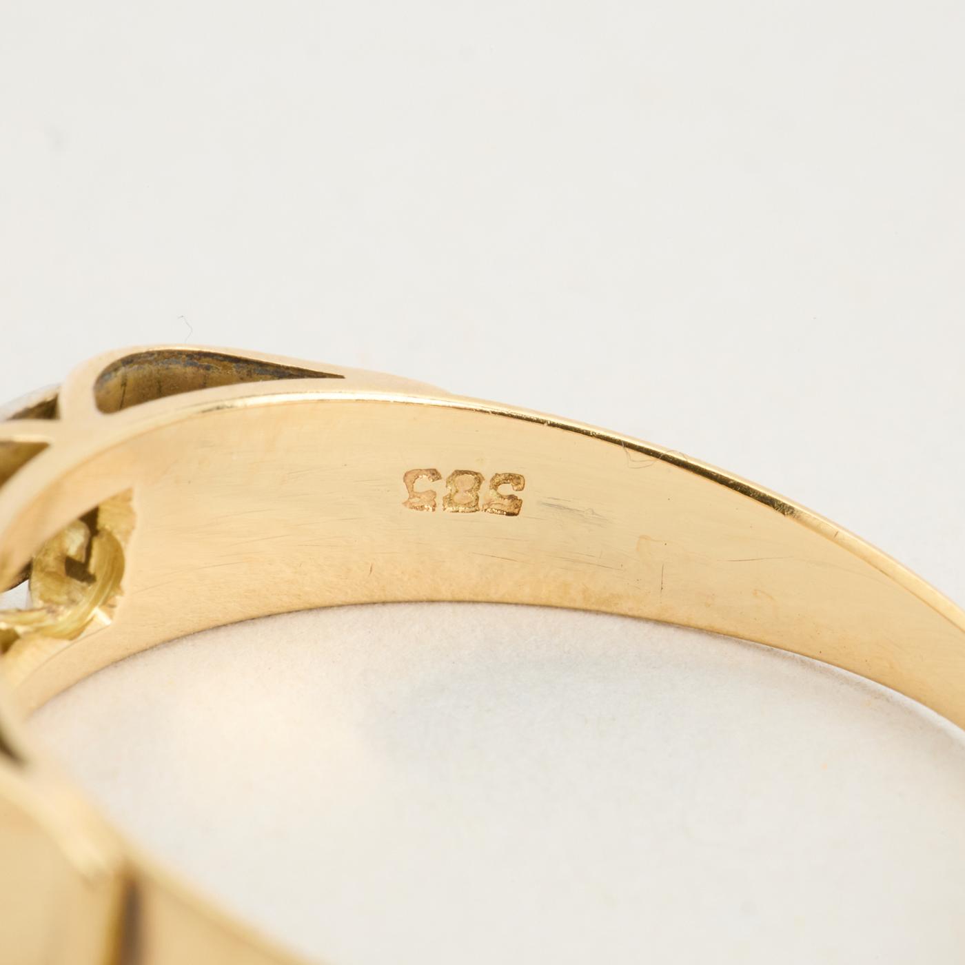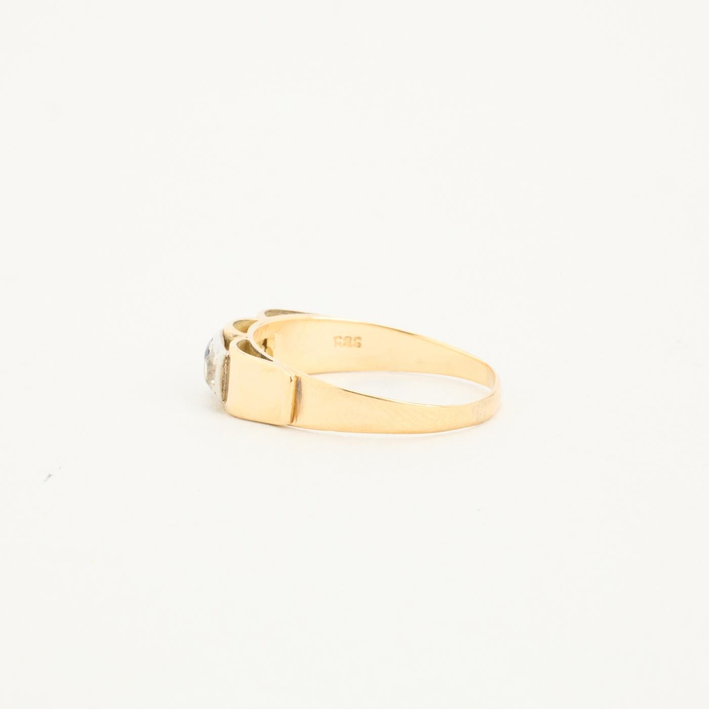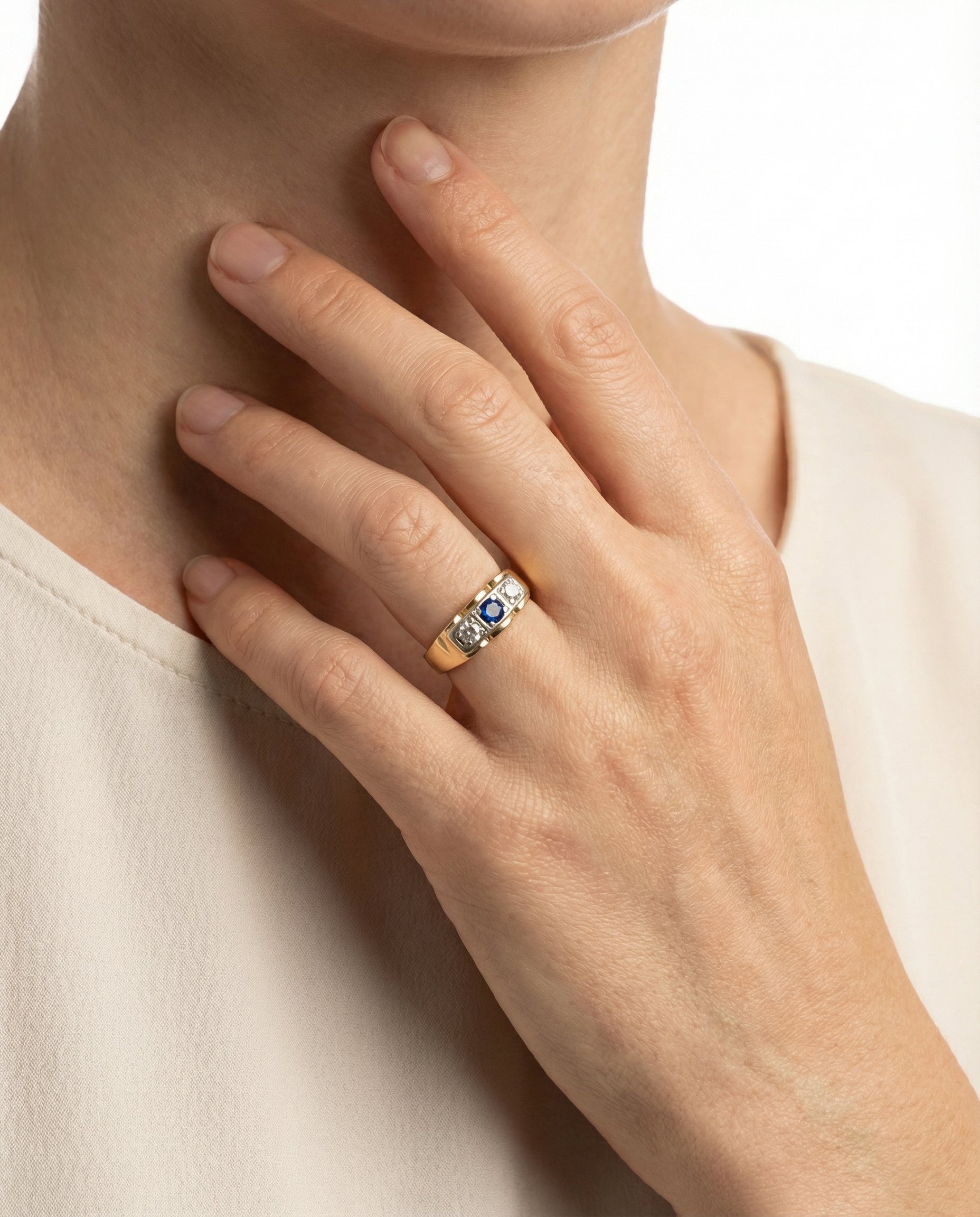 Trestensring i 14K guld med en blå sten og to hvide sten, Str. 58