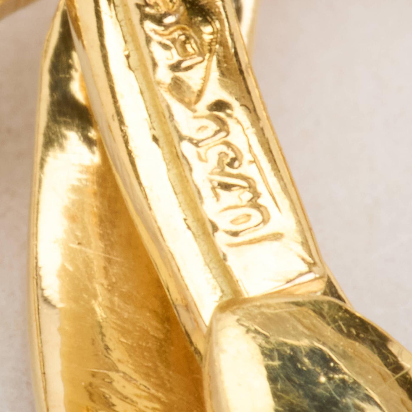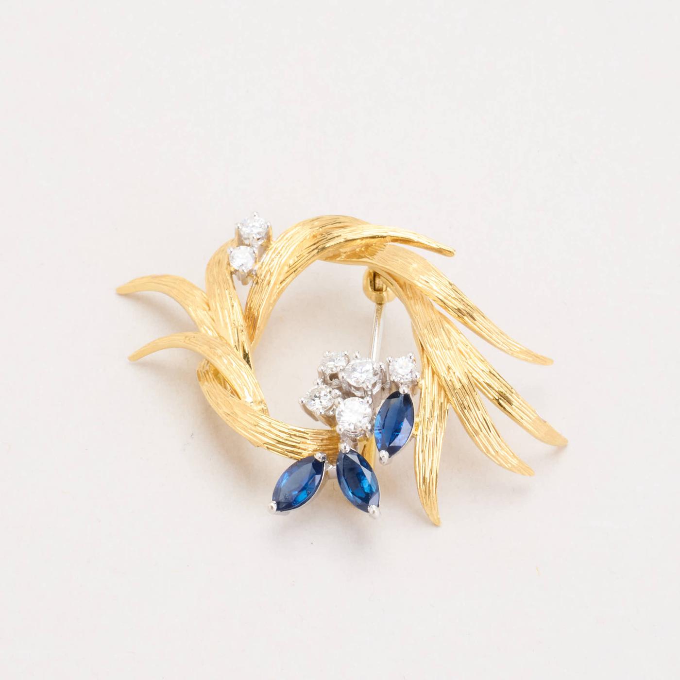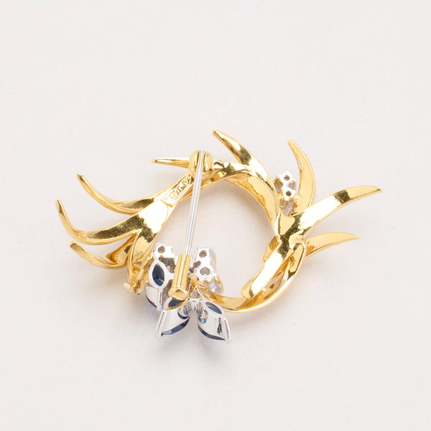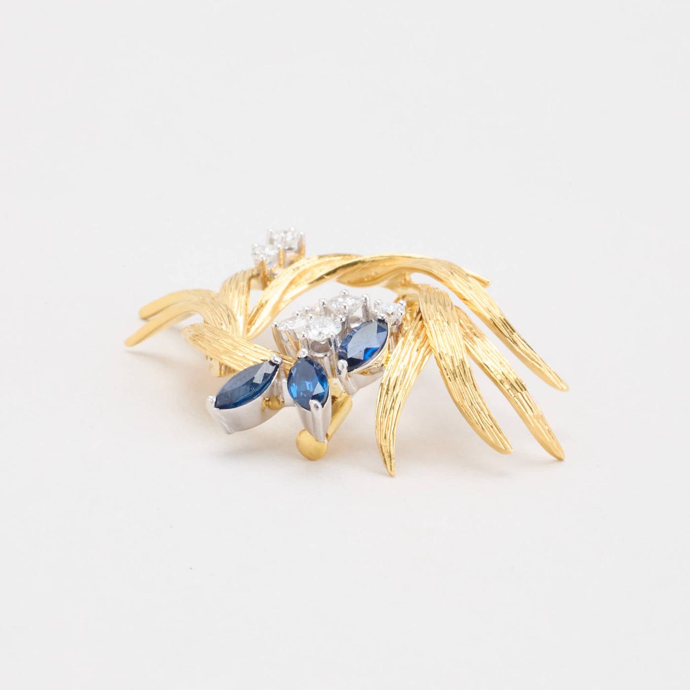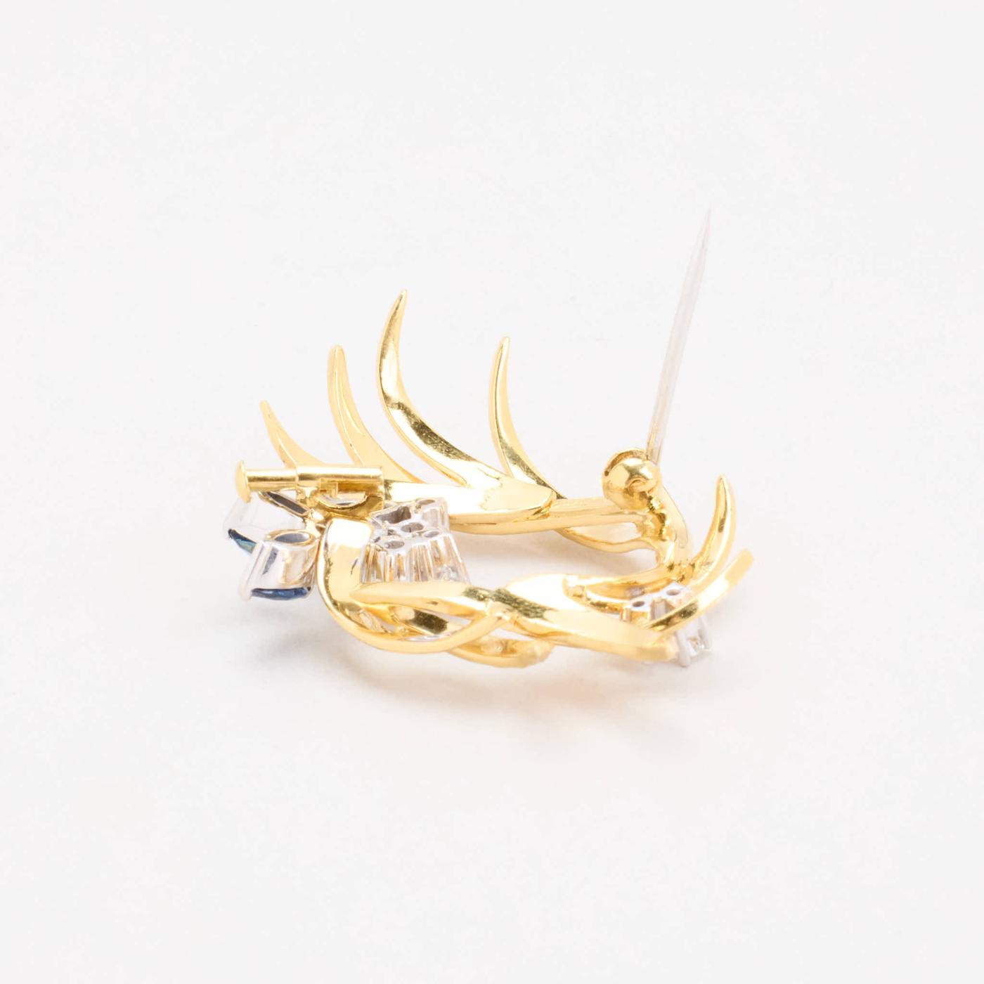 Broche i 18K guld og hvidguld med diamanter (0.7 ct) og safirer, 2.9 cm, 8.69 g