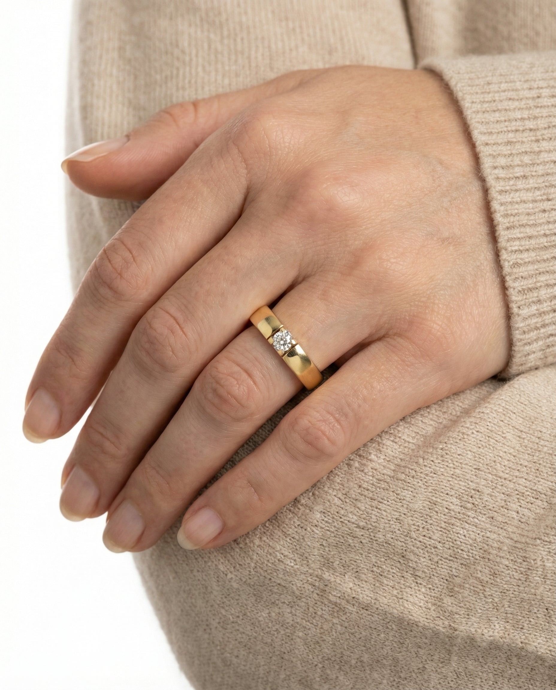 Alliancering med diamant (0.13 ct) i 14K guld str. 56, 5.69 g