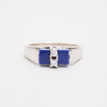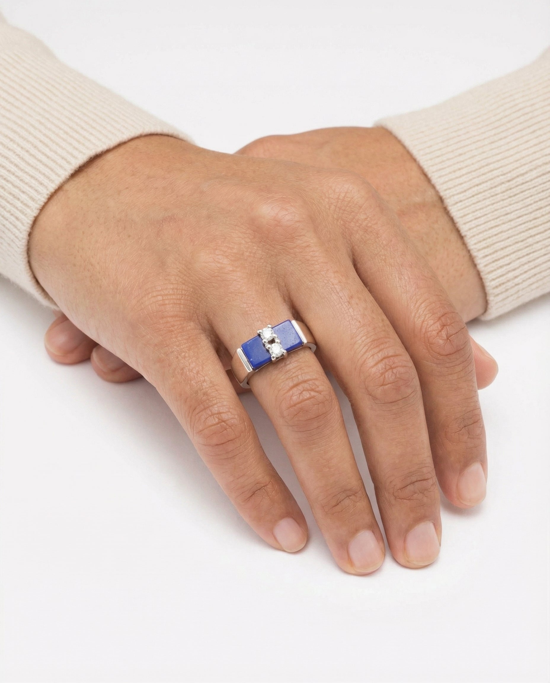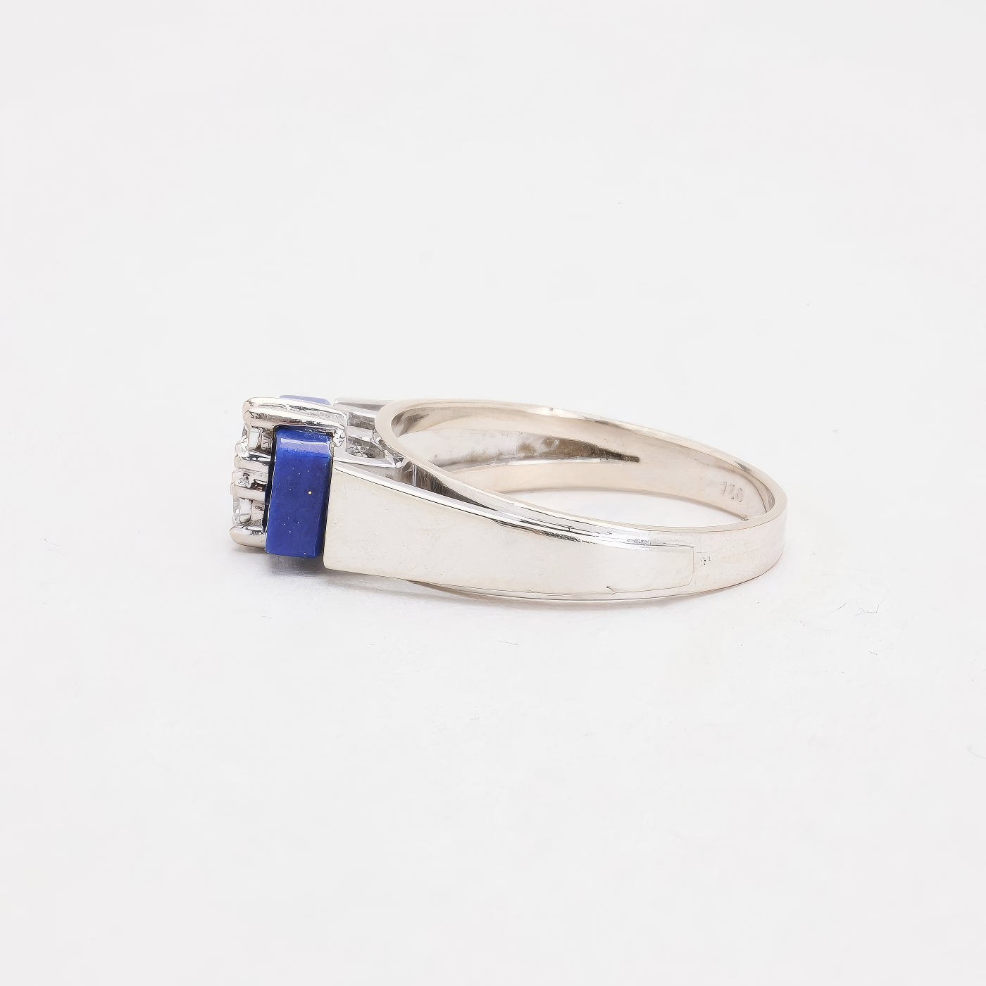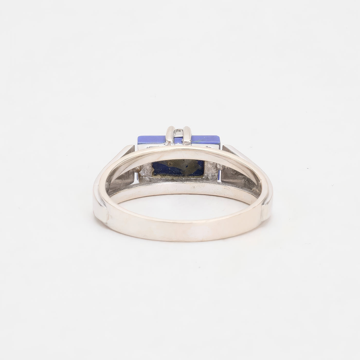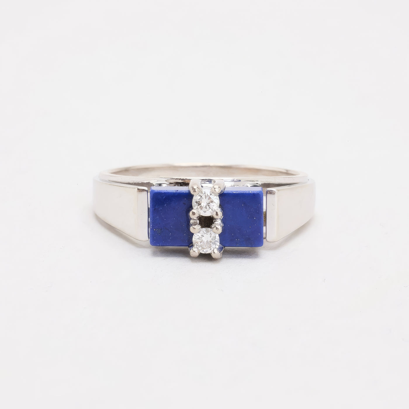 Signet ring i 18K hvidguld med diamanter (0.11 ct) og blå sten, Str. 56, 4.78 g