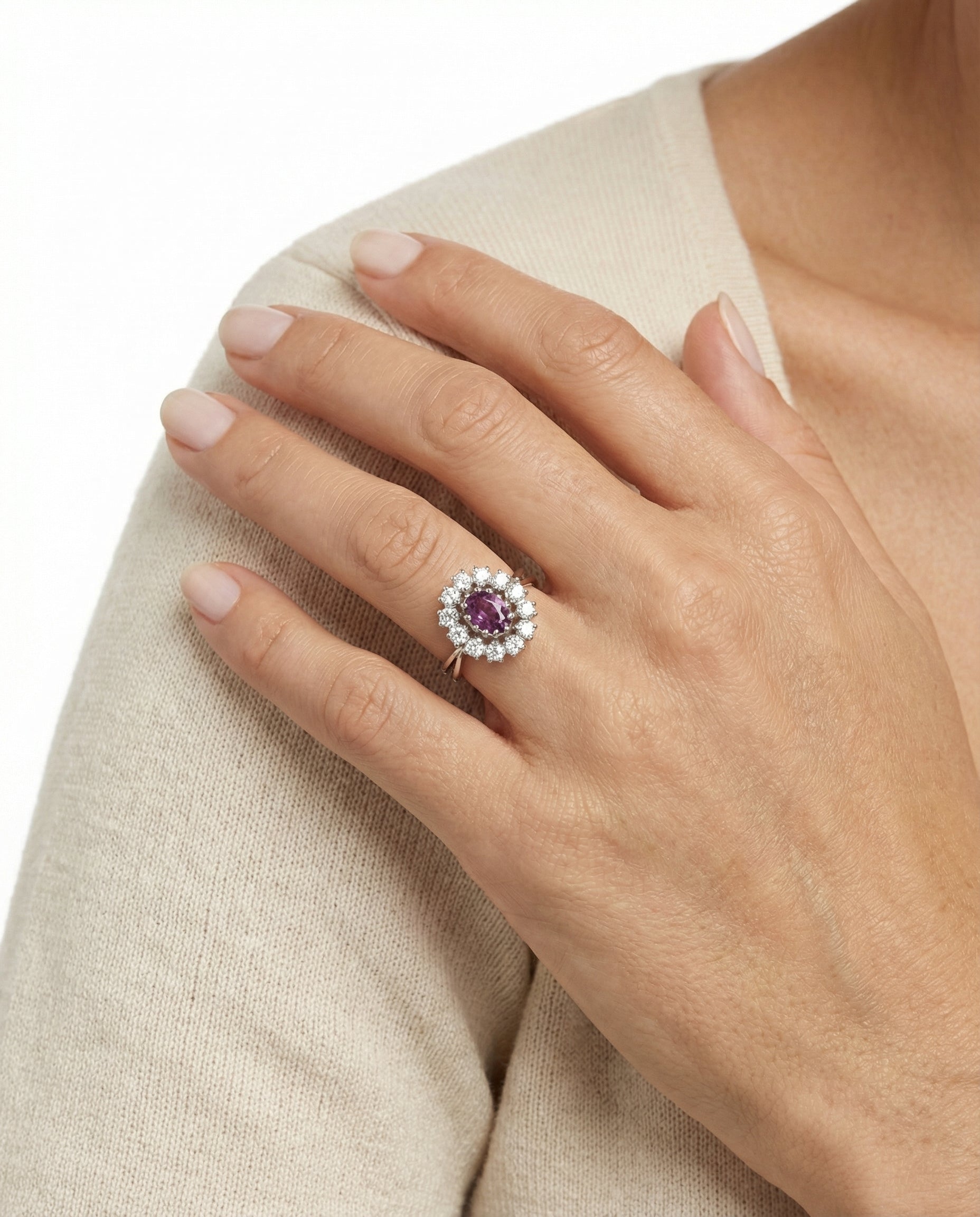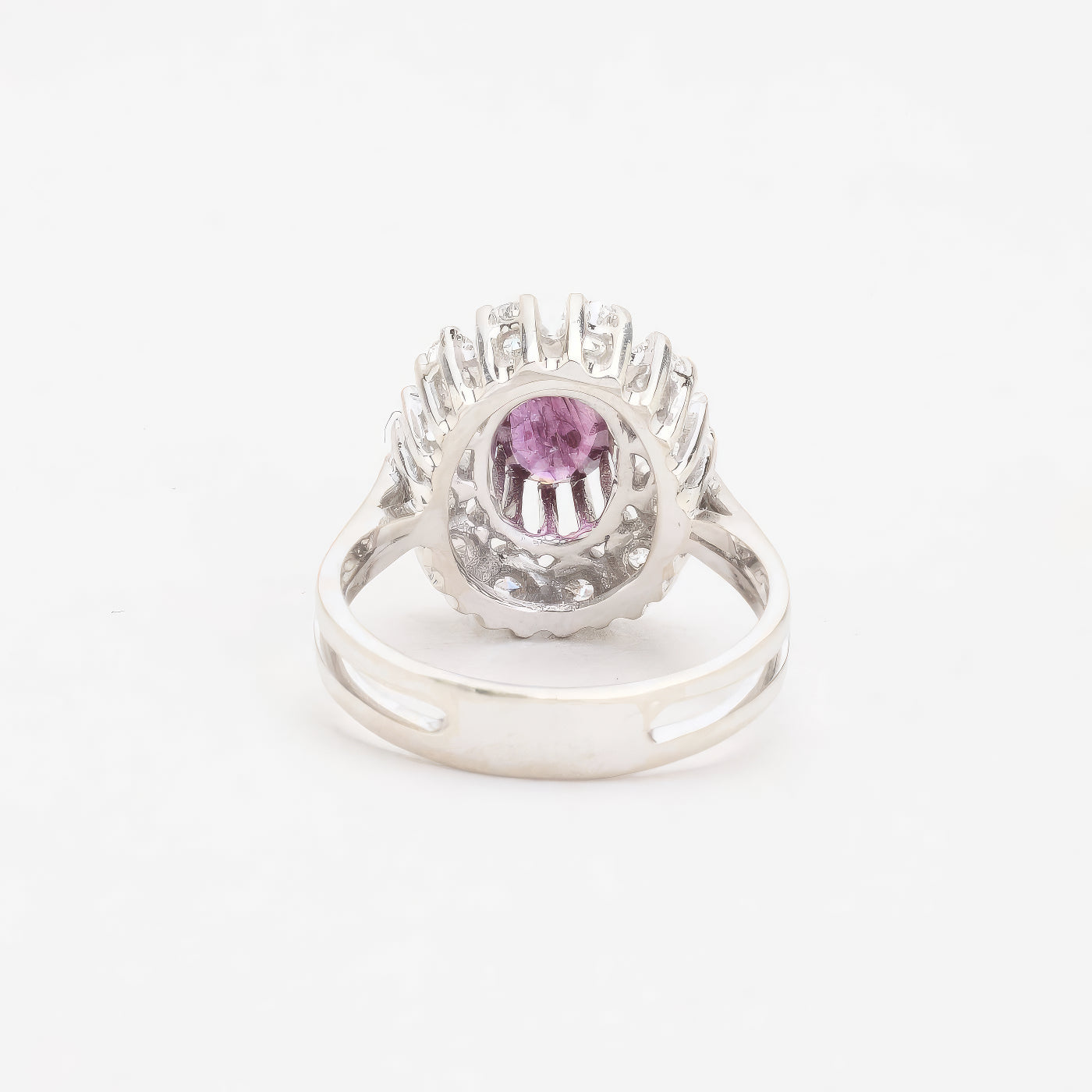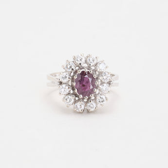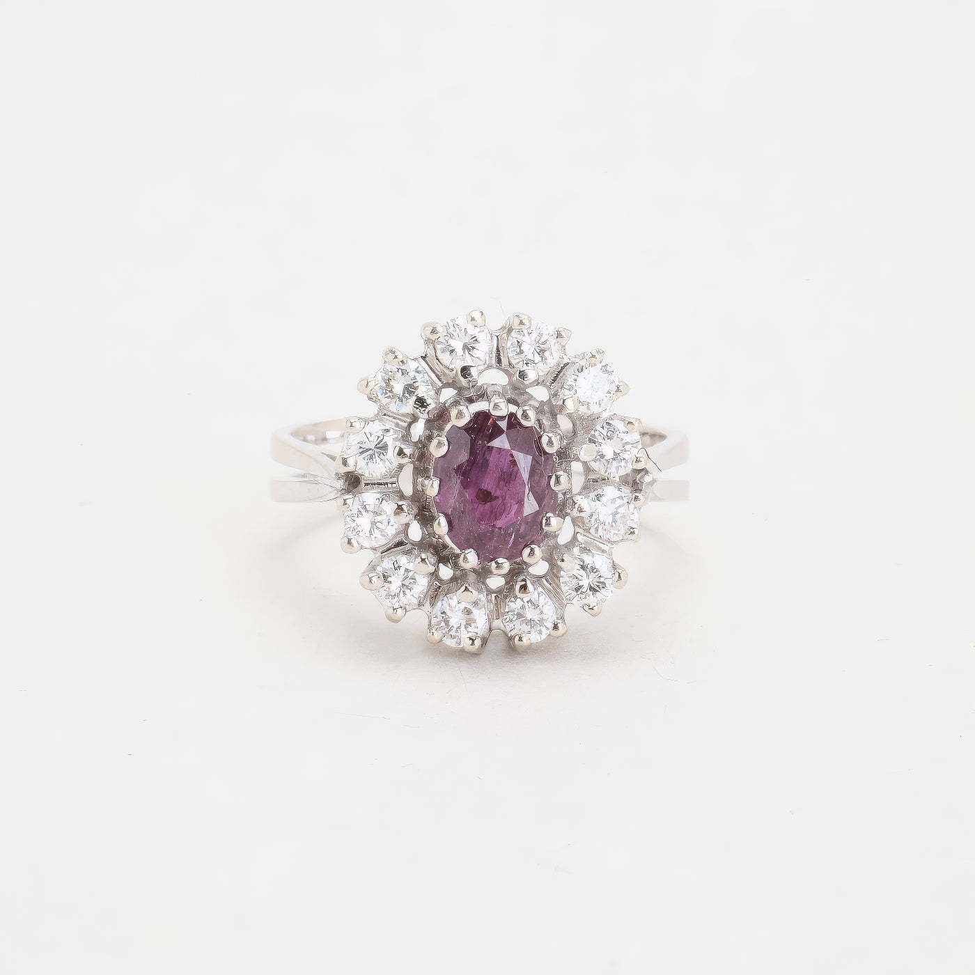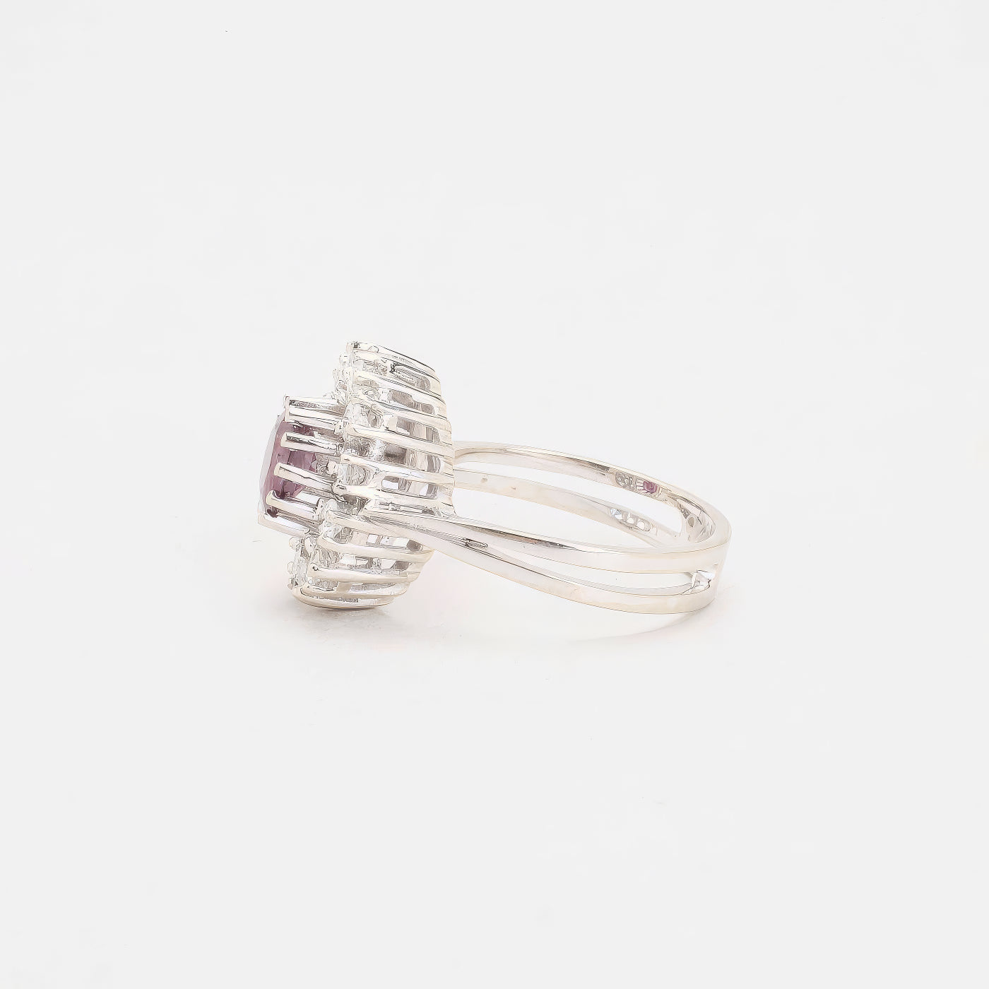 Rosetring i 14K hvidguld med en diamant (0.82 ct) og lilla sten, Str. 56, 5.63 g