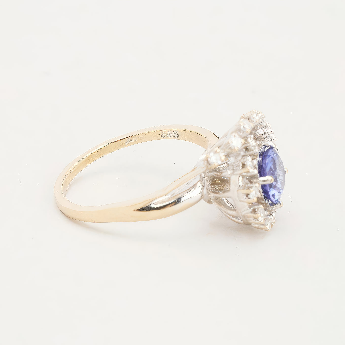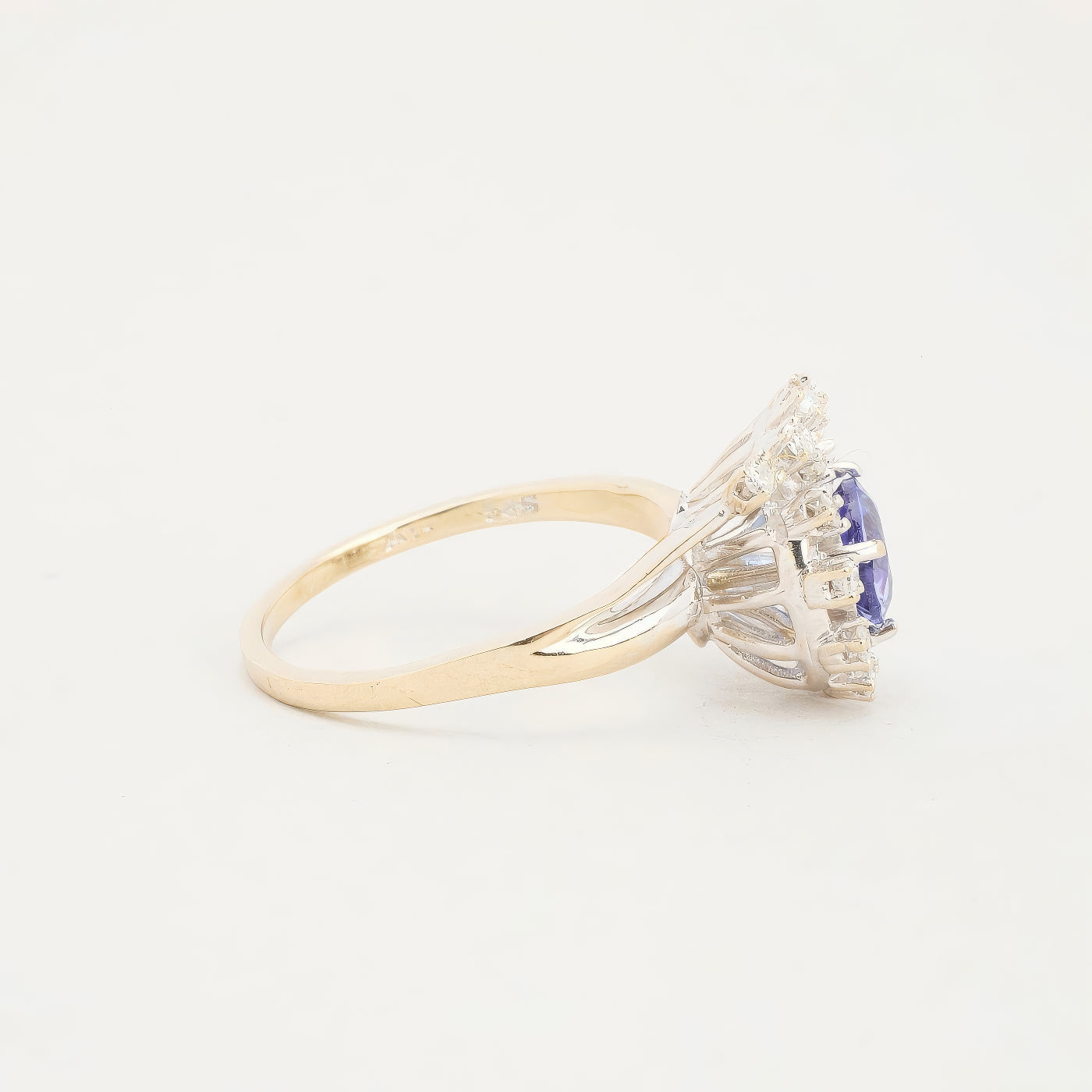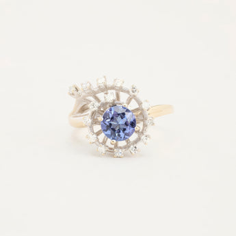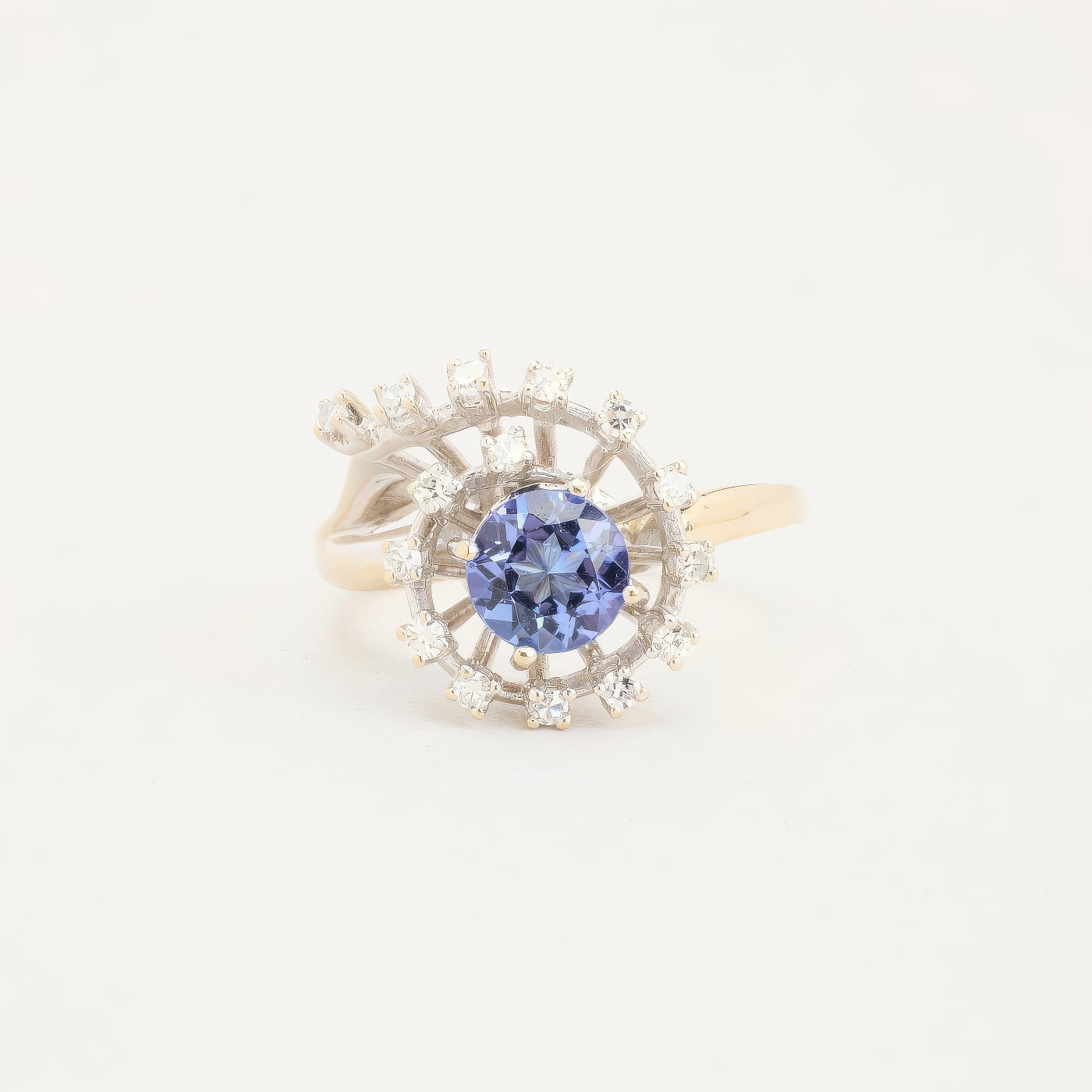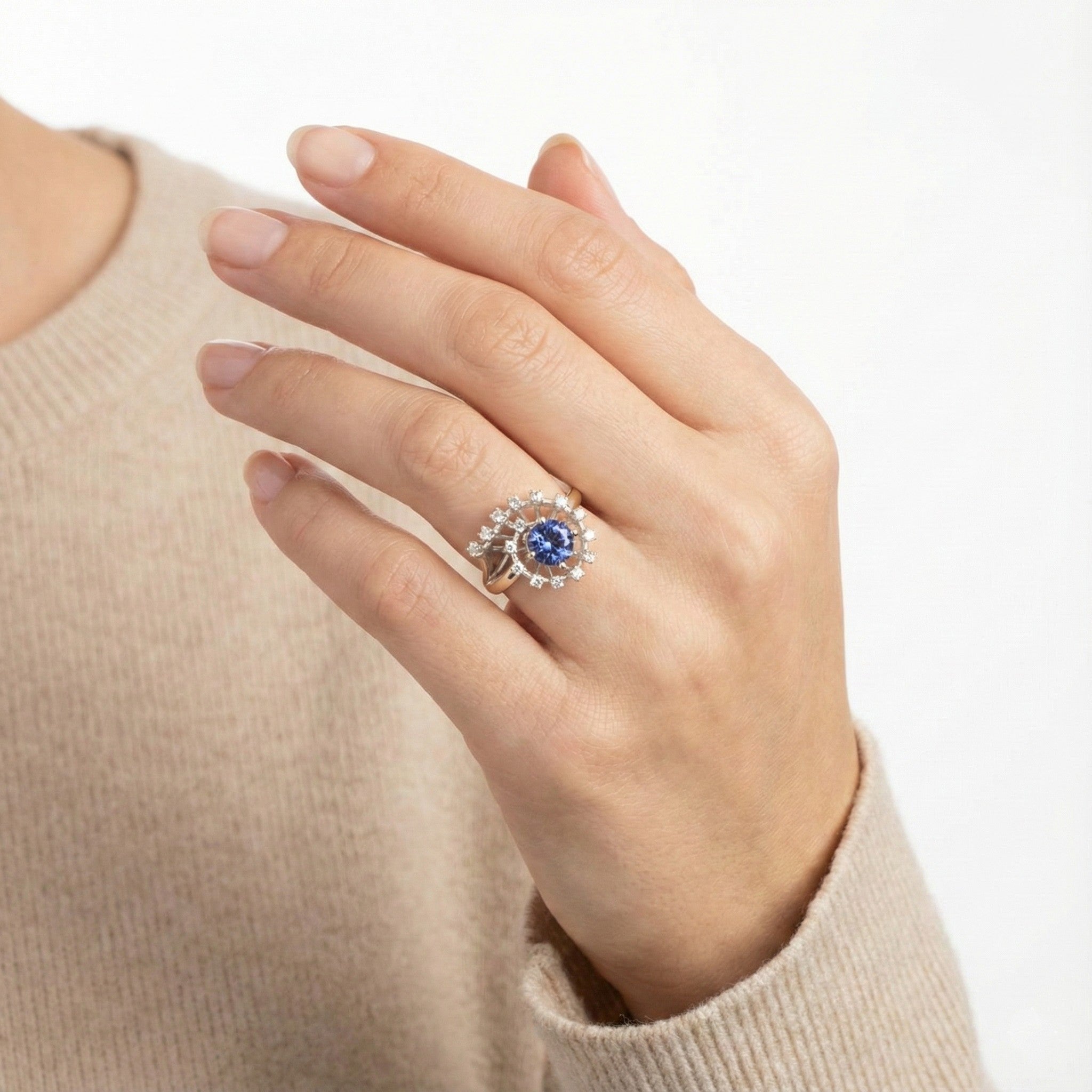 Clusterring i 14K hvidguld med diamanter (0.24 ct) og én tanzanit, Str. 57, 4.74 g