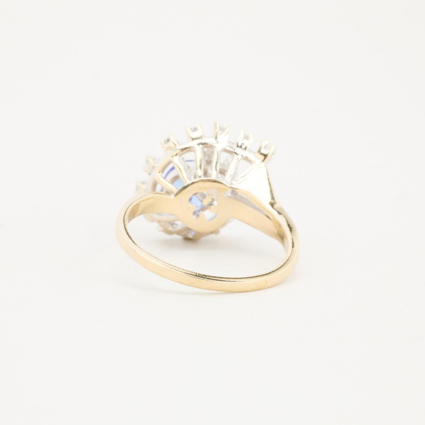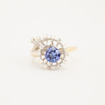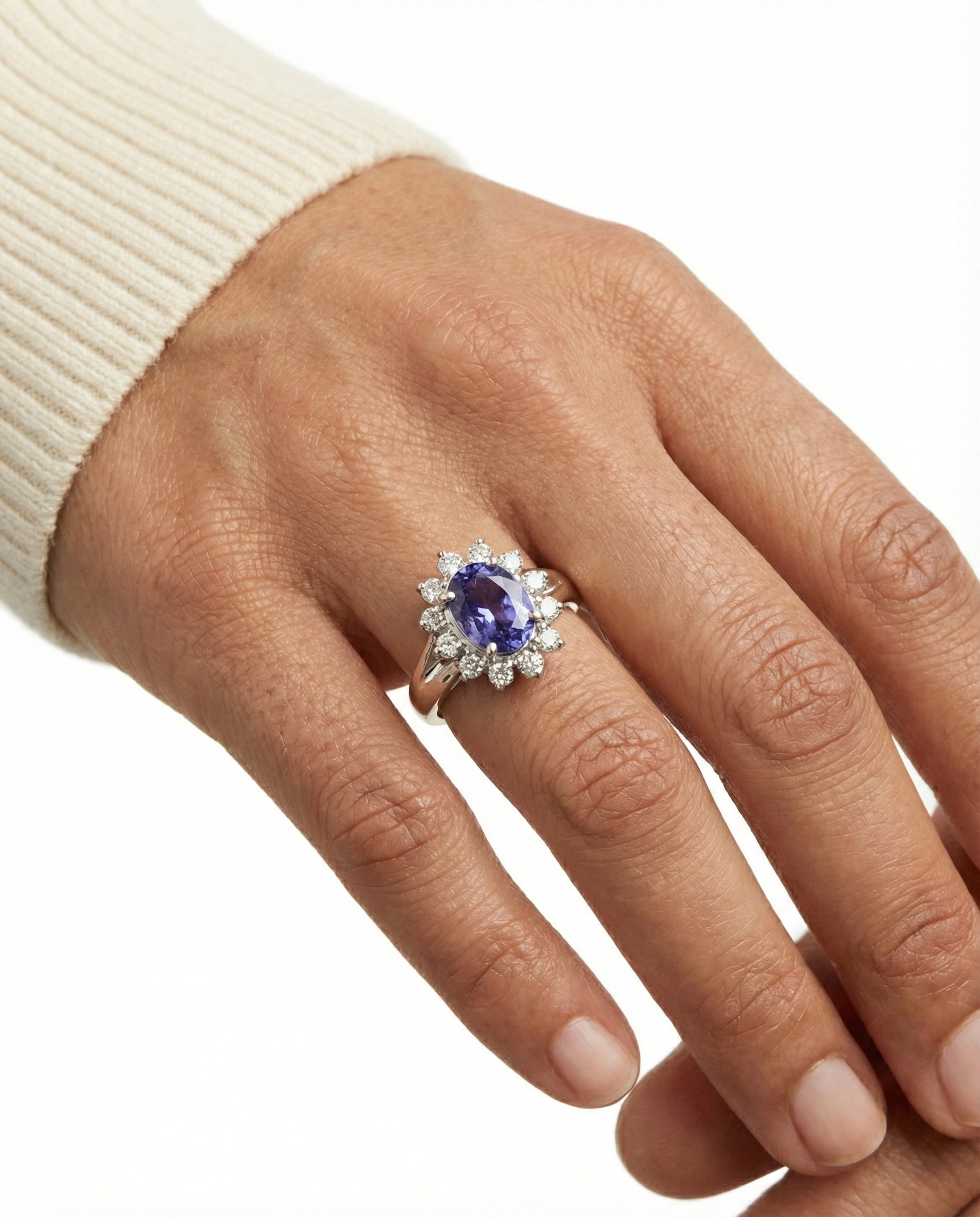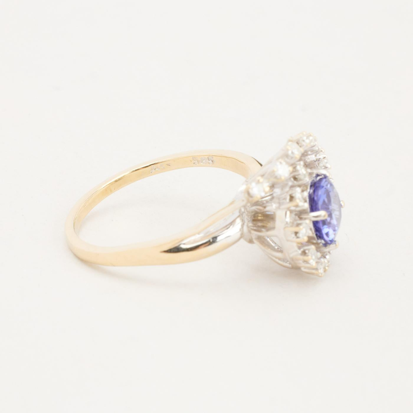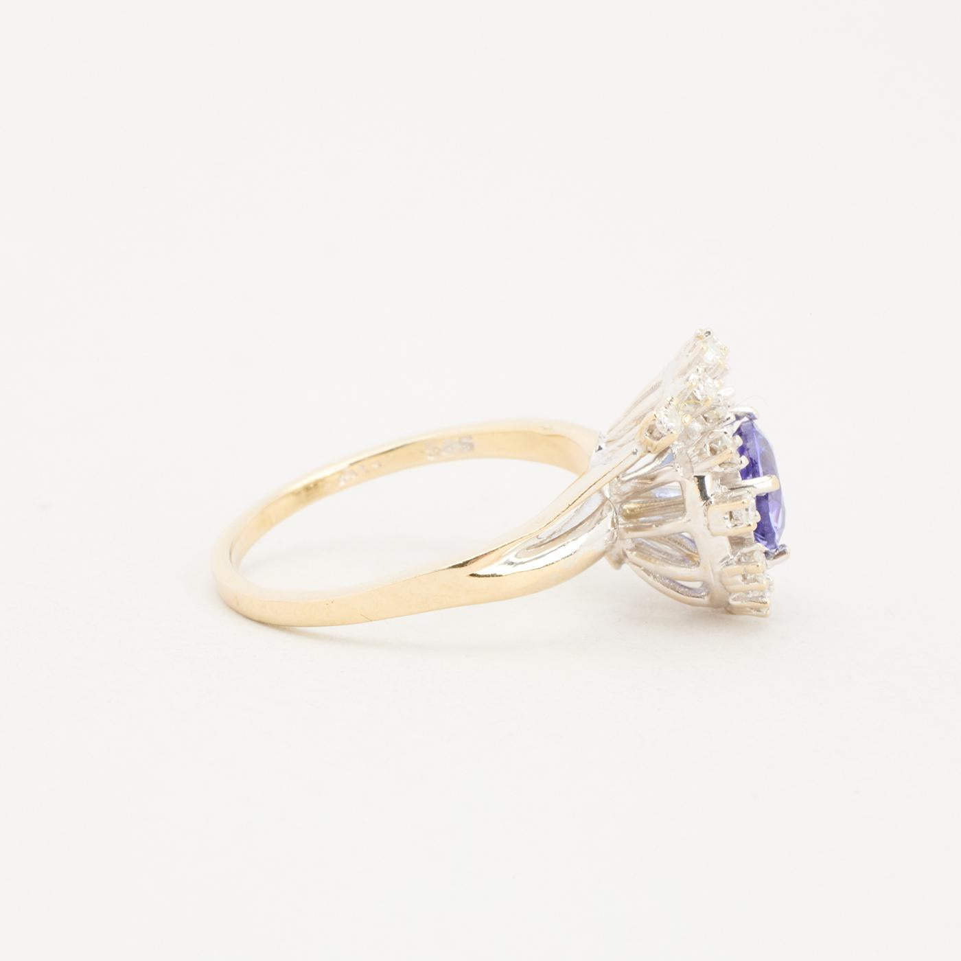 Clusterring med diamant (0.24 ct) i 14K hvidguld med en tanzanit, str. 57, 4.74 g