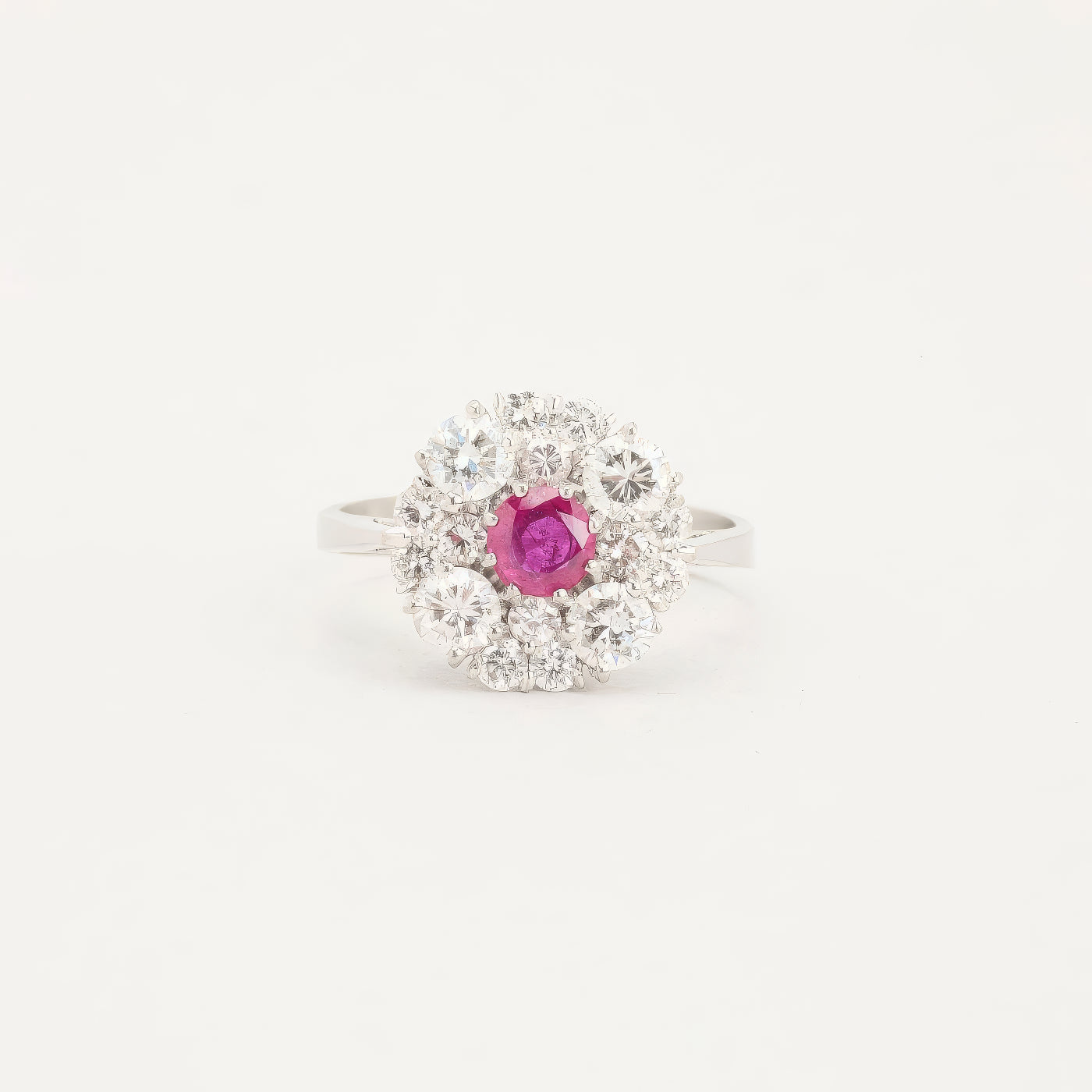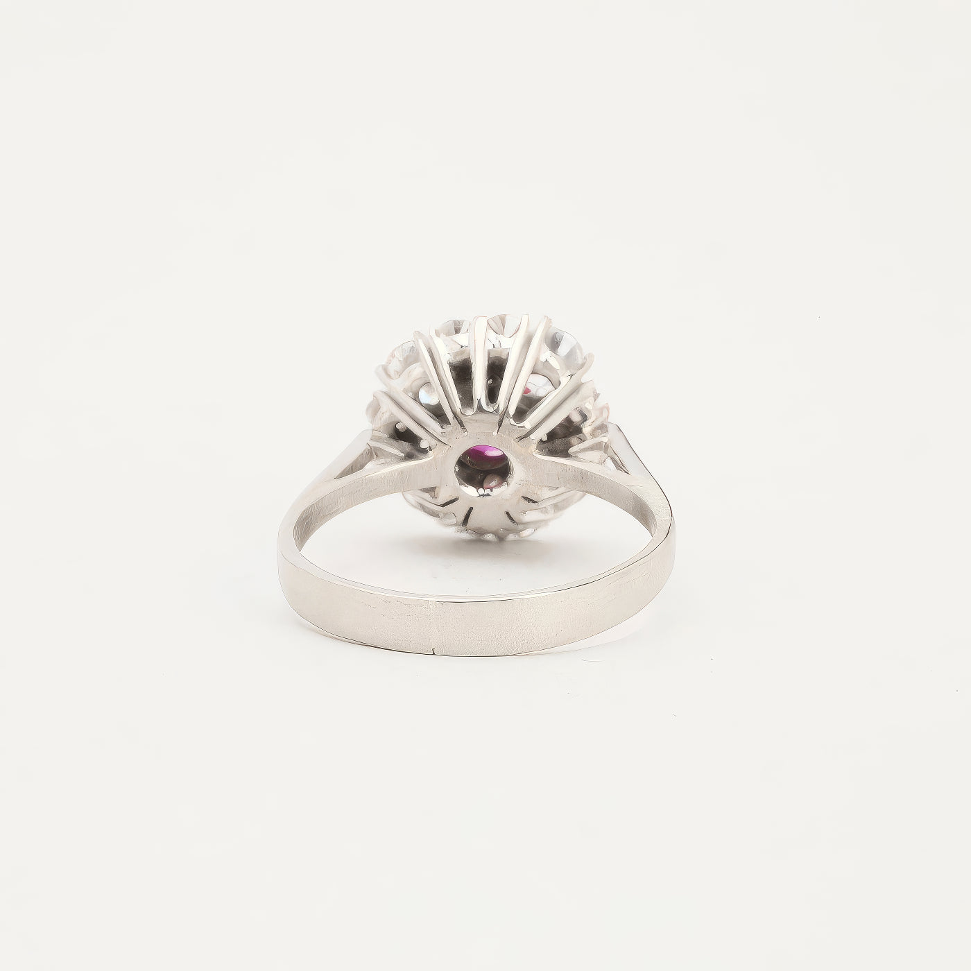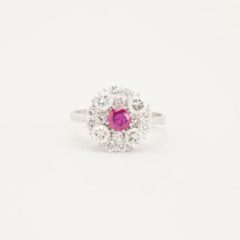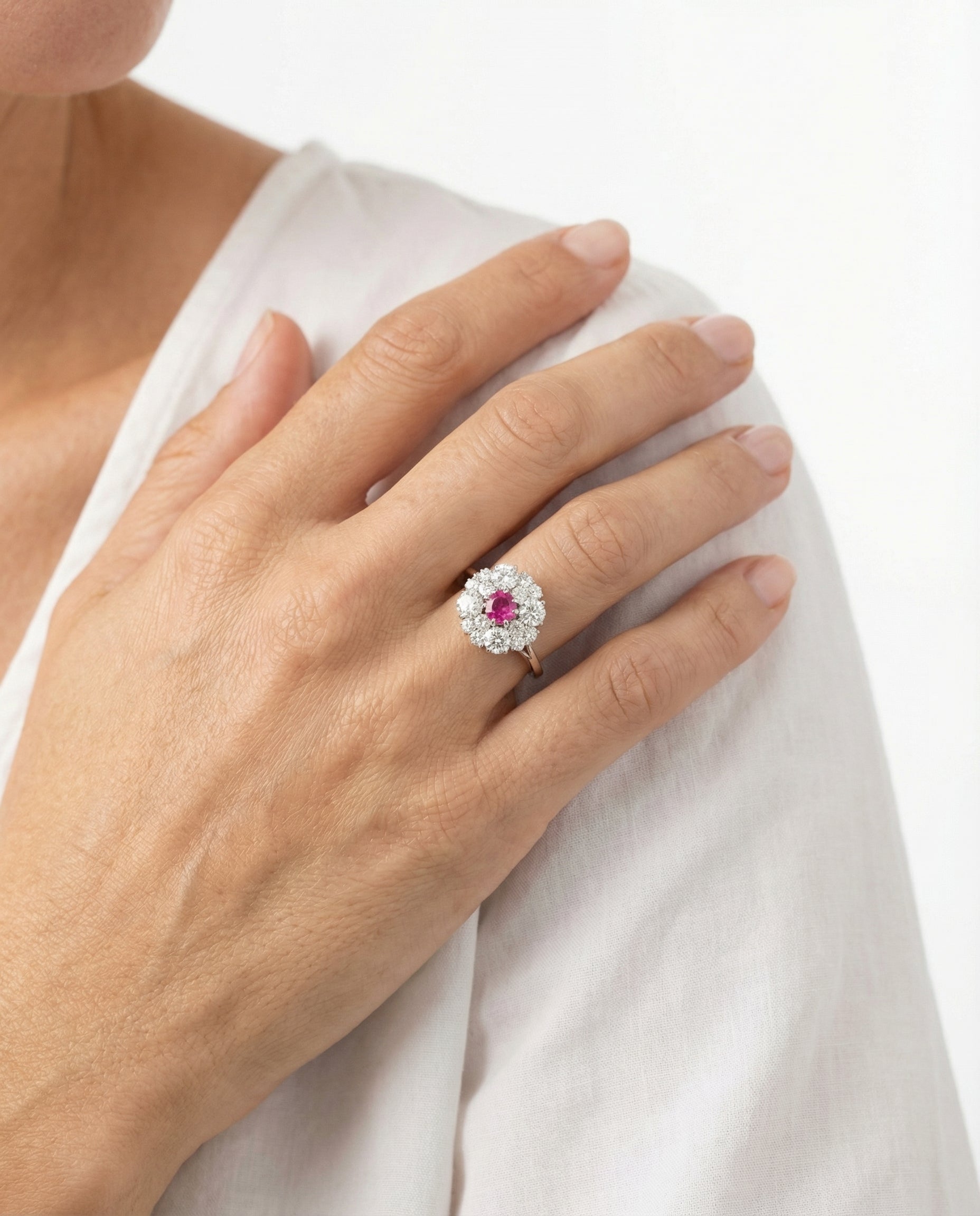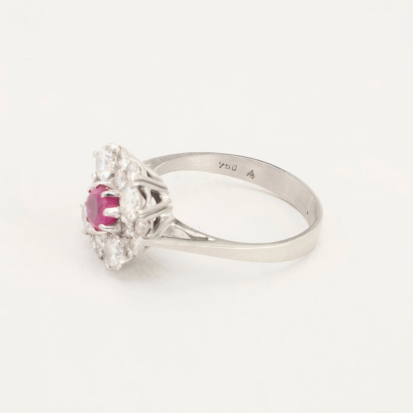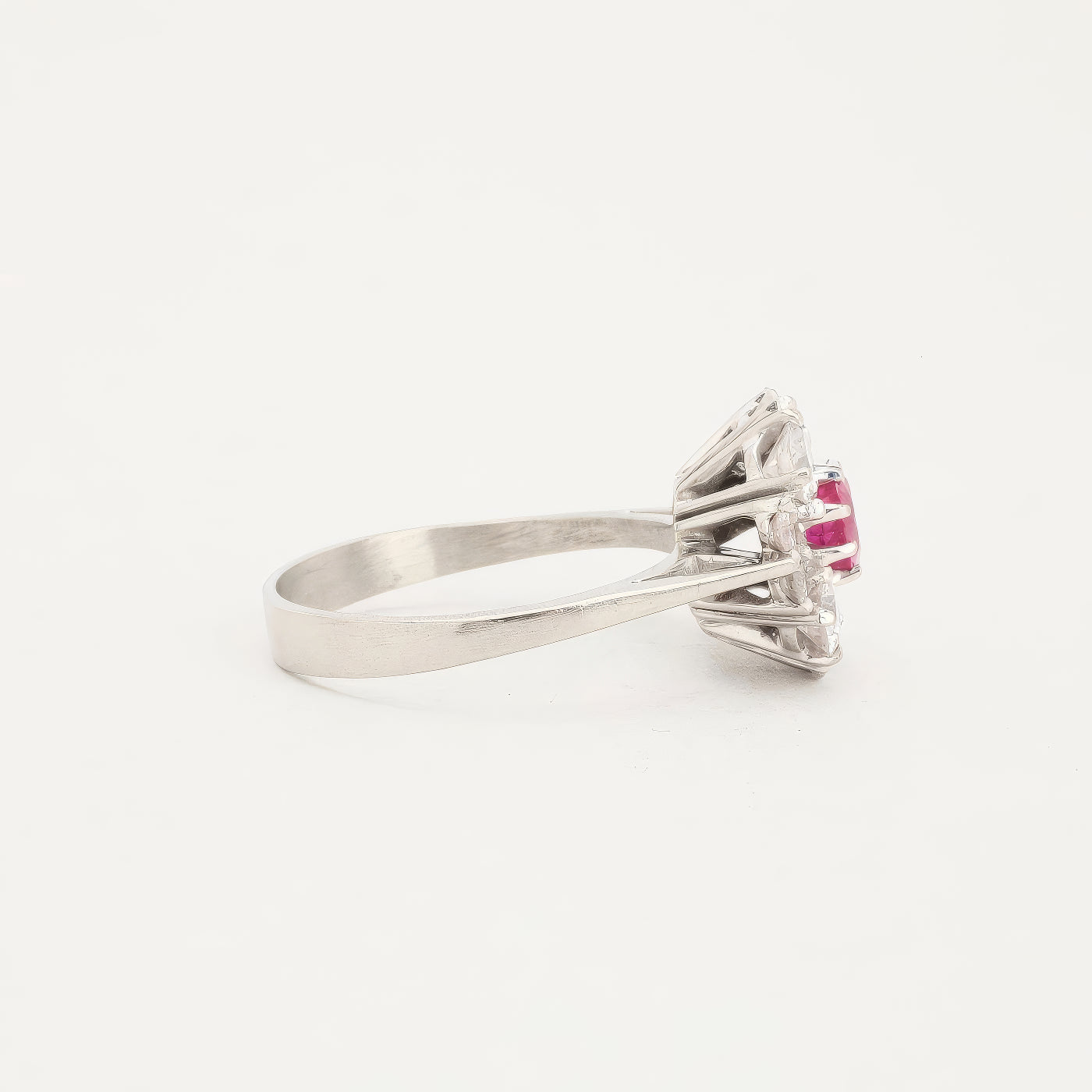 Rosetring i 18K hvidguld med diamanter og en pink sten (1.38 ct), Str. 54, 4.87 g