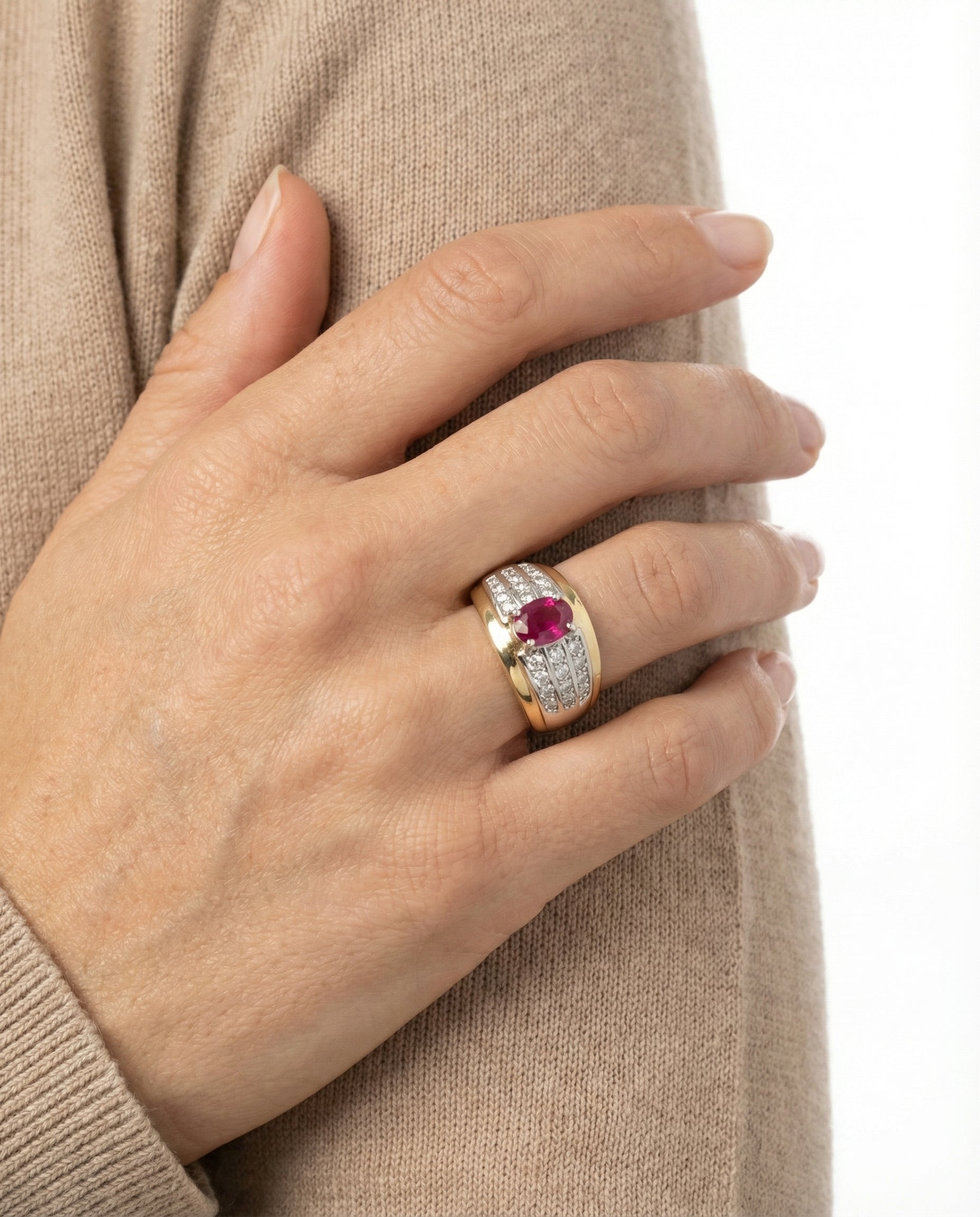 Gypsyring med diamant (0.21 ct) i 18K guld og hvidguld med en rubin, str. 53, 6.2 g