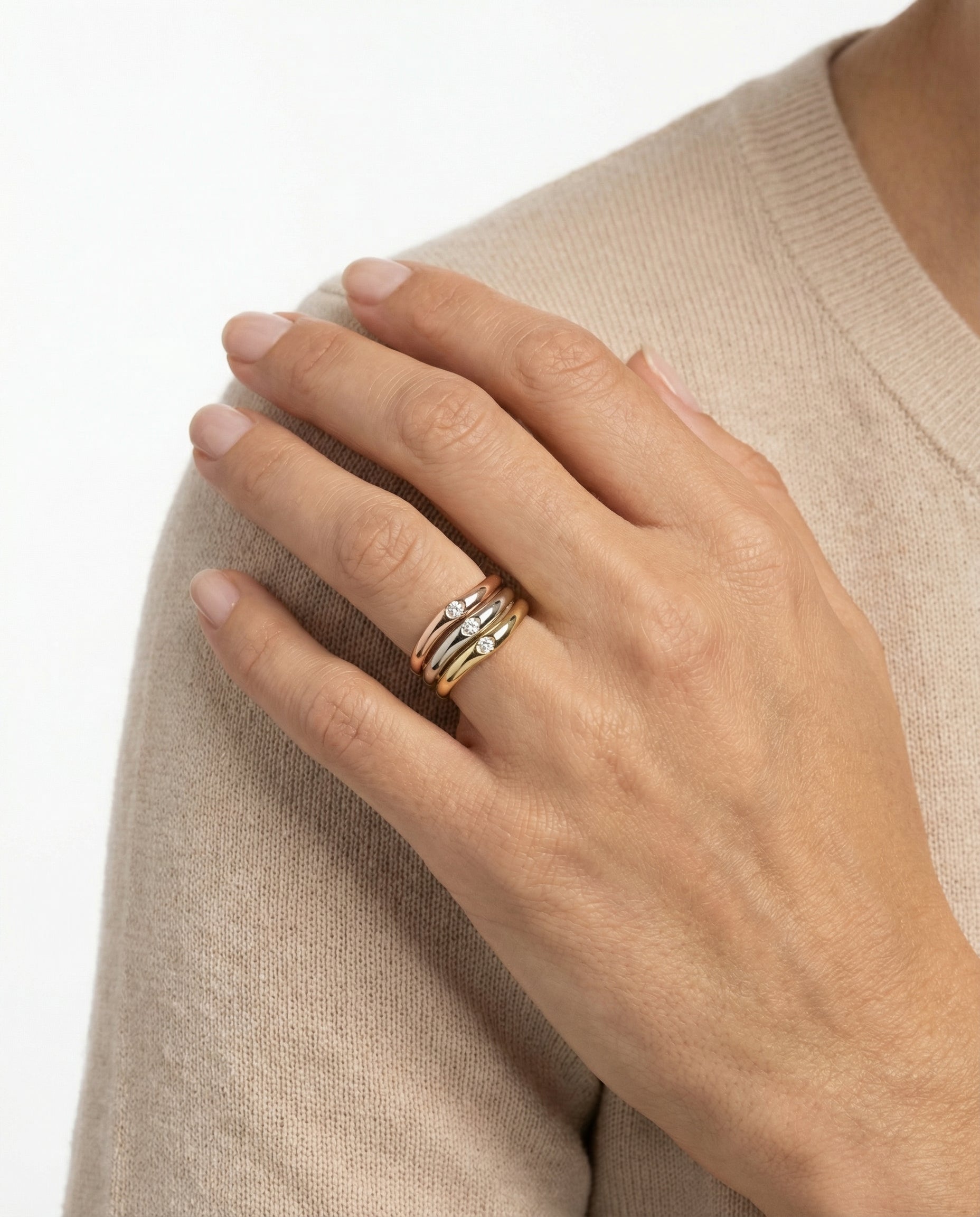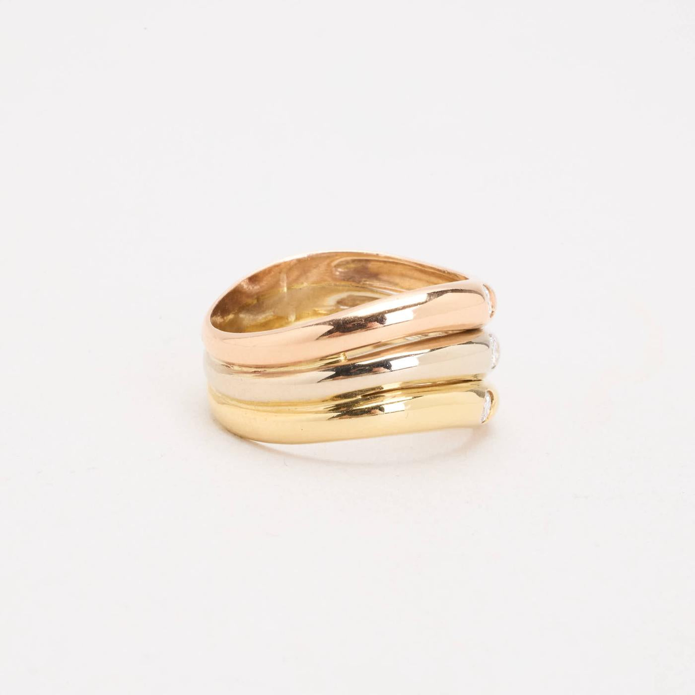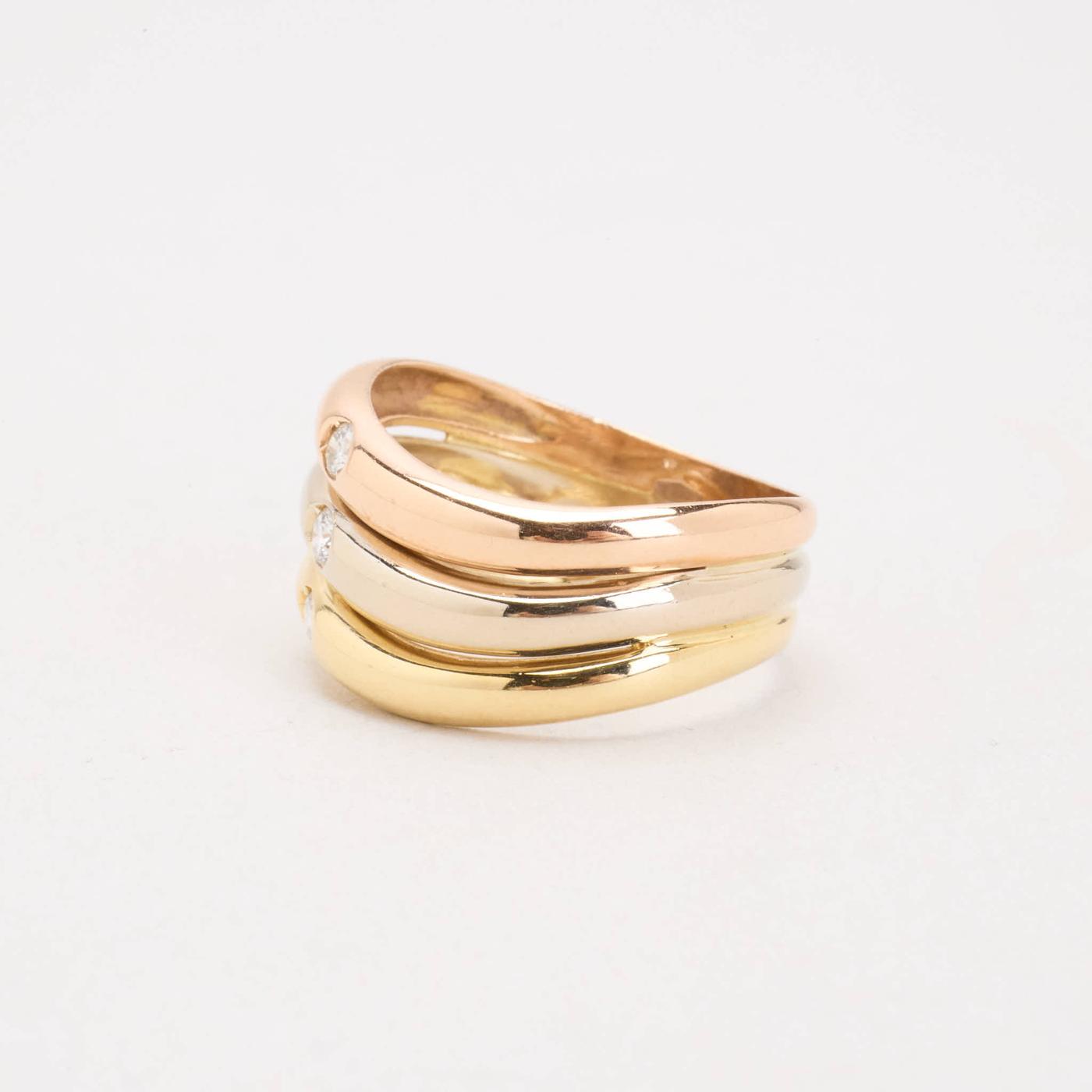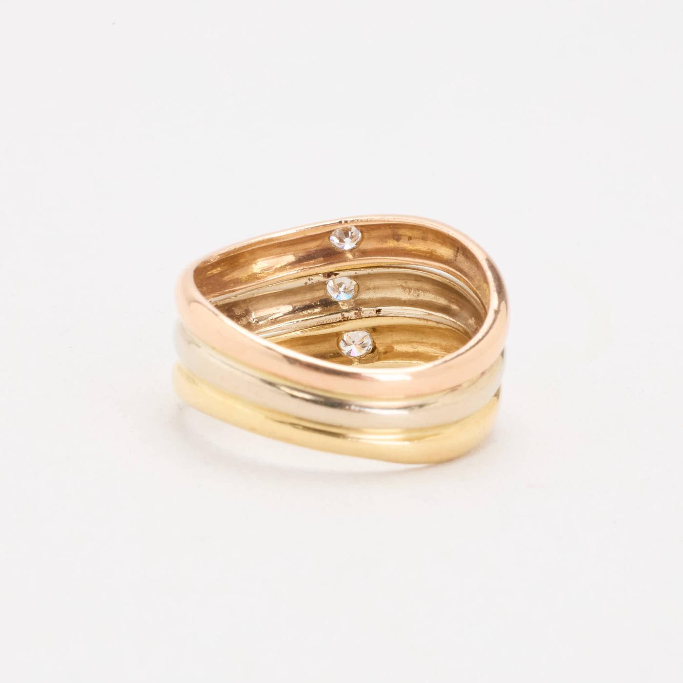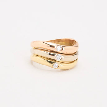 Tre i en ring med diamant (0.08 ct) i 14K guld, hvidguld og rosaguld str. 54, 4.76 g